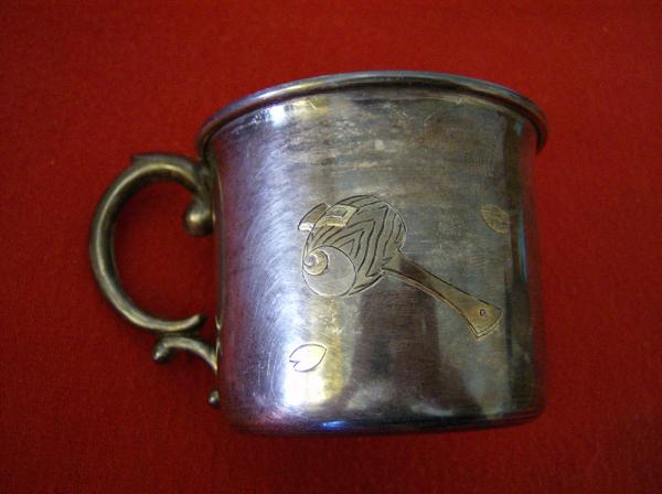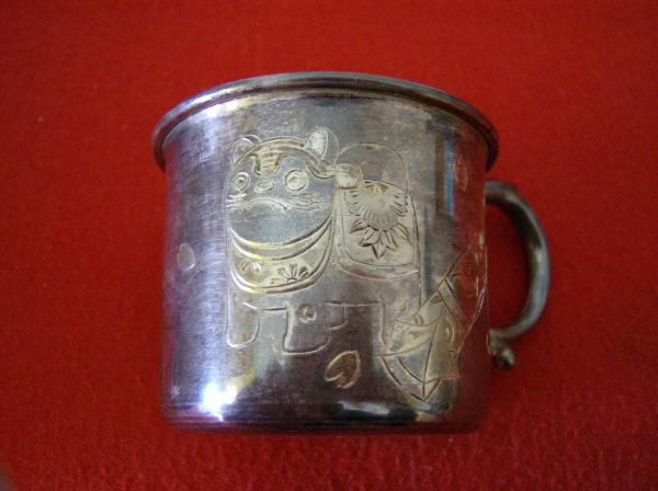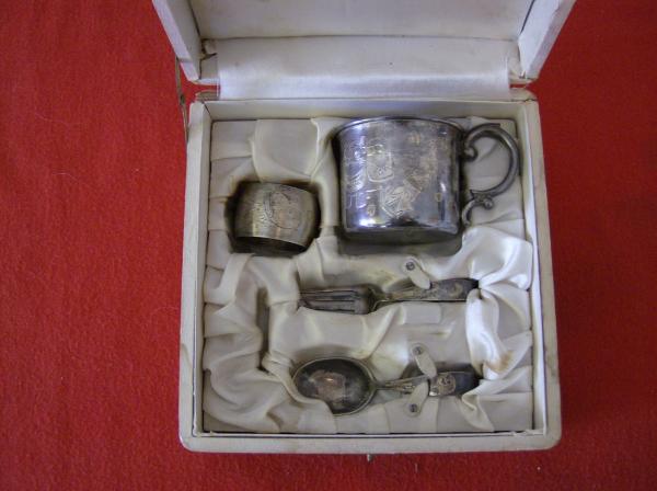 baby feeding set spoon fork cup and napkin ring in silk lined wooden box