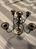 antique silver candlestick/ candelabra of an armored man holding what it look like a flower that turns into a single candle holder, it has three legs that resemble a bird maybe an eagle claw holding a ball. the top part ataches to the bottom turning it in a 2 candle holder, lots of detail there are flowers and spitting (dragons/snakes) and in the middle on top a smaller manwearing a hat with a feather on top. there are some markings on the bottom shown on the picture.