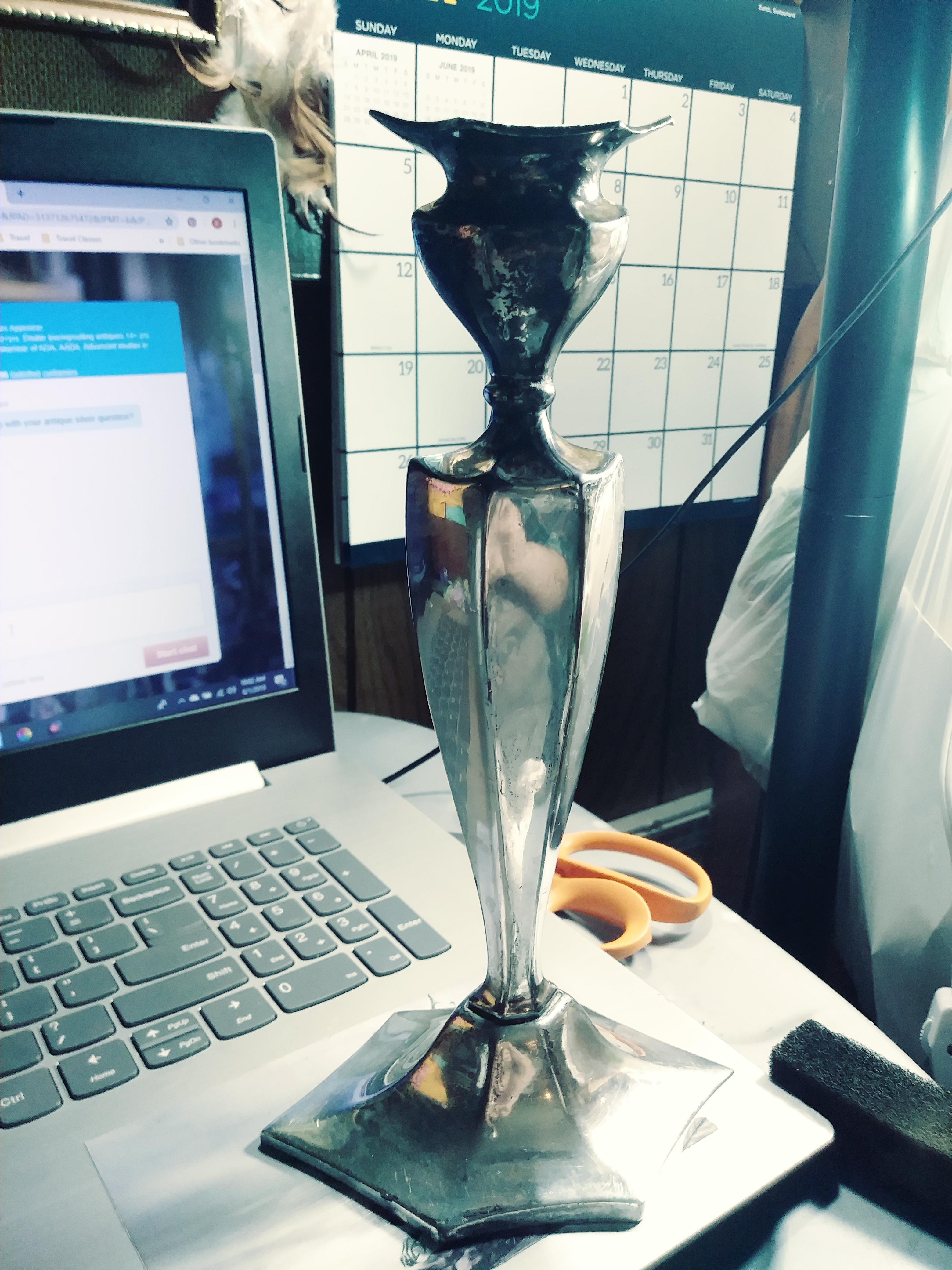 Antique 1920's Silver Candlesticks with fluted bottom. Metal marke 3P or BP 2432, Still in the process of cleaning up. A bit of overlay is missing on one candle stick, thanks to the thrift shop not knowing what they were doing and put a sticker on it.