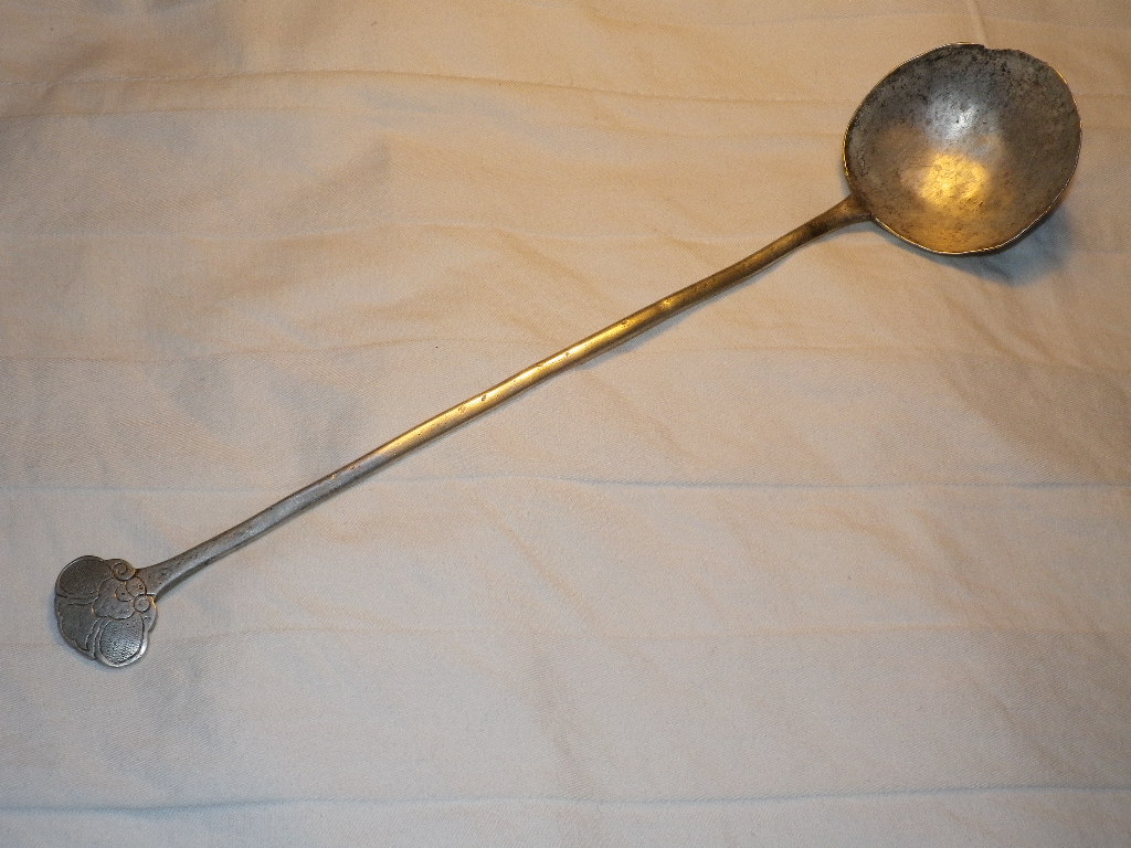 I got this spoon while in China recently. It's 8.5 inches long, including the 2" bowl...shaft seems slightly offset from center of bowl... Virtually certain it's made of silver. But mainly what I need to know is what the stamped Chinese characters mean on the back. I have done some research and asked Chinese friends to no avail. Value would be nice, but mainly trying to find out anything I can about it ie. can the characters be matched to a maker or time period? Thanks!