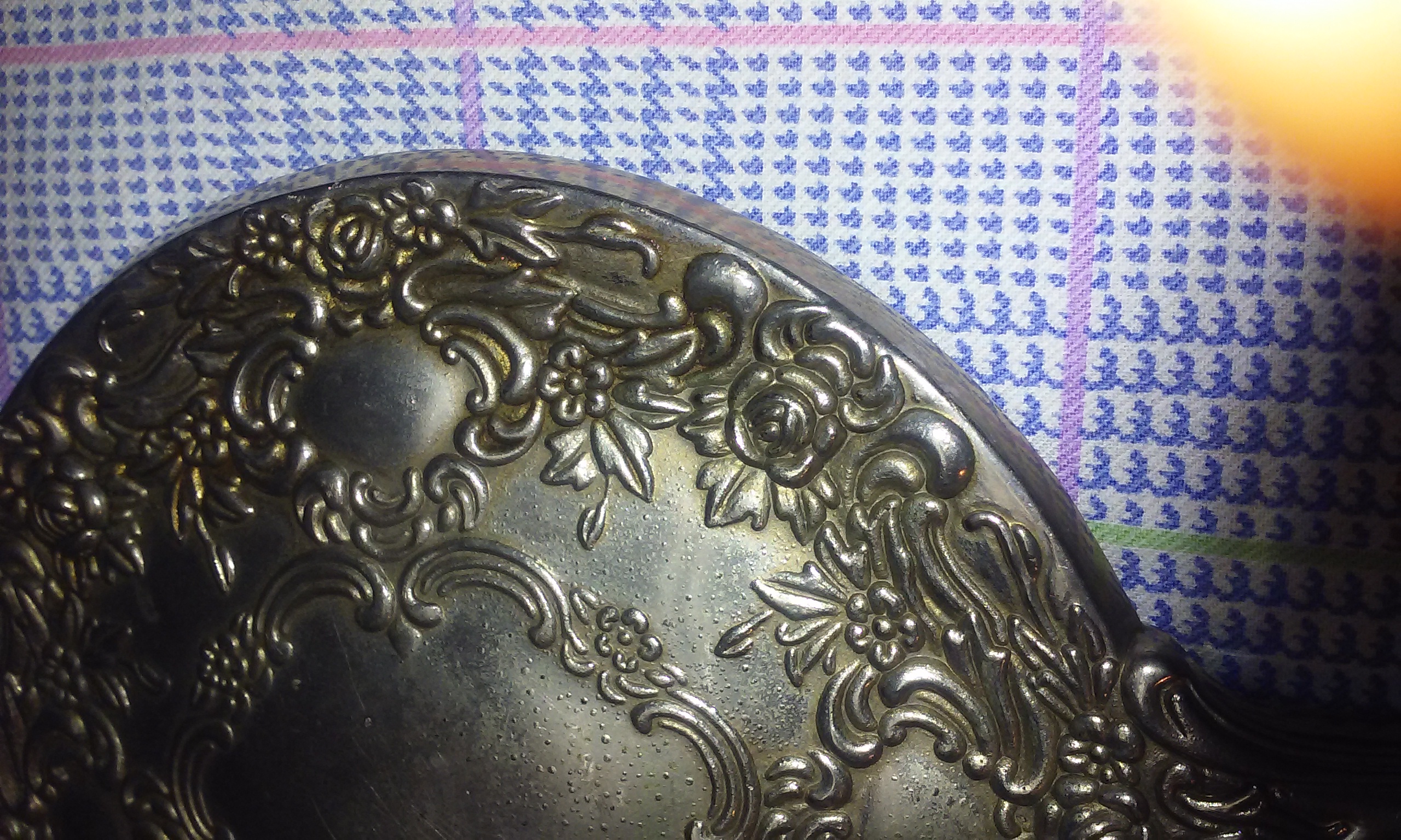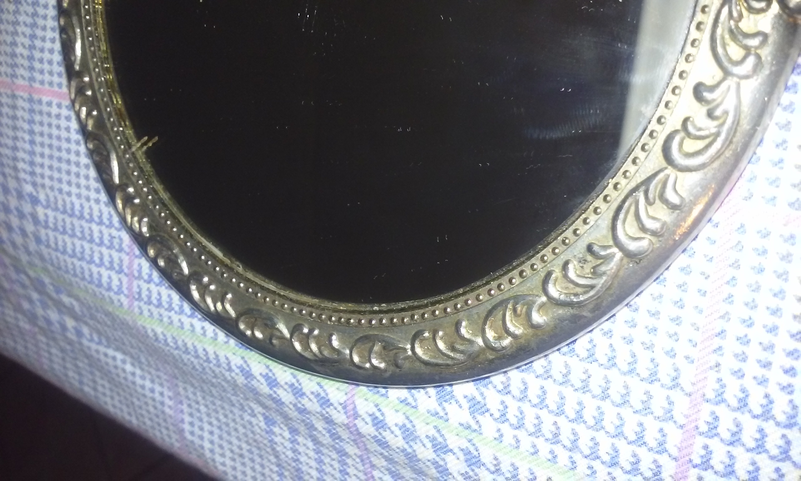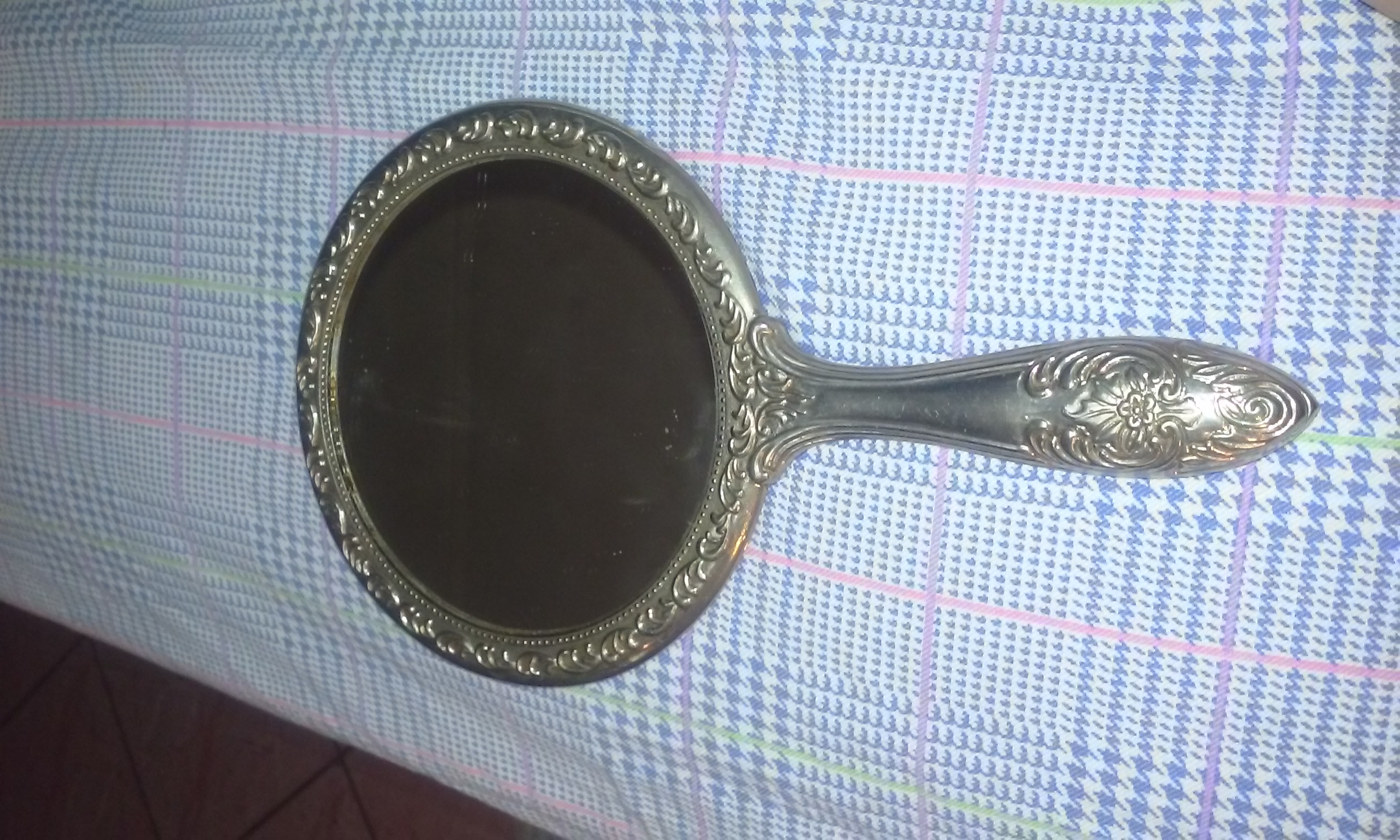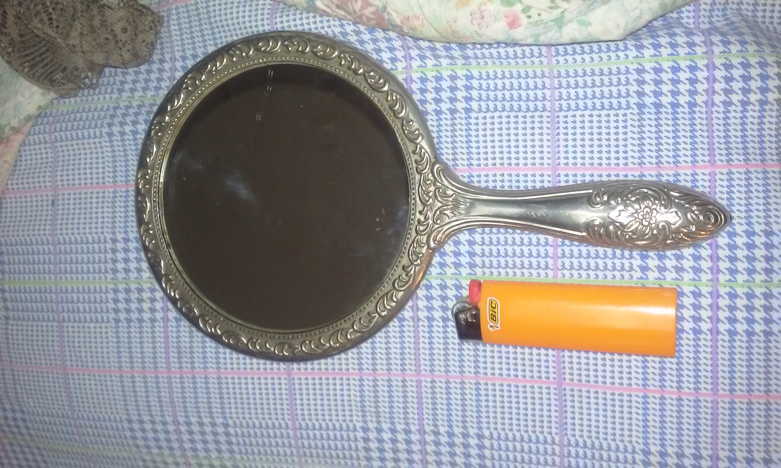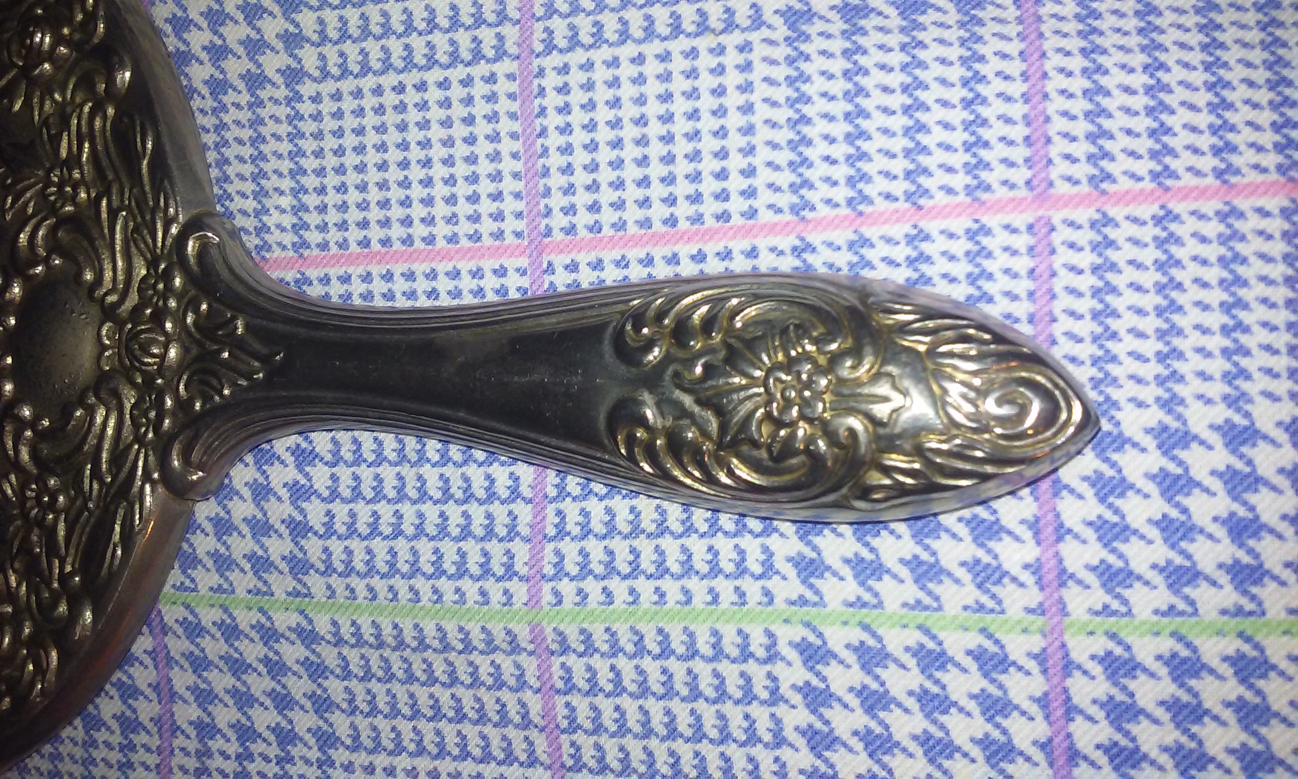 It's an old fashion hand mirrors with flower decor all over it. I have no idea if it's silver plated or sterling silver but it has no marks on it. There's no name or initials nor anything in that sort. Also I don't know exactly how much it weights but its pretty heavy for its size. It's not all banged up or scratched, its in good condition.