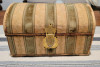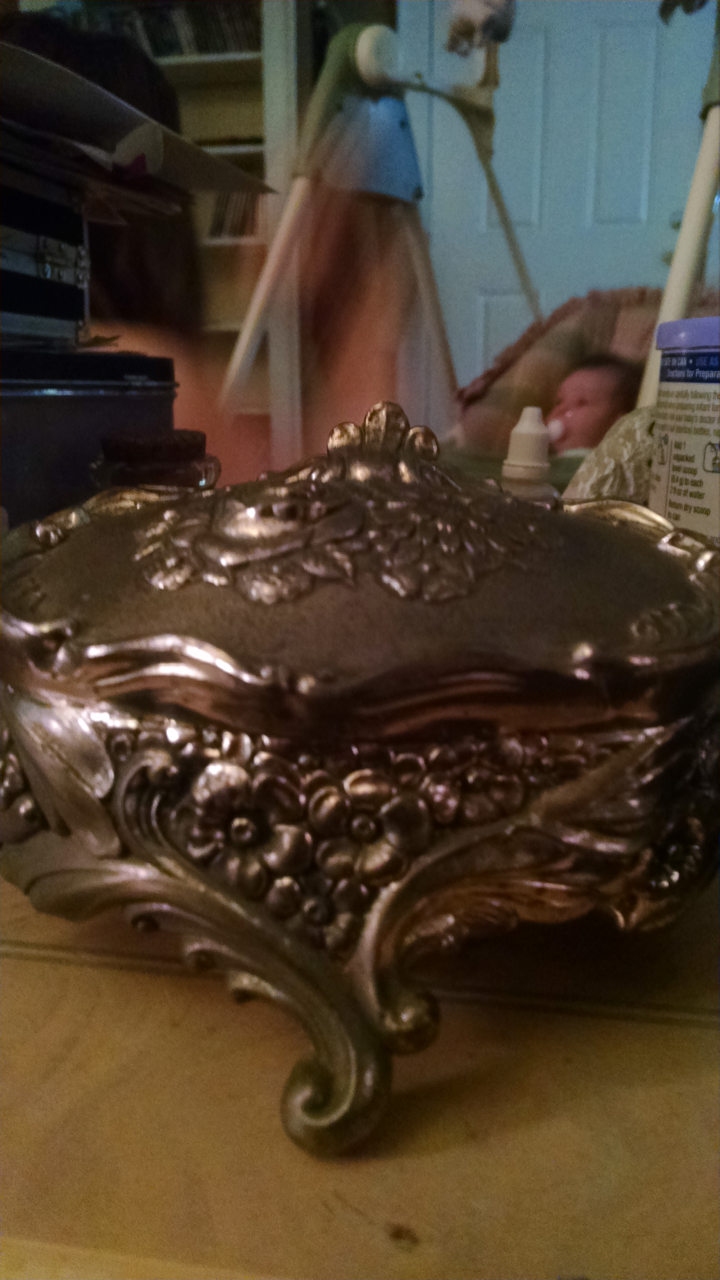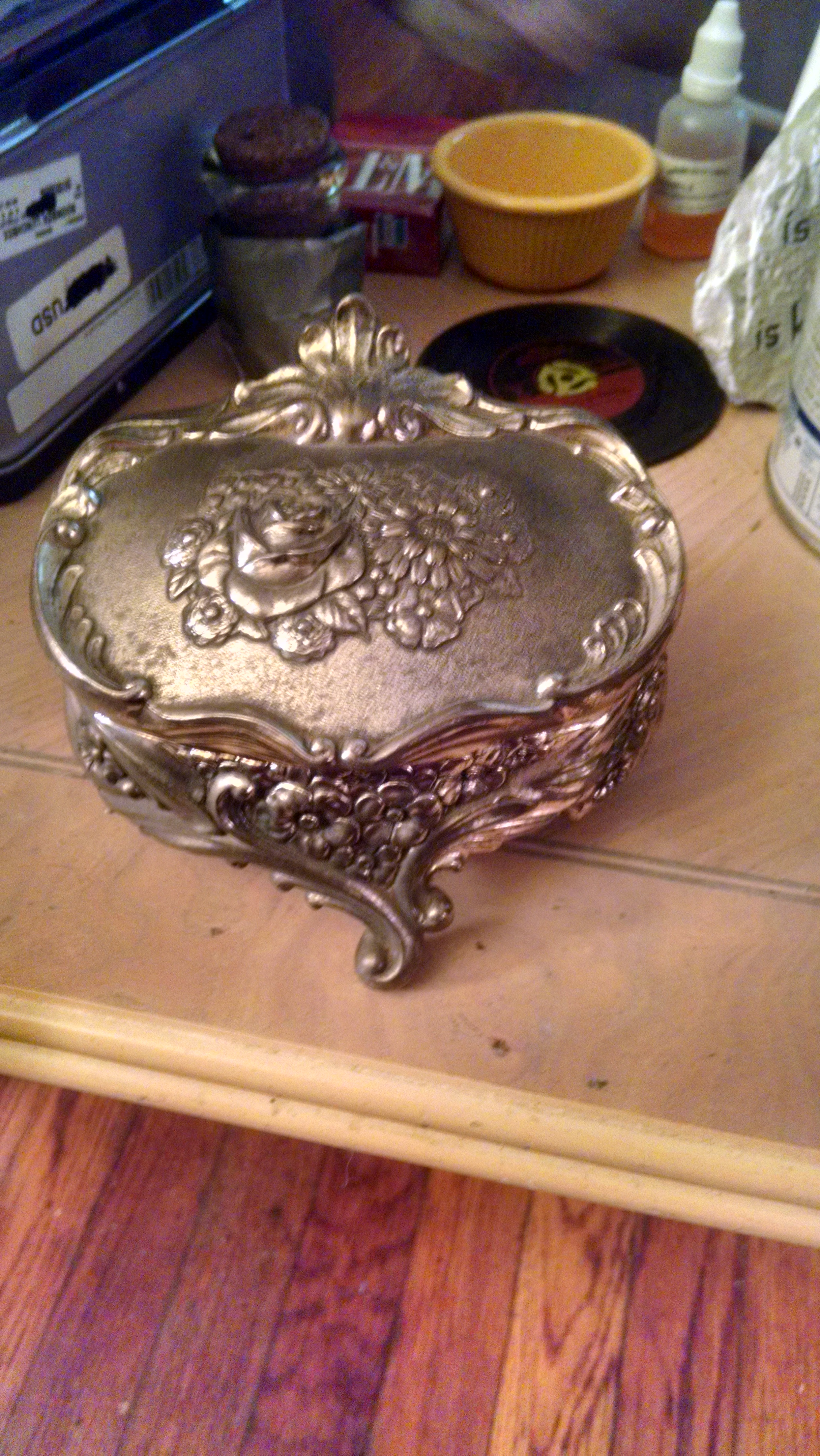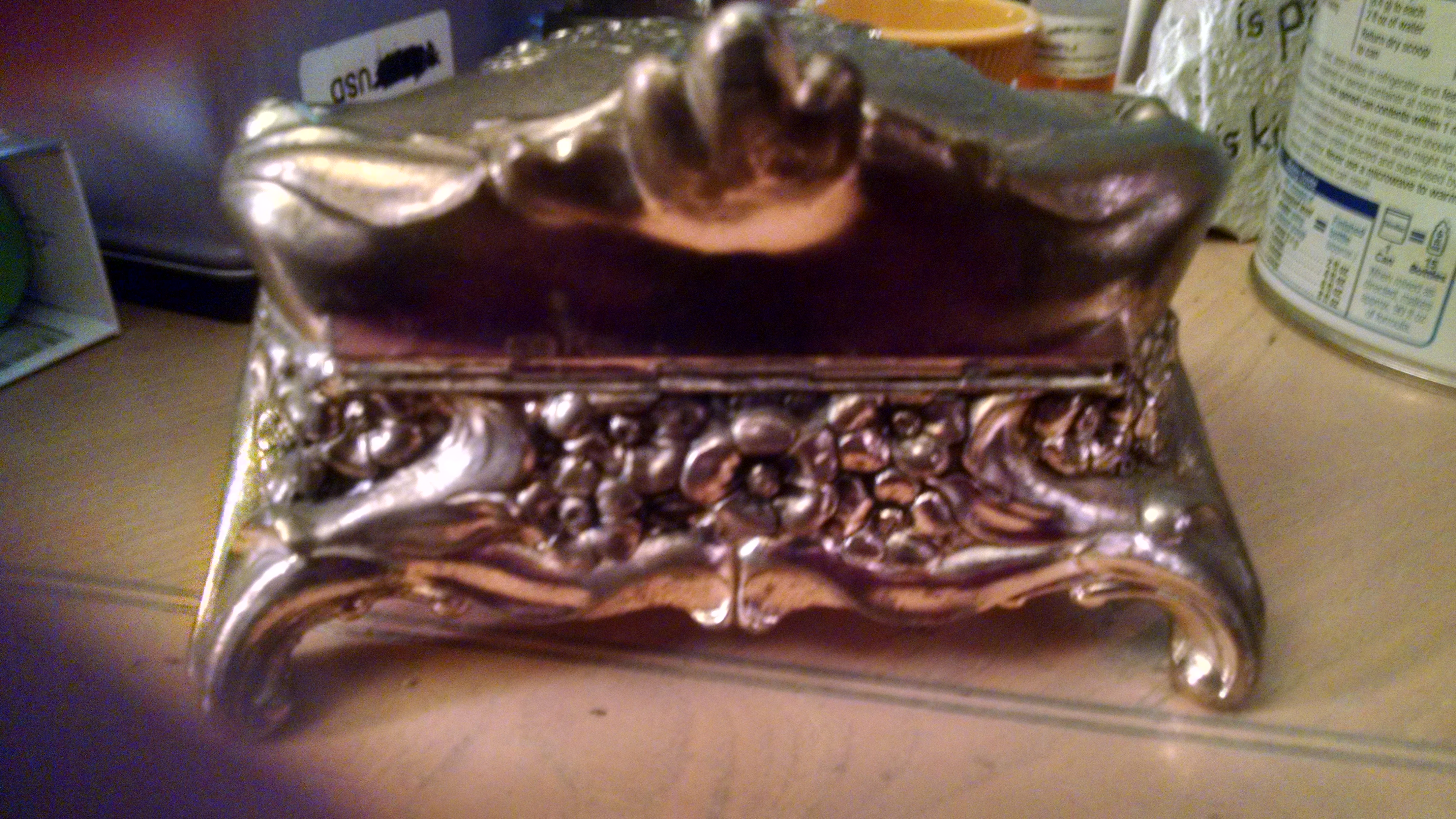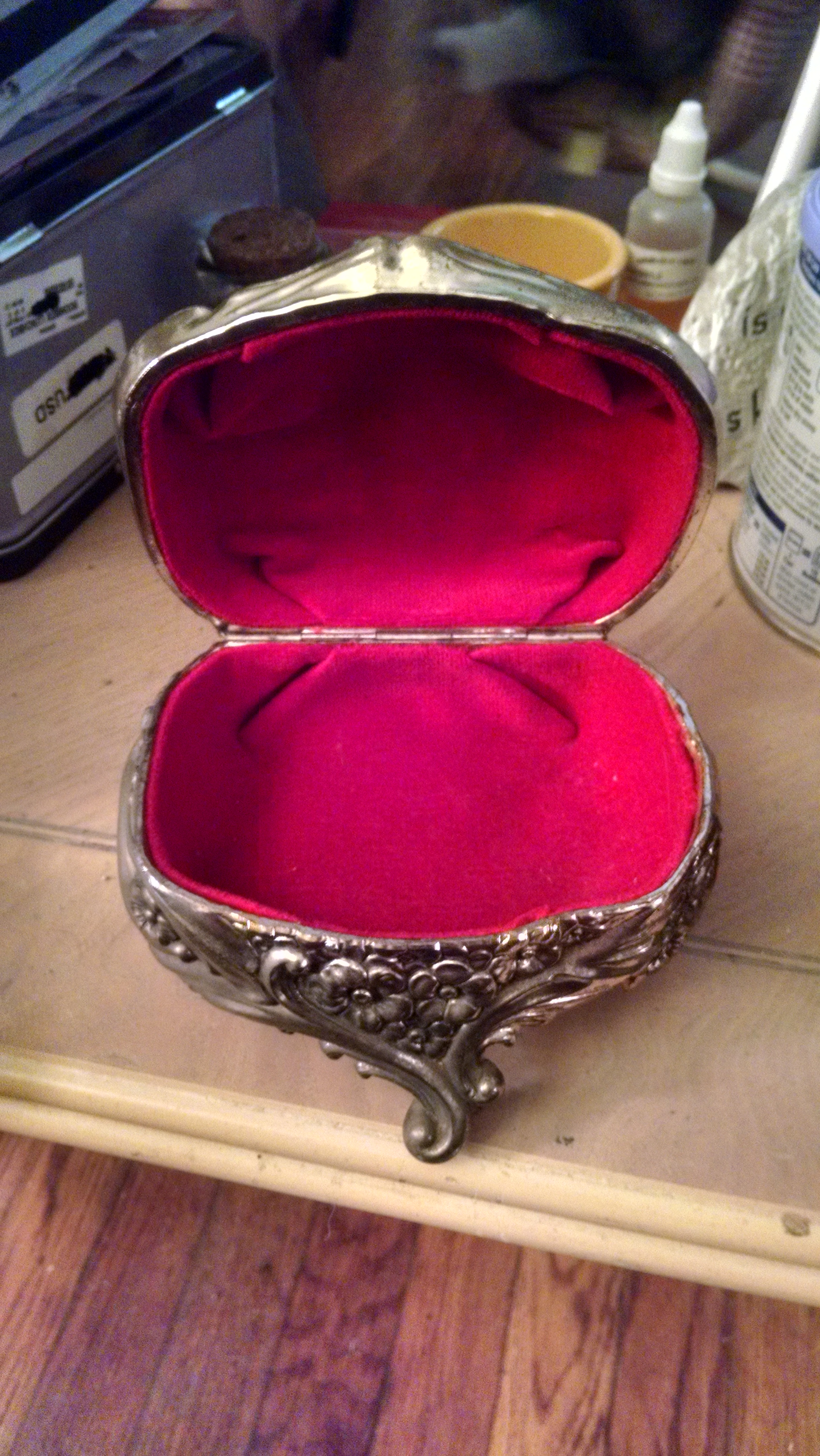 Roughly 5in wide, 4in tall, and 4in deep. Silver jewelry box with red velvet lining. Perfect shape. Working hinges, 3 legs, floral design. Stamped "foreign" on bottom.