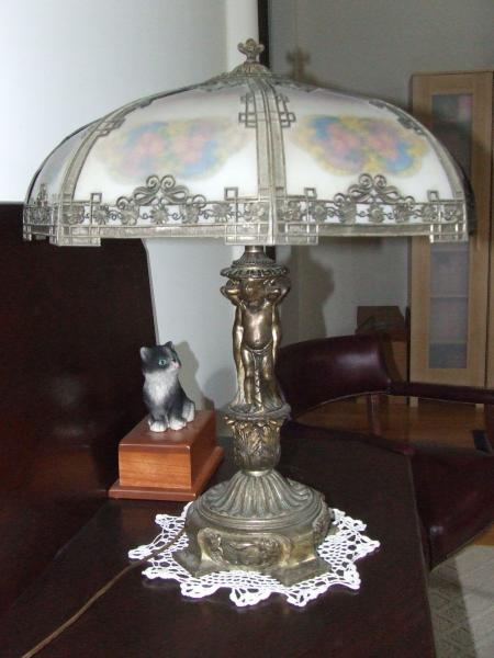 Silver base with 3 cupid like babies, large glass dome in several pieces that are painted from the inside. Lamp still lights.