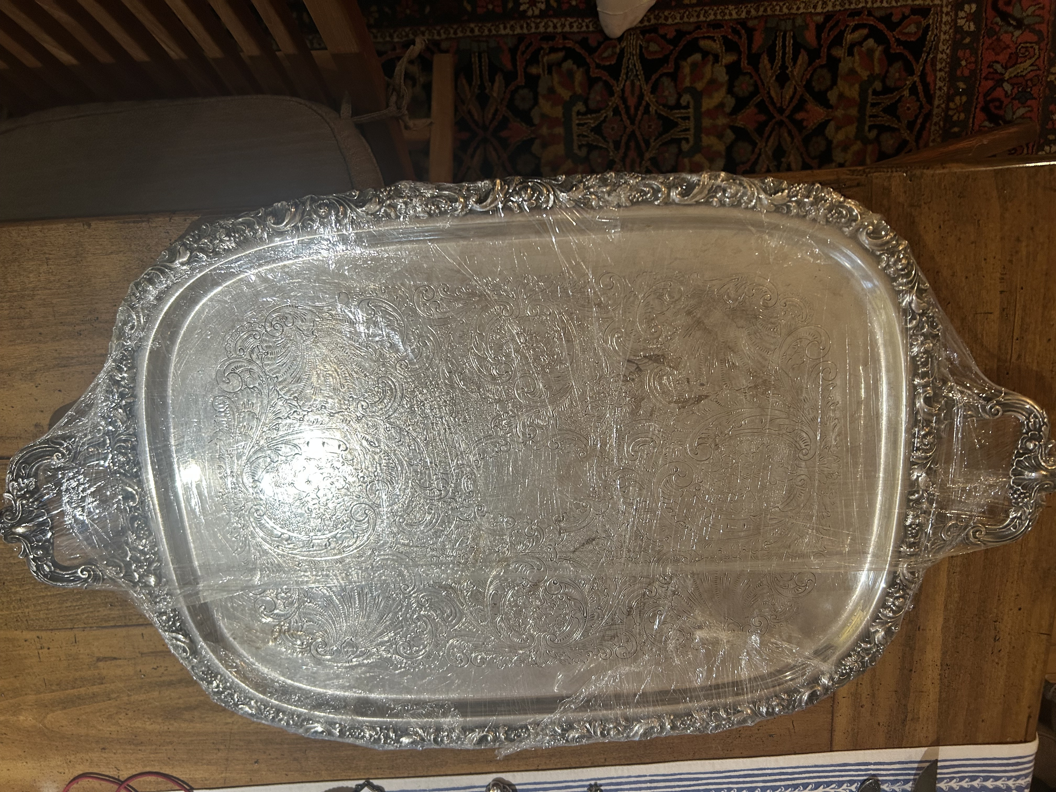 Physical Description: This antique silver serving tray measures approximately 14 1/2 inches by 25 inches. It features an ornate design with intricate engravings and decorative handles, showcasing a classic aesthetic typical of fine silverware. The surface exhibits a polished finish, although some areas may show signs of tarnishing due to age.