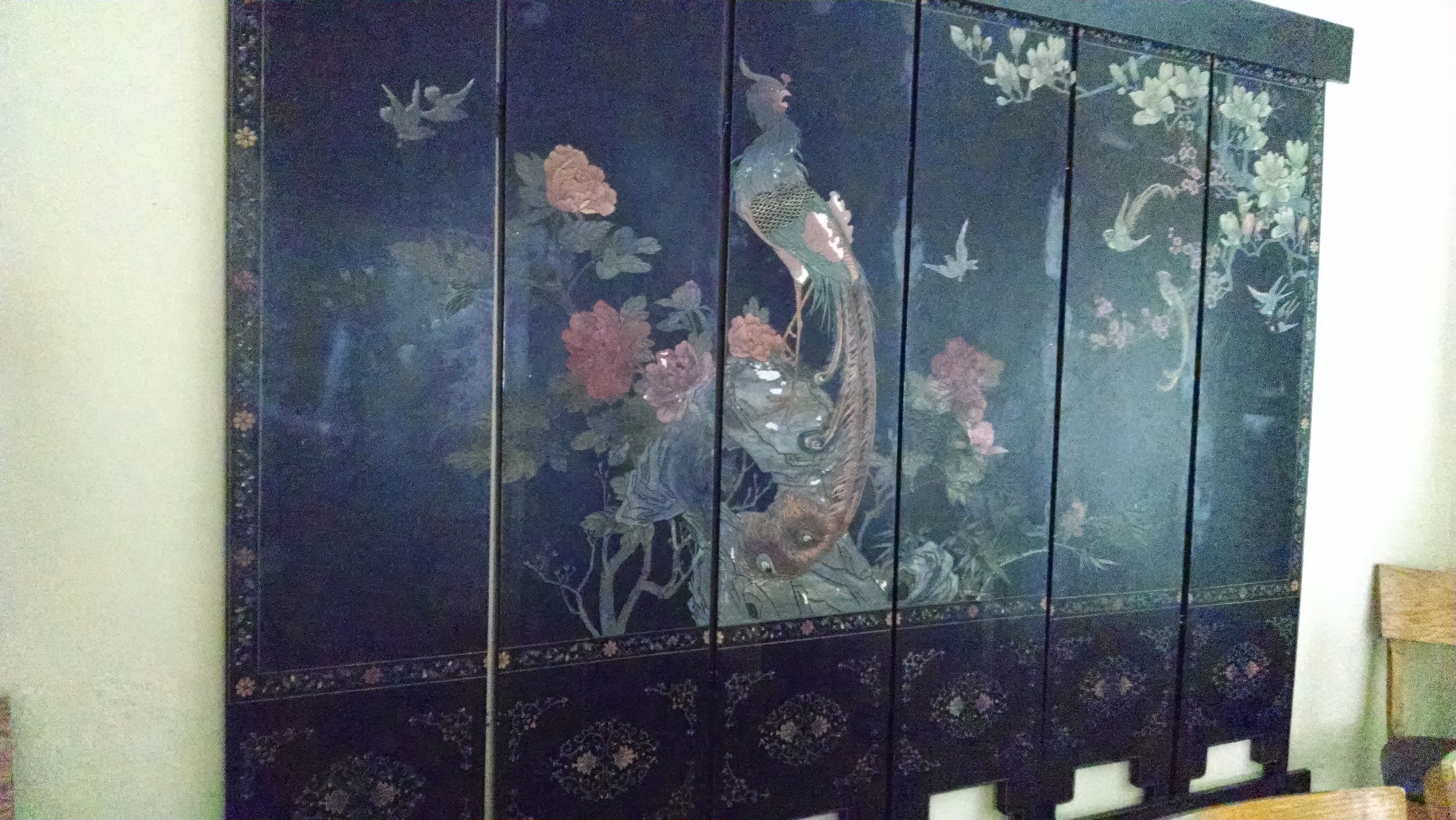 This antique screen room divider is double sided and has all of the hardware. It is currently mounted on the wall using two boards so that it is actually not hanging on the wall and no holes have been placed in the screen. One side has a peacock and if I remember correctly the other side has cherry blossoms. It is hand carved. It is not in perfect condition but it is in very good condition.