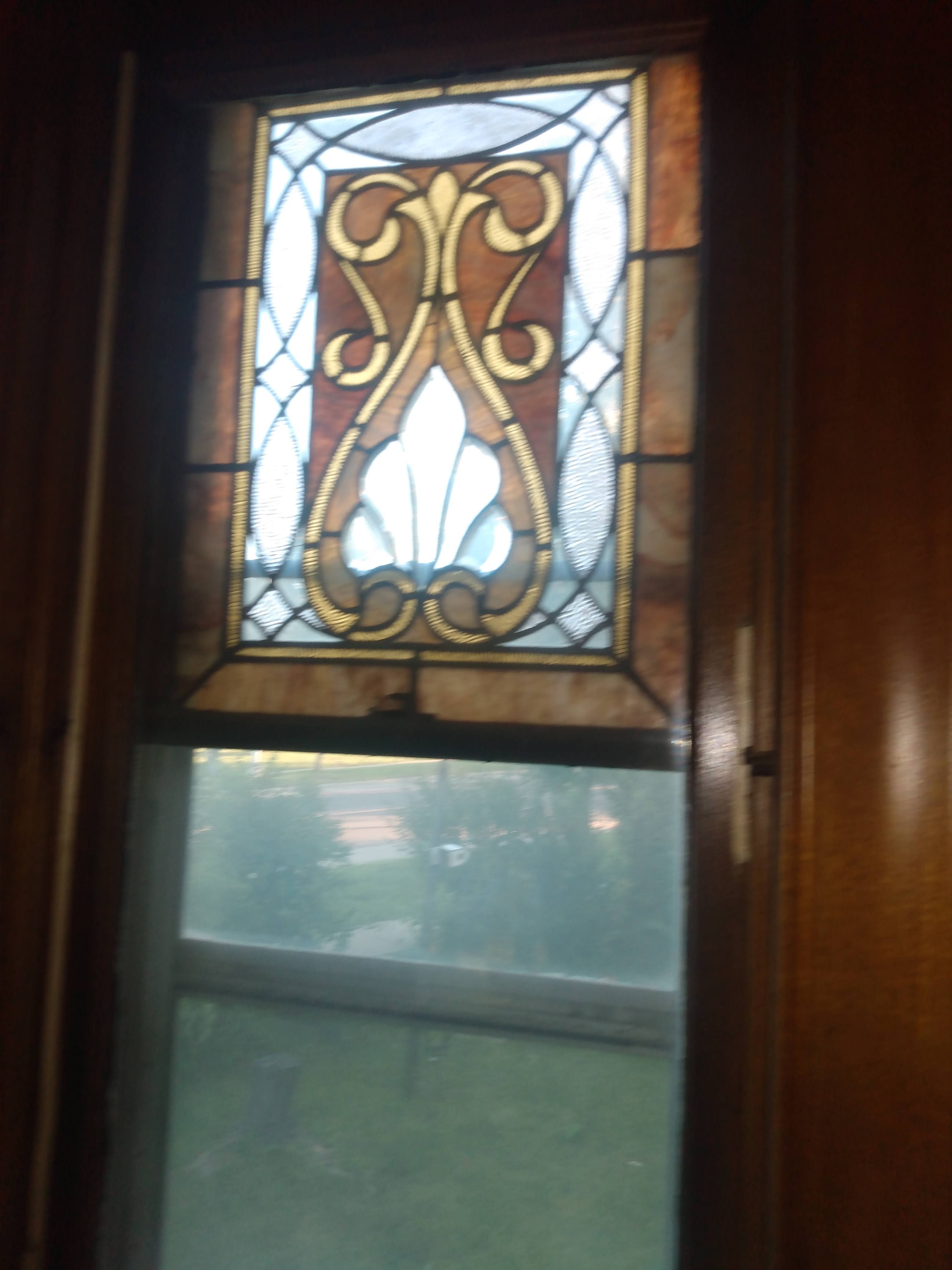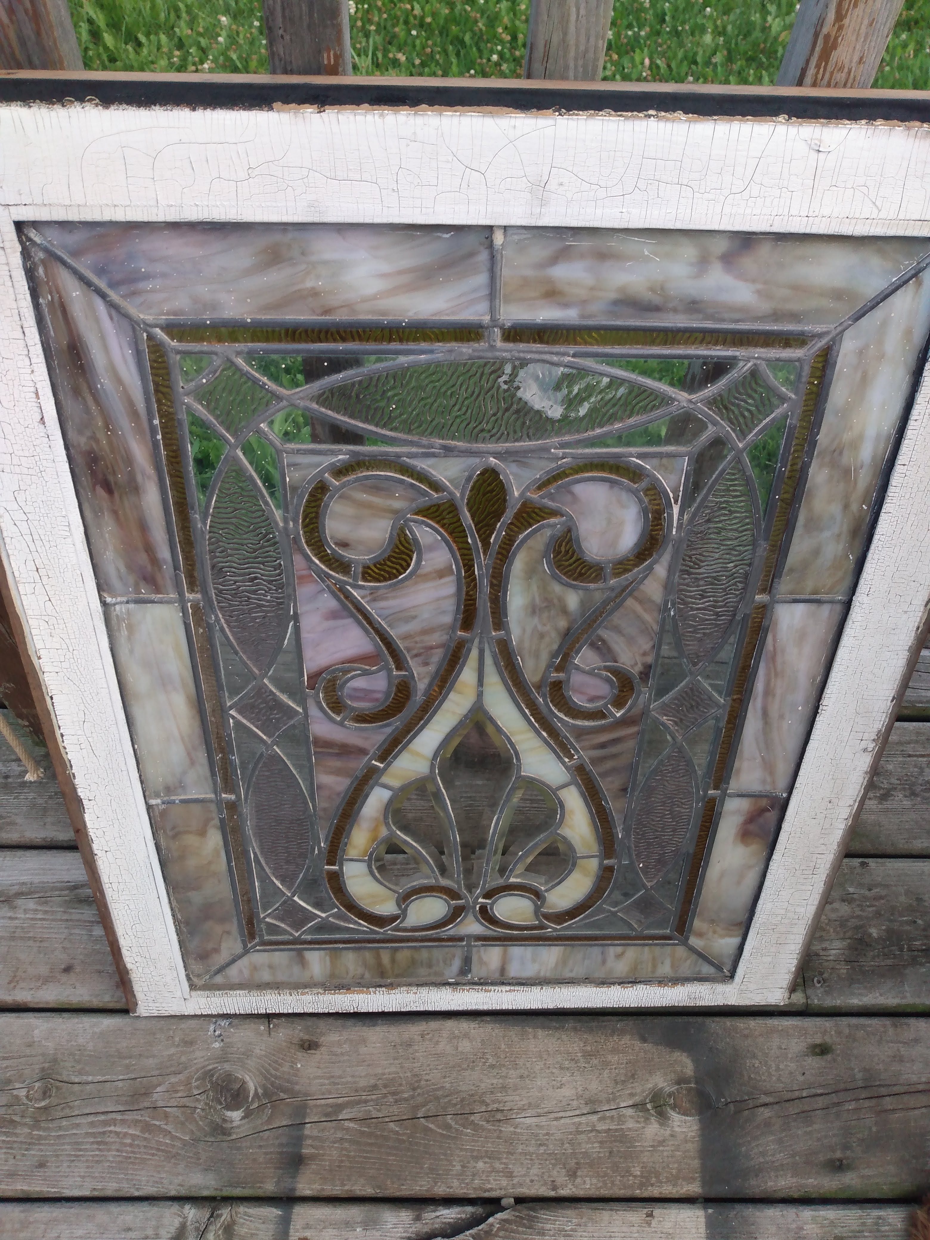 This window was salvaged from a home built in 1897. It is one of three matching windows. I believe it is leaded slag glass. There are some cracks in it.