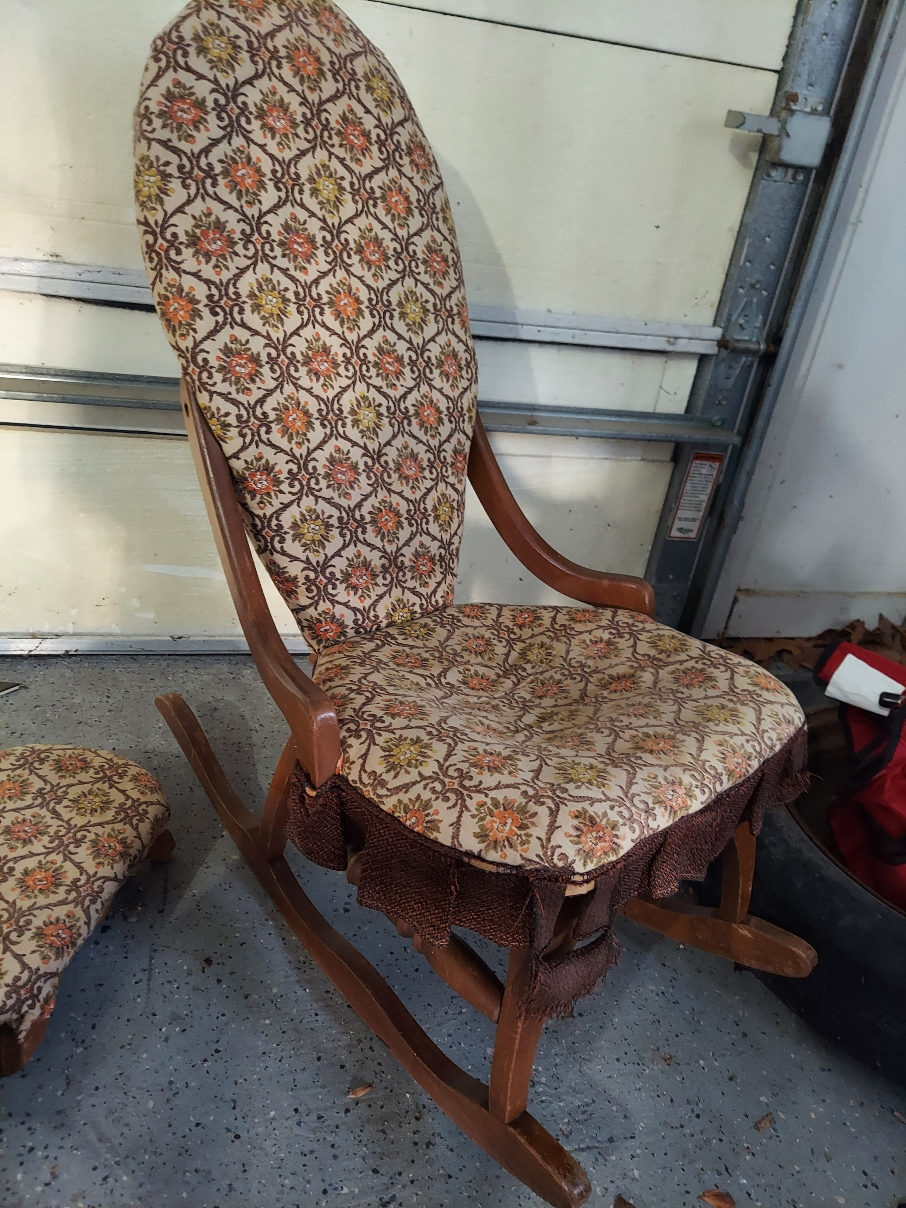This antique slipper rocking chair features a classic design that combines comfort and elegance. The chair is upholstered with a floral-patterned fabric, showcasing a rich color palette of browns, oranges, and yellows, which is characteristic of mid-20th-century design trends.