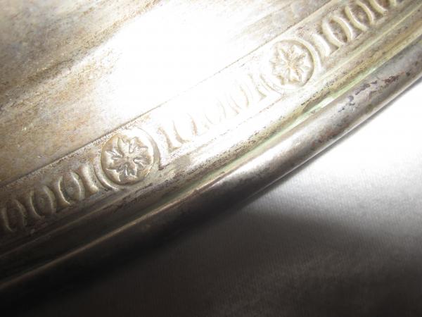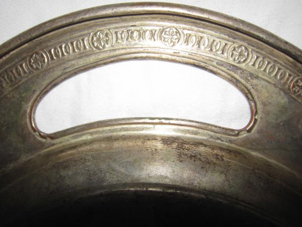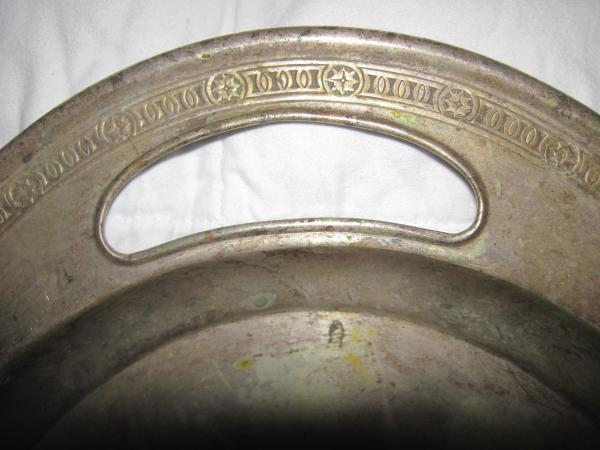 Silver tray with no hallmark. '1627' is etched into back. Believe it is copper plated with silver but not sure. It is not magnetic.