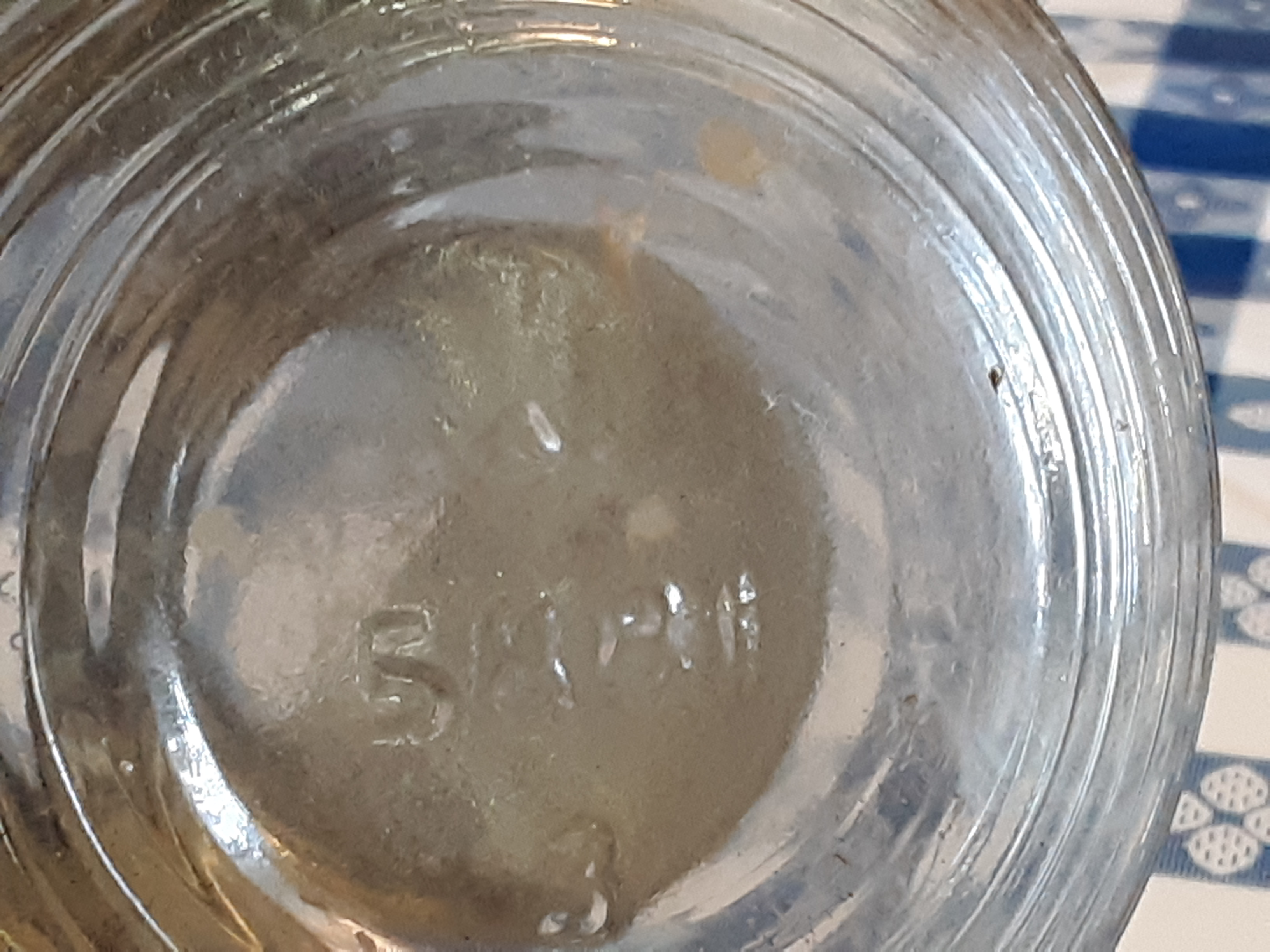 Found this bottle in my mother's things after her death. It is a small round rather squat bottle with a raised ring and raised triangle and dot design. The lid is screw on and metal with a hole in it possibly for a dispenser. It has the number 5881 on the bottom and a small raised round spot.