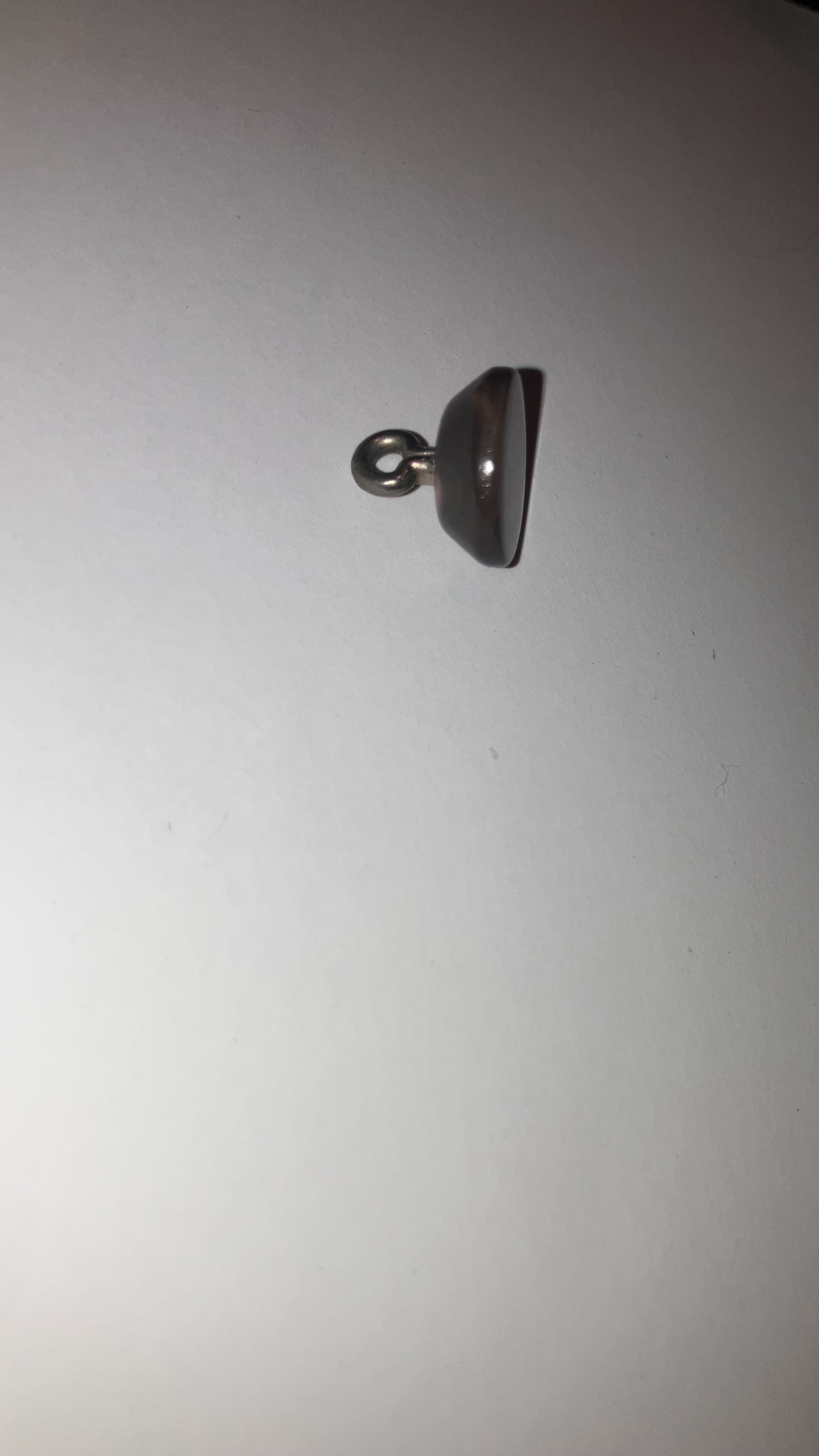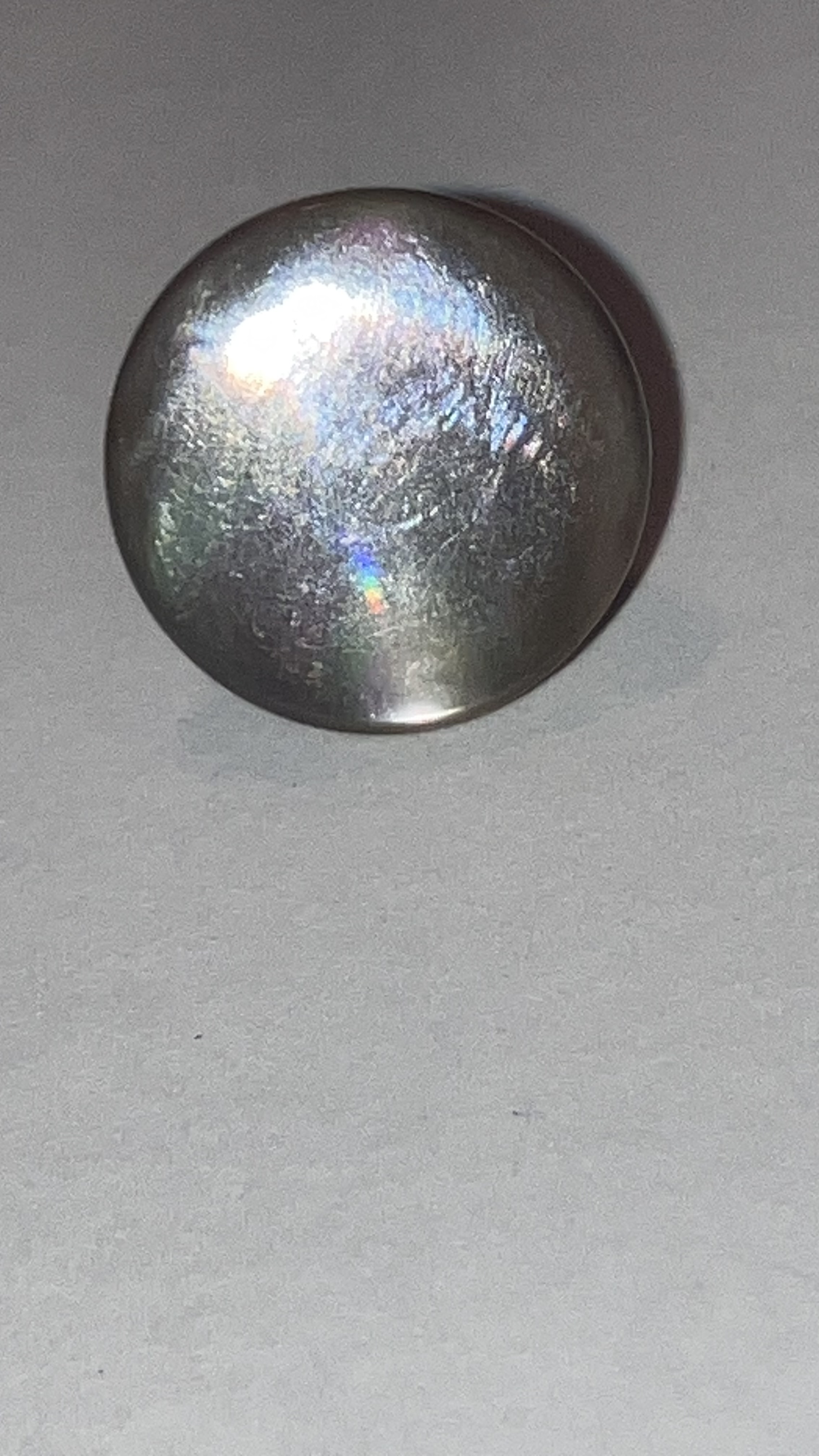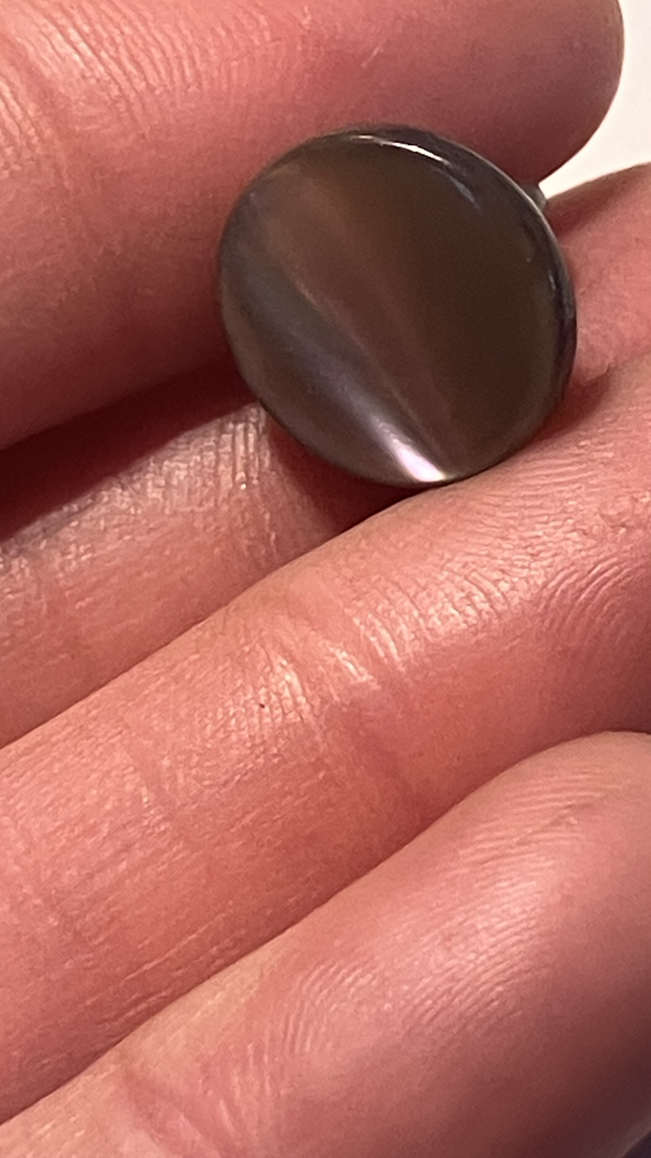 Physical Description: This antique button features a smokey abalone shell with a shank style design. The button has a thick tapered metal loop shank, which is typical for buttons of this type. The surface exhibits a beautiful iridescent quality, showcasing the natural variations in color and sheen characteristic of abalone. The dimensions are approximately 1 inch in diameter, making it a medium-sized button suitable for various applications.