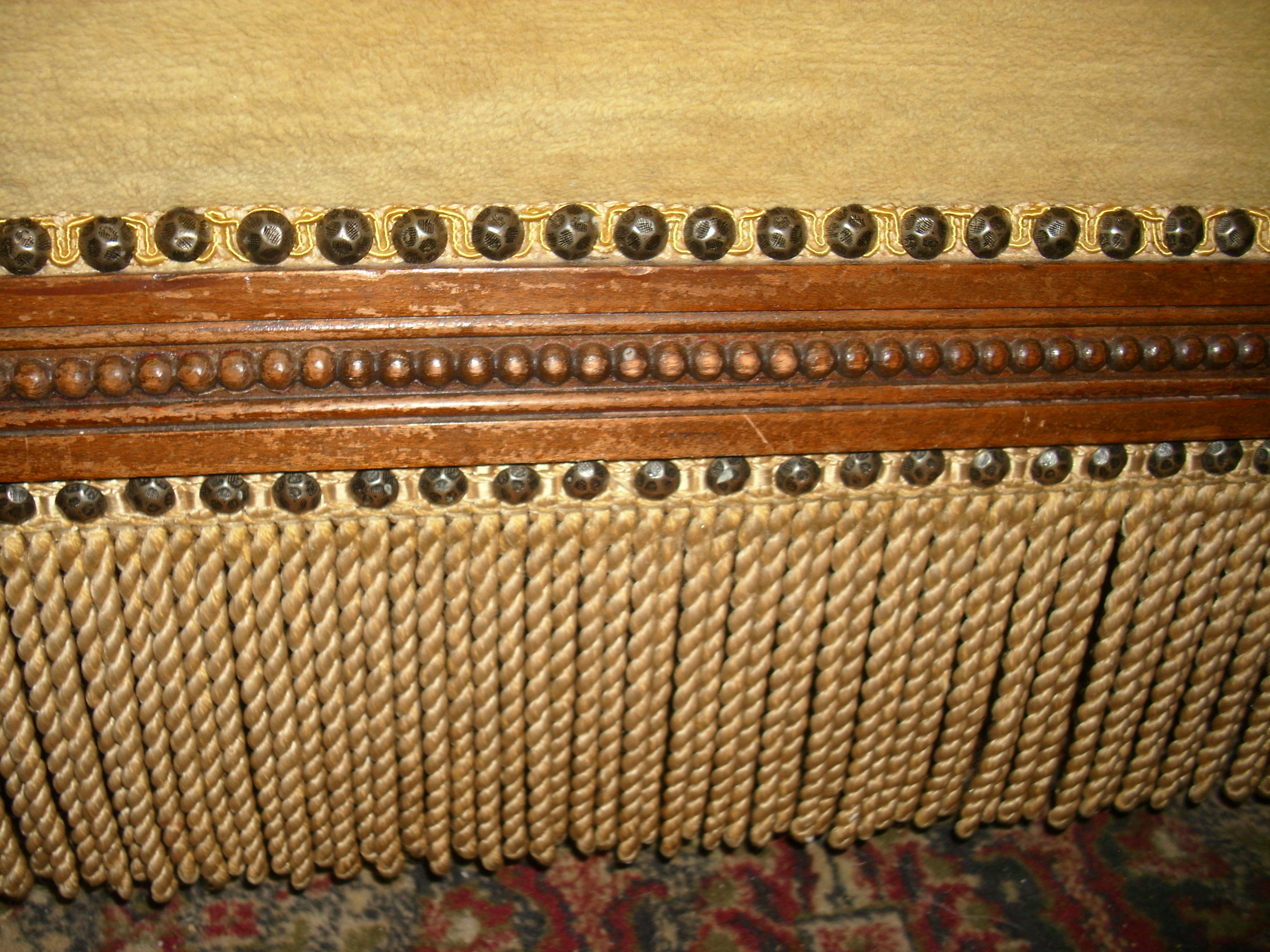 It is upholstered, nailhead trim around tasteful buttery gold fabric, piping around the cushions. I am sure this fabric is not origional as the sofa has matching cording around the bottom of the entire sofa, with the exception of the front legs that shows the craftsmanship of the woodwork.
