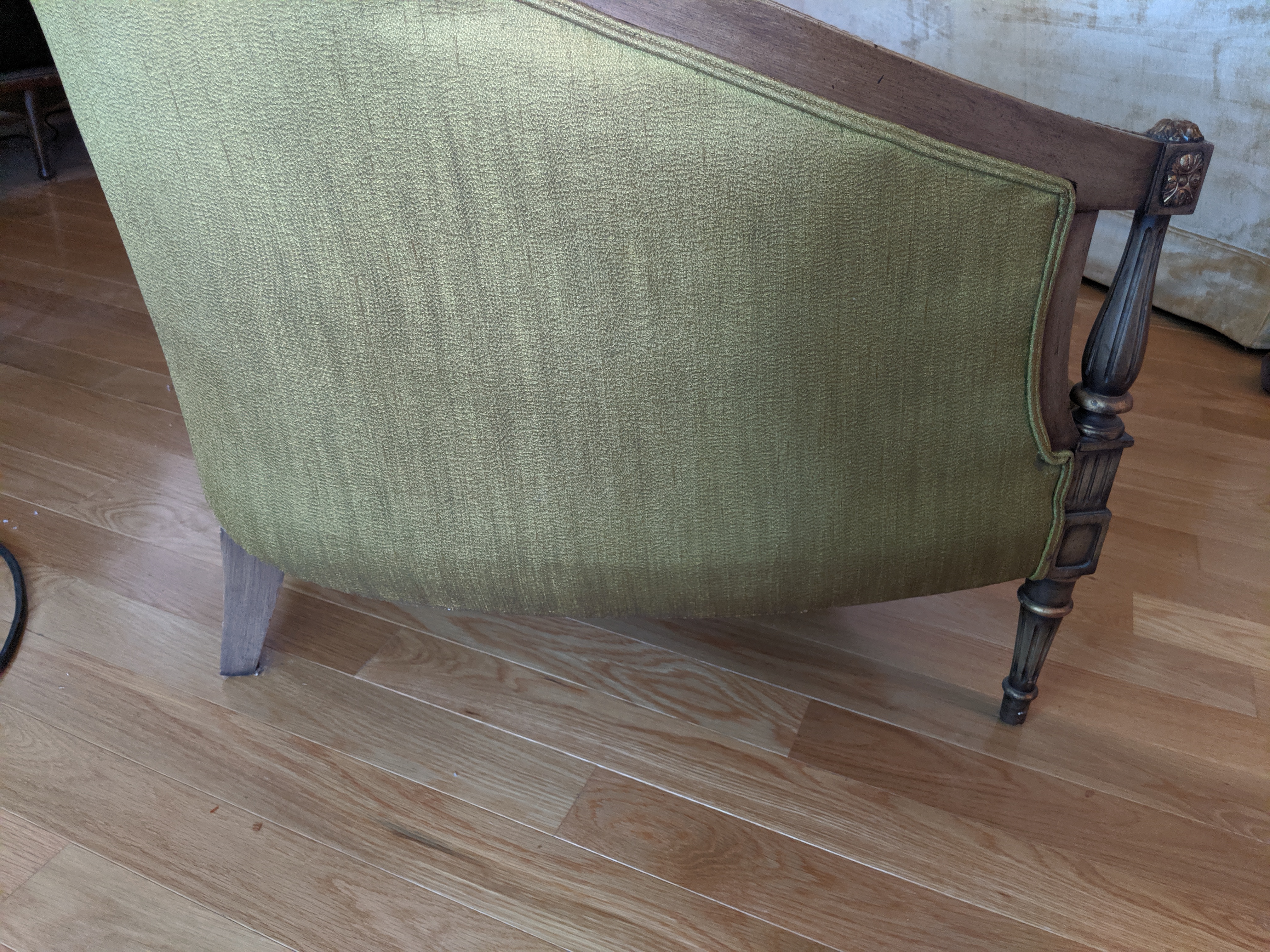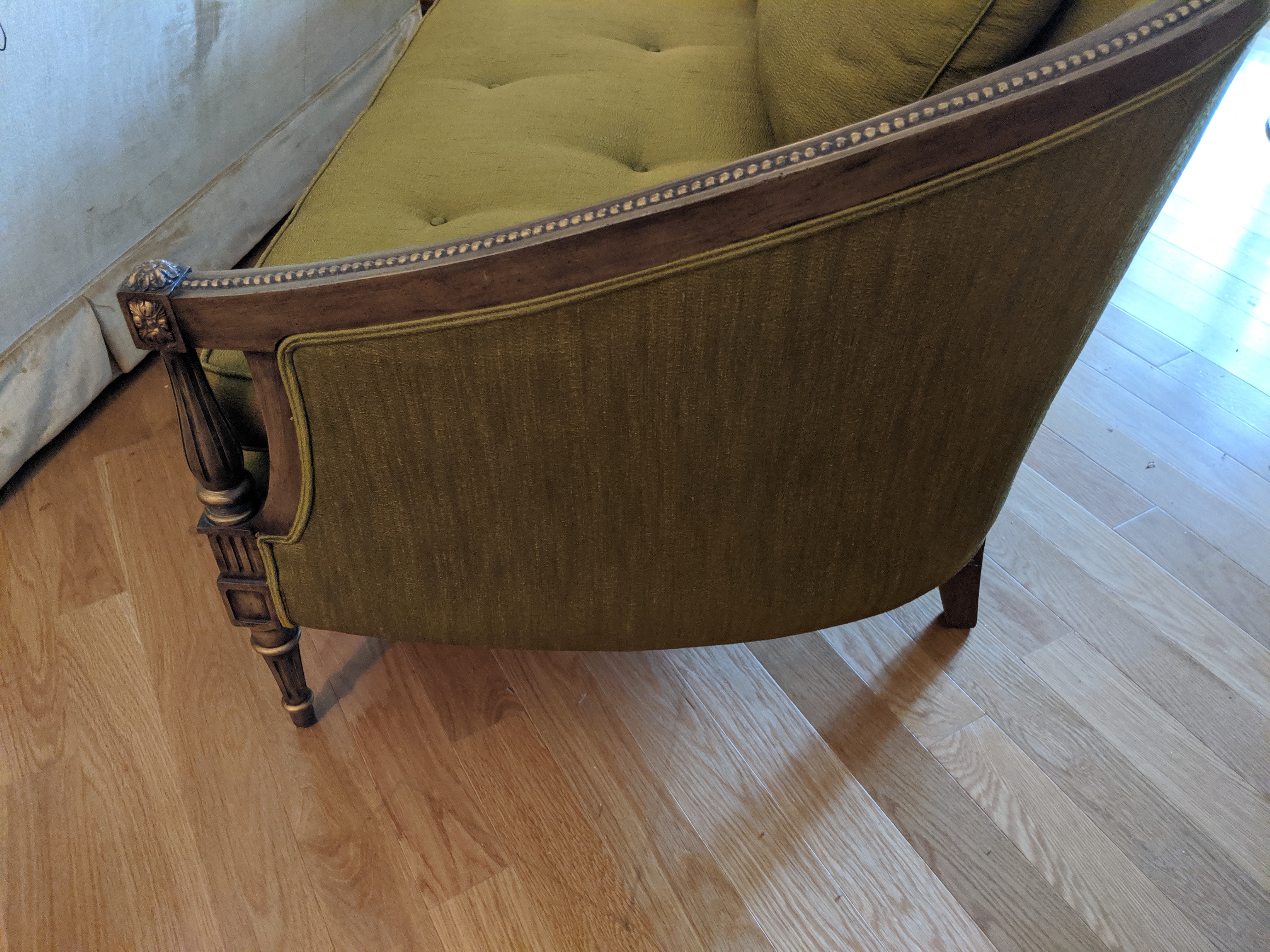 Antique Sofa made by J.B. Can Sciver Co. Sofa= 854 green Frame= 95. Patt= Eden Finish= 305 Reg. NO. PA. 20847. PER.NO. 294 This antique Sofa has beautiful woodwork and three sofa pillows. This sofa is in excellent condition.