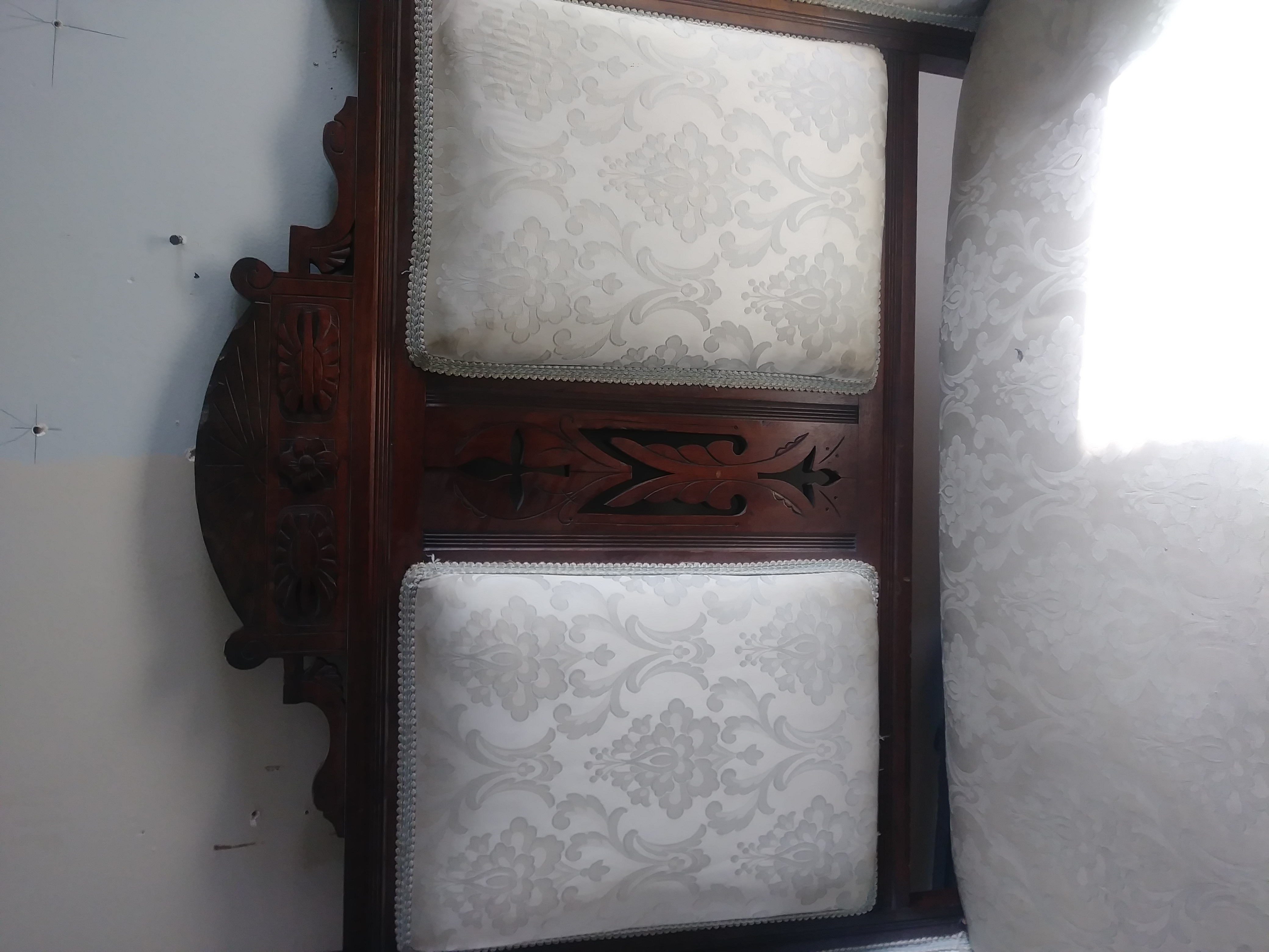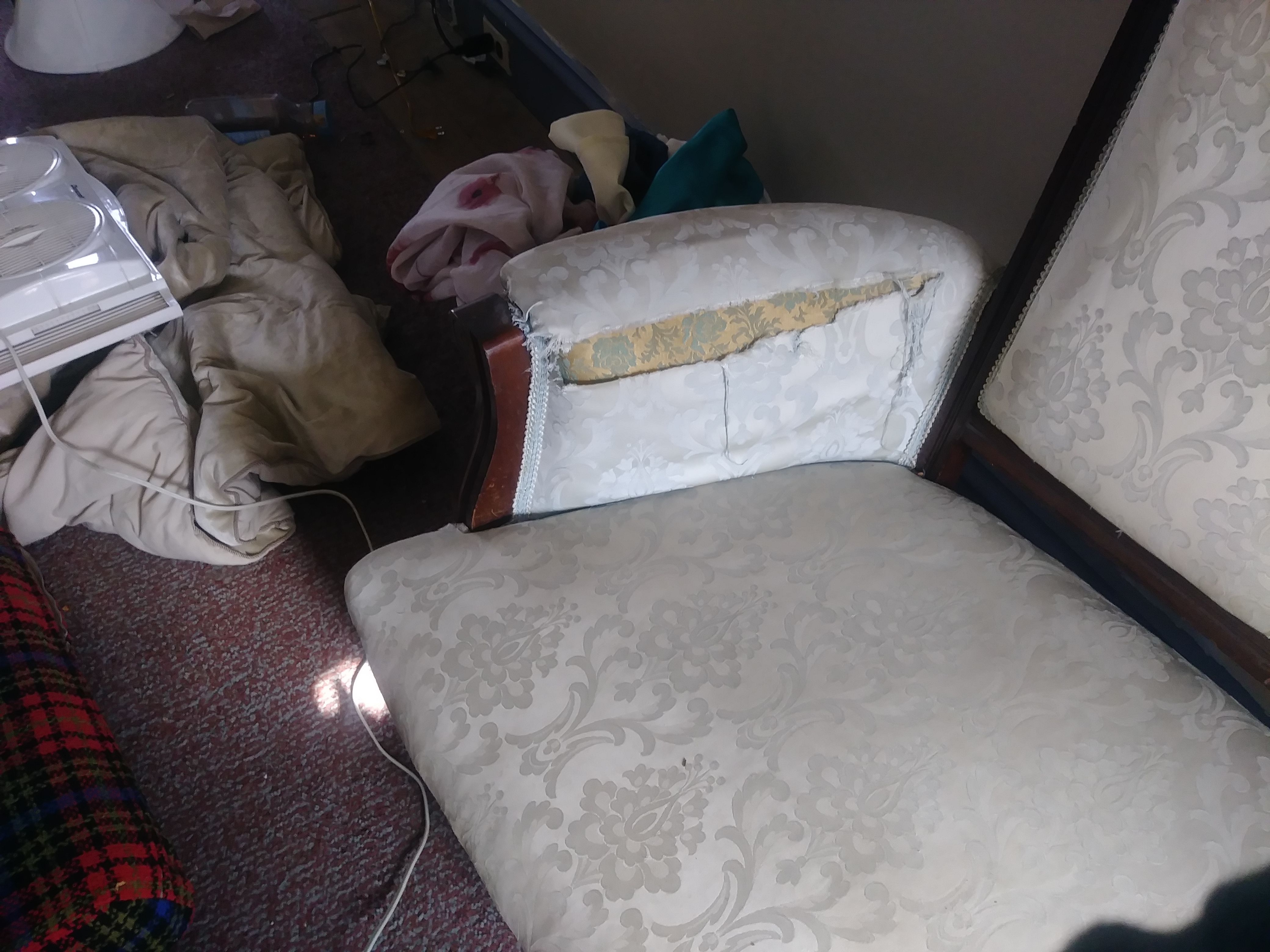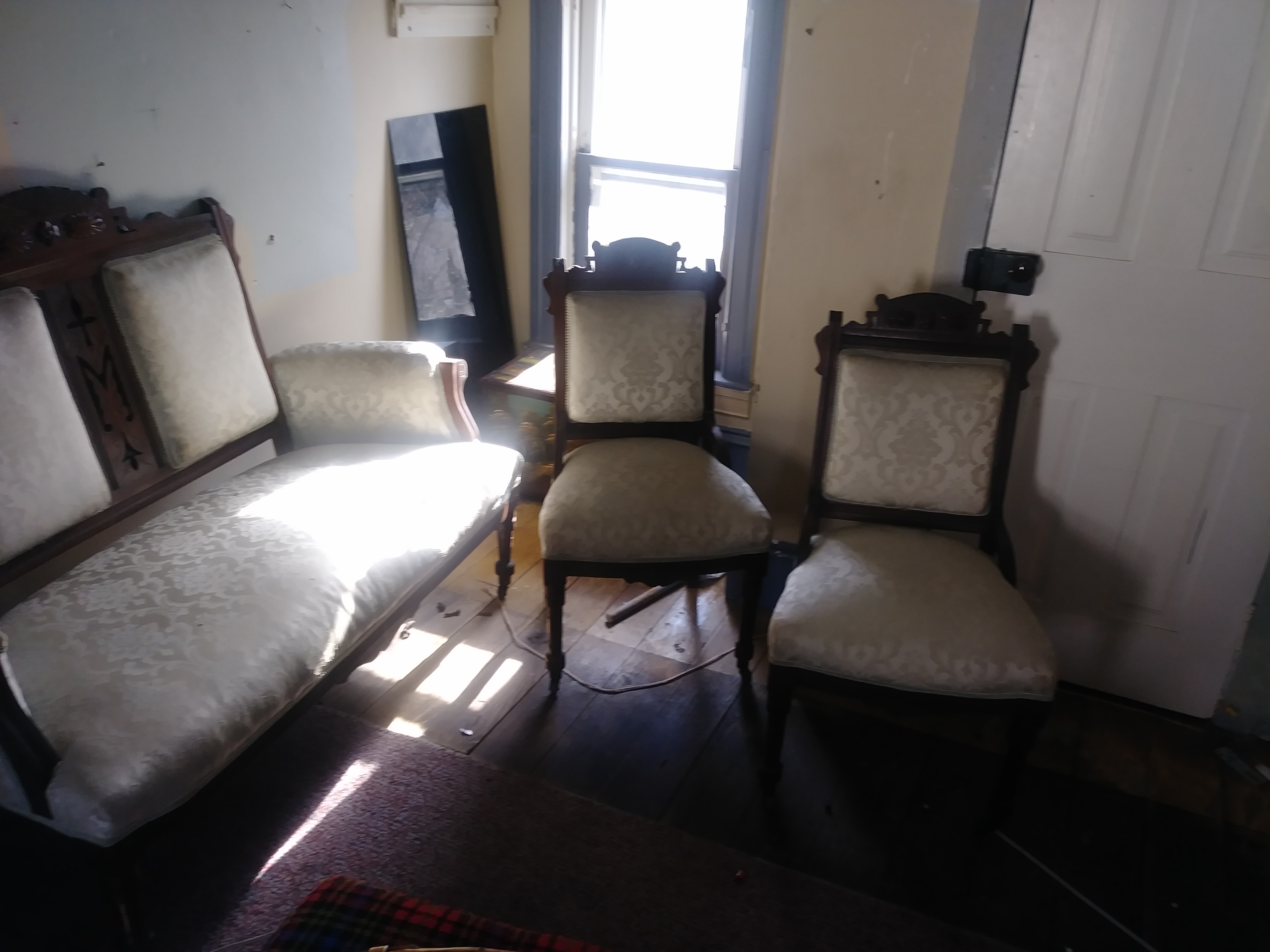 Three piece set...beautiful sofa or loveseat with two matching chairs. I believe it was reupholstered. The original fabric is there. New fabric has tears. Has beautiful wood work. All wood work and both chairs in great condition. These were left behind by a tenant. Looking to see if they have any value.