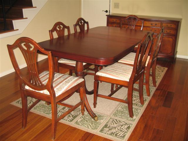 This is a 40x84 Solid Mahogany Dining Table with 2 extension leaves and custom protective pad + 6 matching chairs + matching buffett. Tag with stamp confirms Manufactured by Hylan Co. circa 1925. close-up photo shows how well the wood grains matchup.