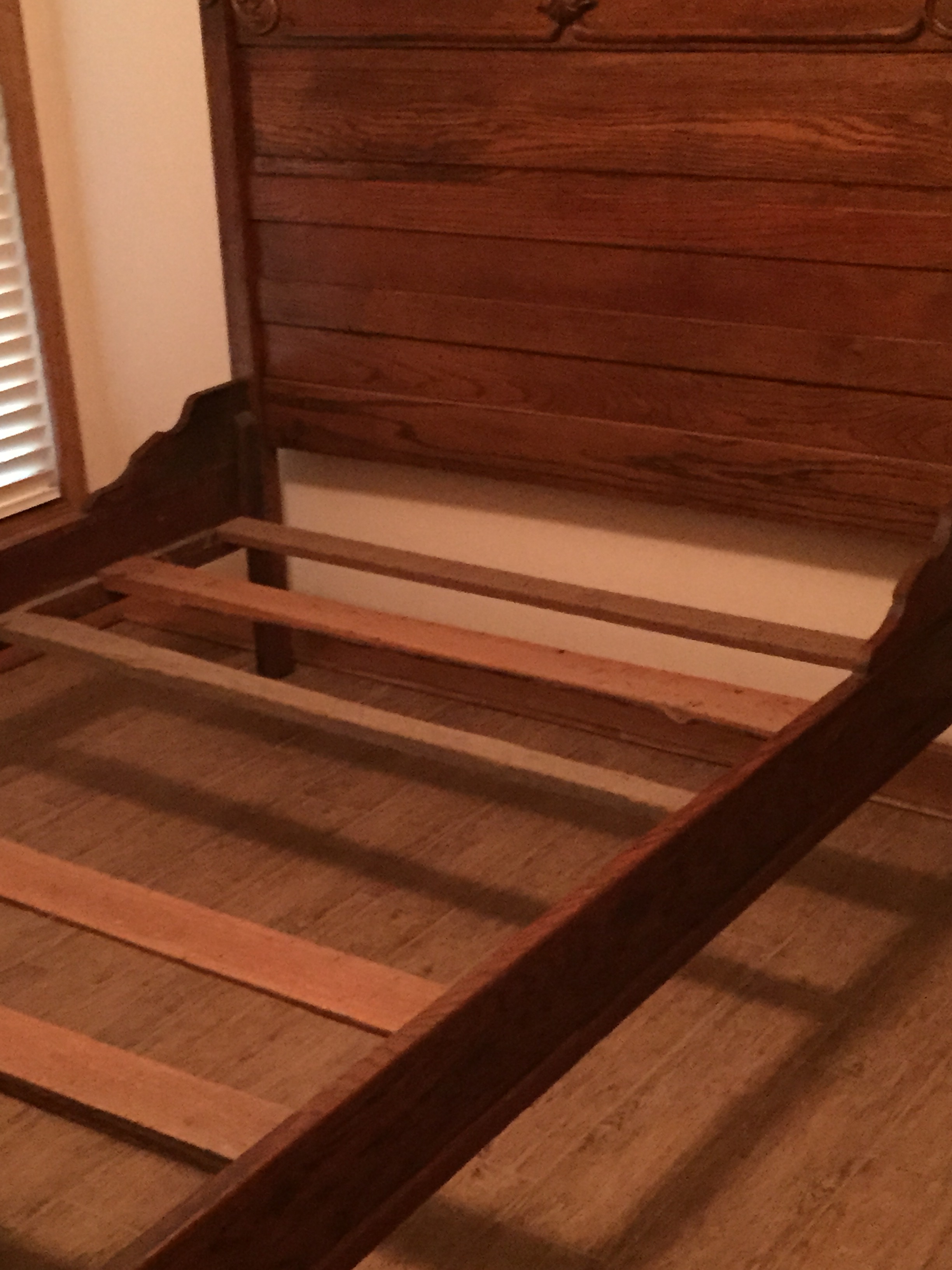 Stamped on back Crescent Line Furniture and the number 174. Very good condition with the original support boards for the bed.