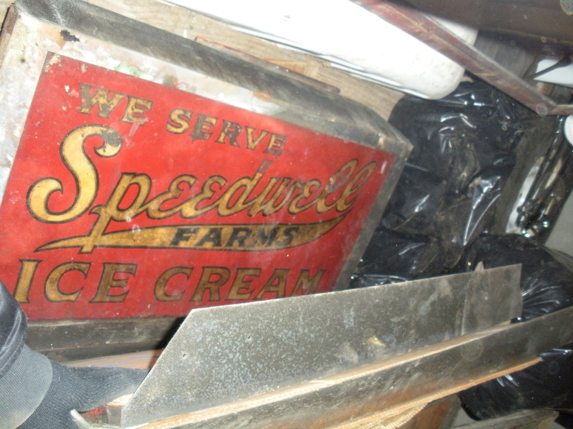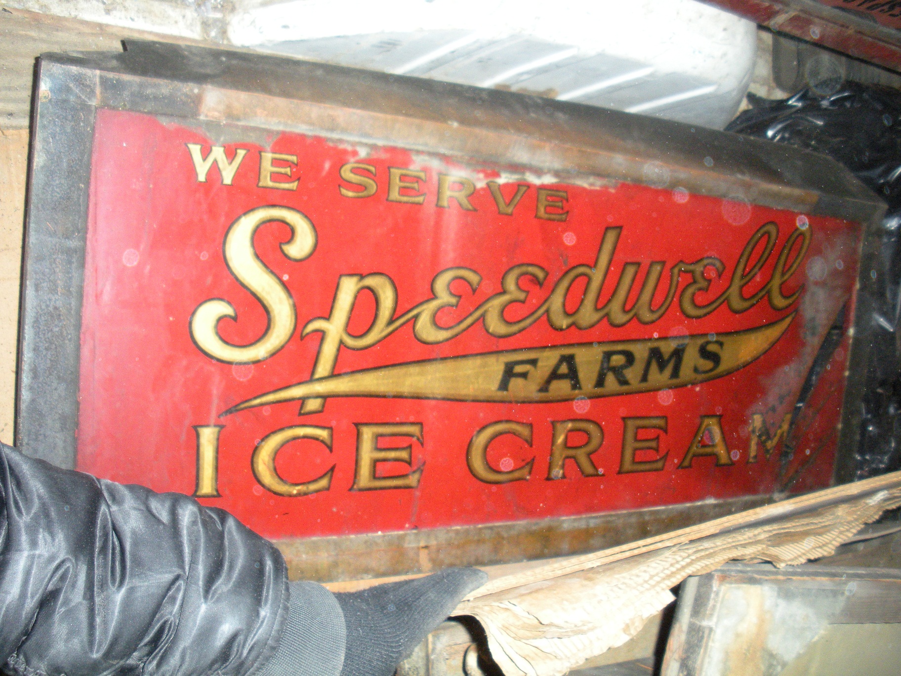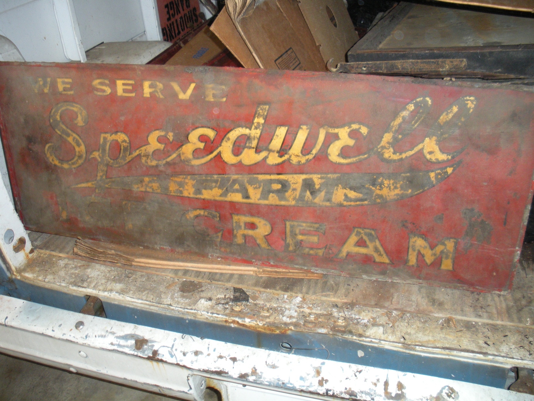 "We Serve Speedwell Farms Ice Cream" The sign is in great condition, but very dirty.