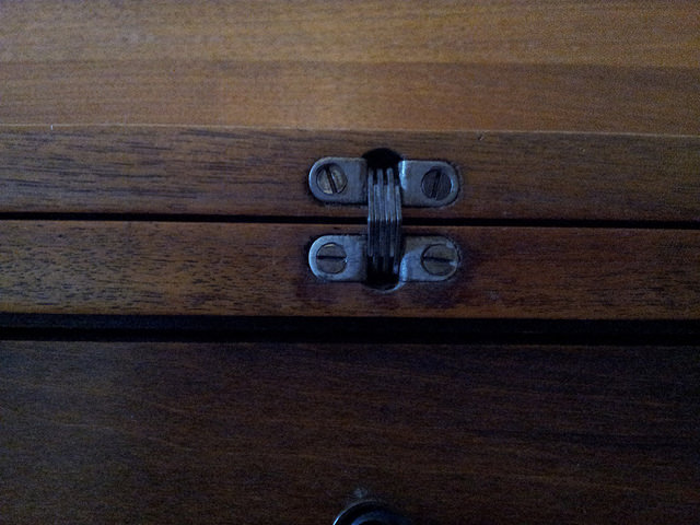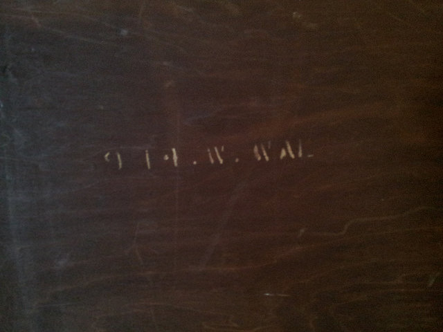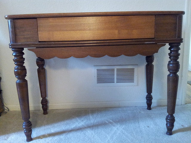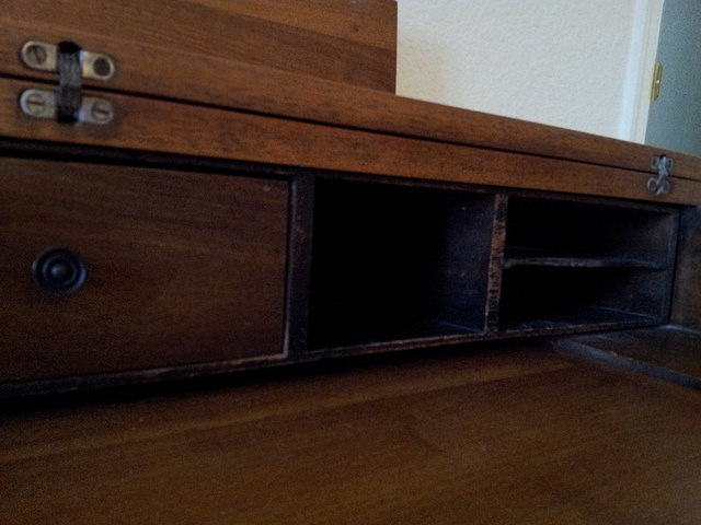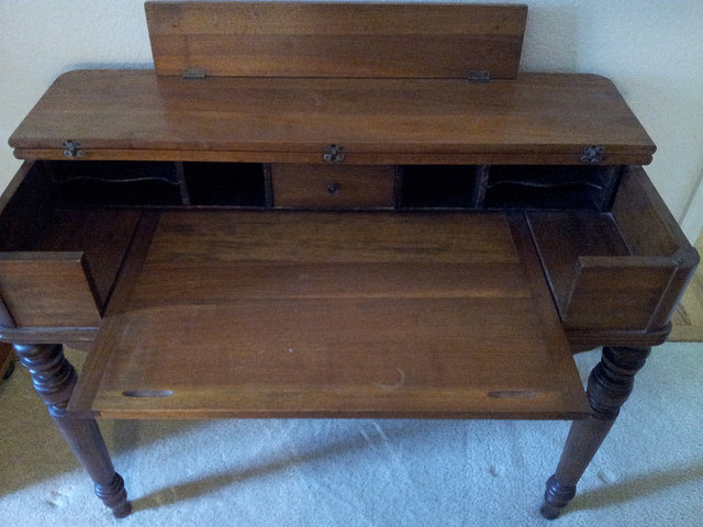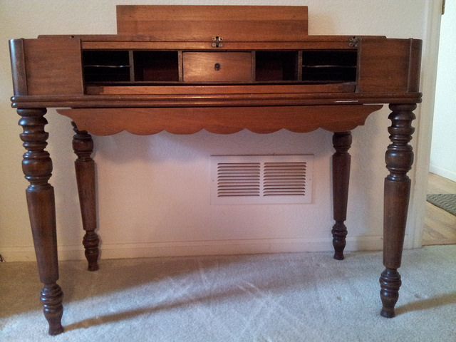 This desk was purchased by my mother in the early 1970s from a Wisconsin antique dealer. It had curly maple veneer on the front of the drawers. My little brother drew a picture on the writing surface with a pin and my mom had it refinished and the veneer did not survive.