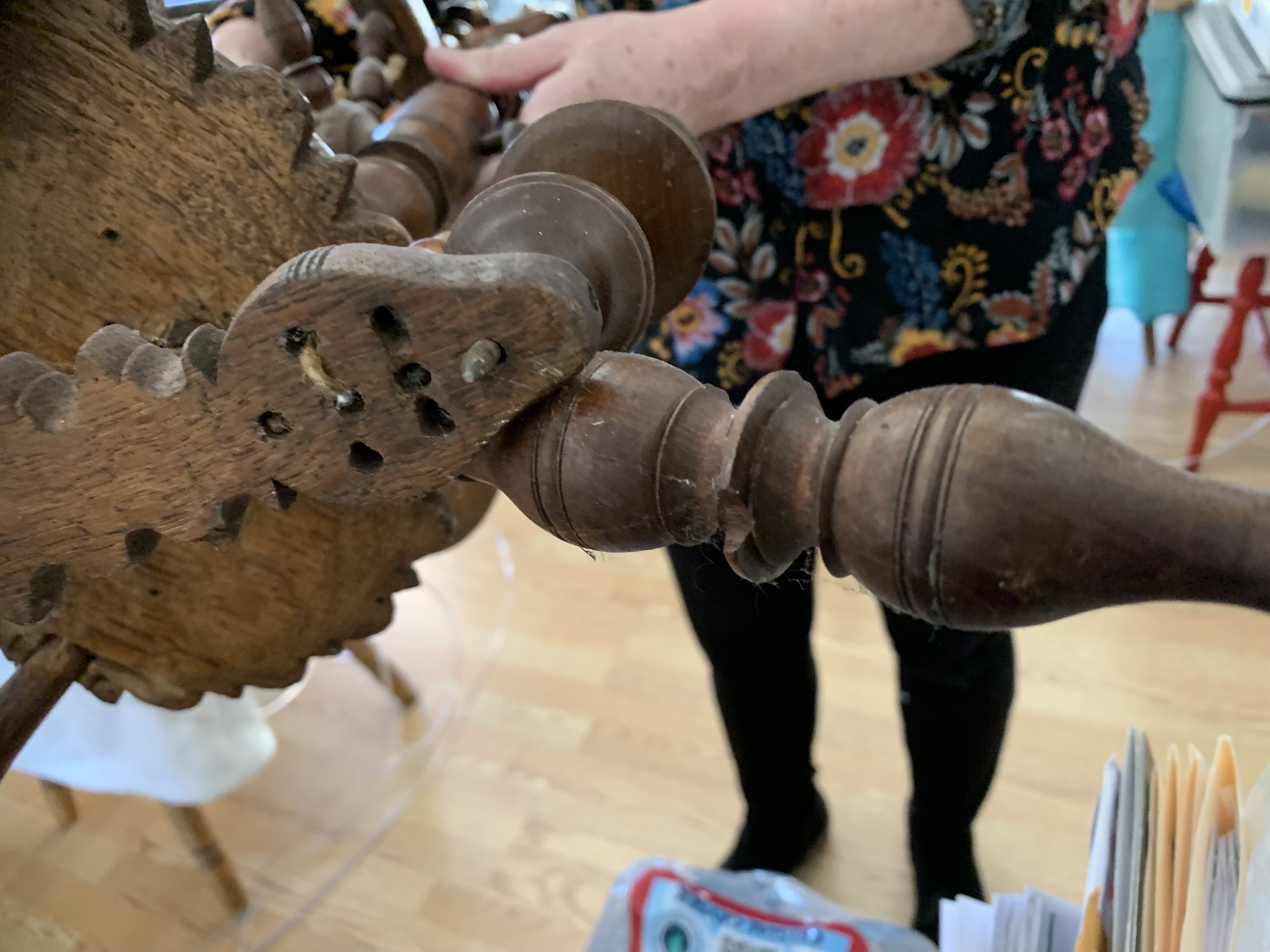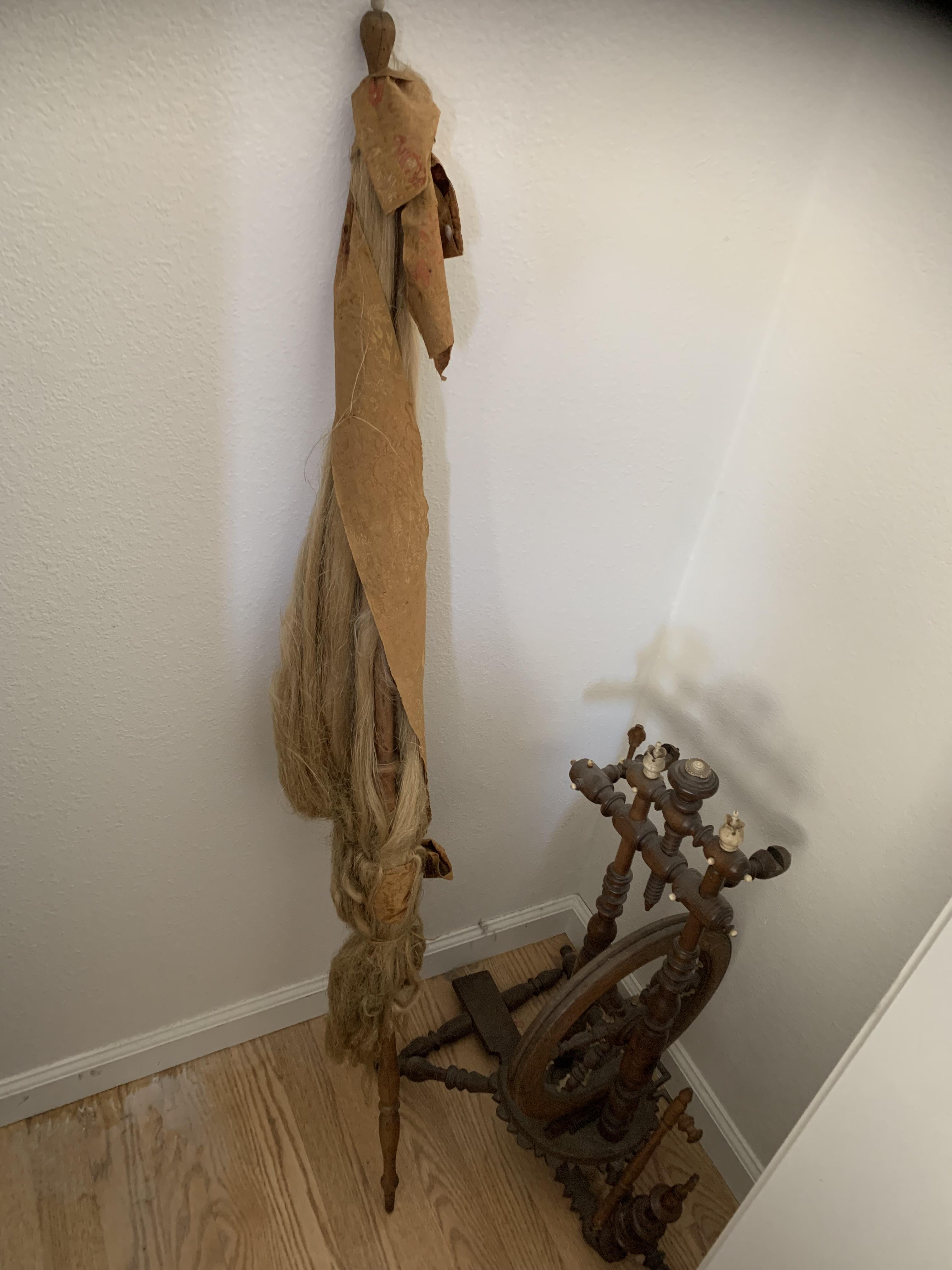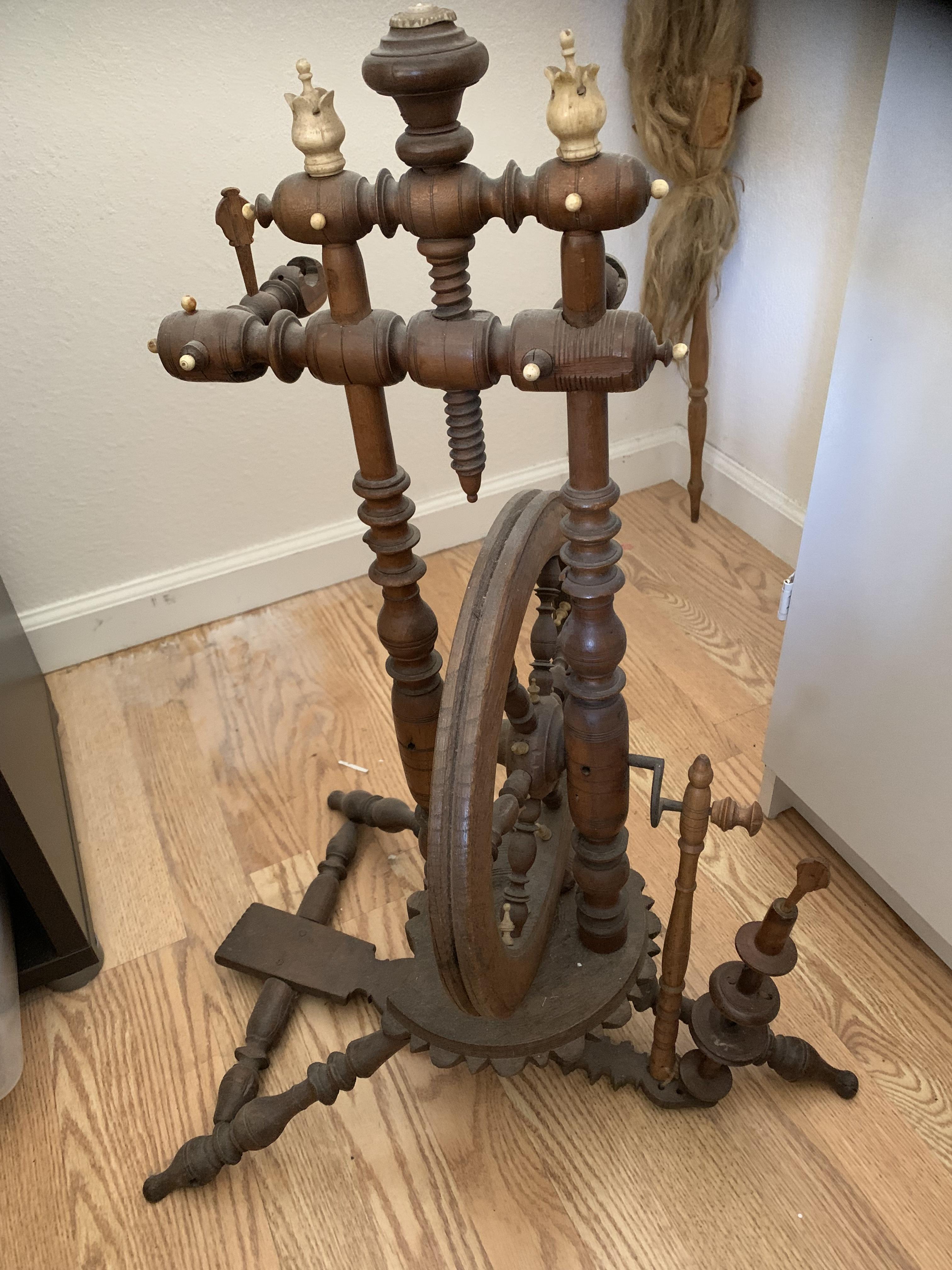 This antique spinning wheel, which I believe originates in France or Germany, likely was made in the mid to late 1800s.
