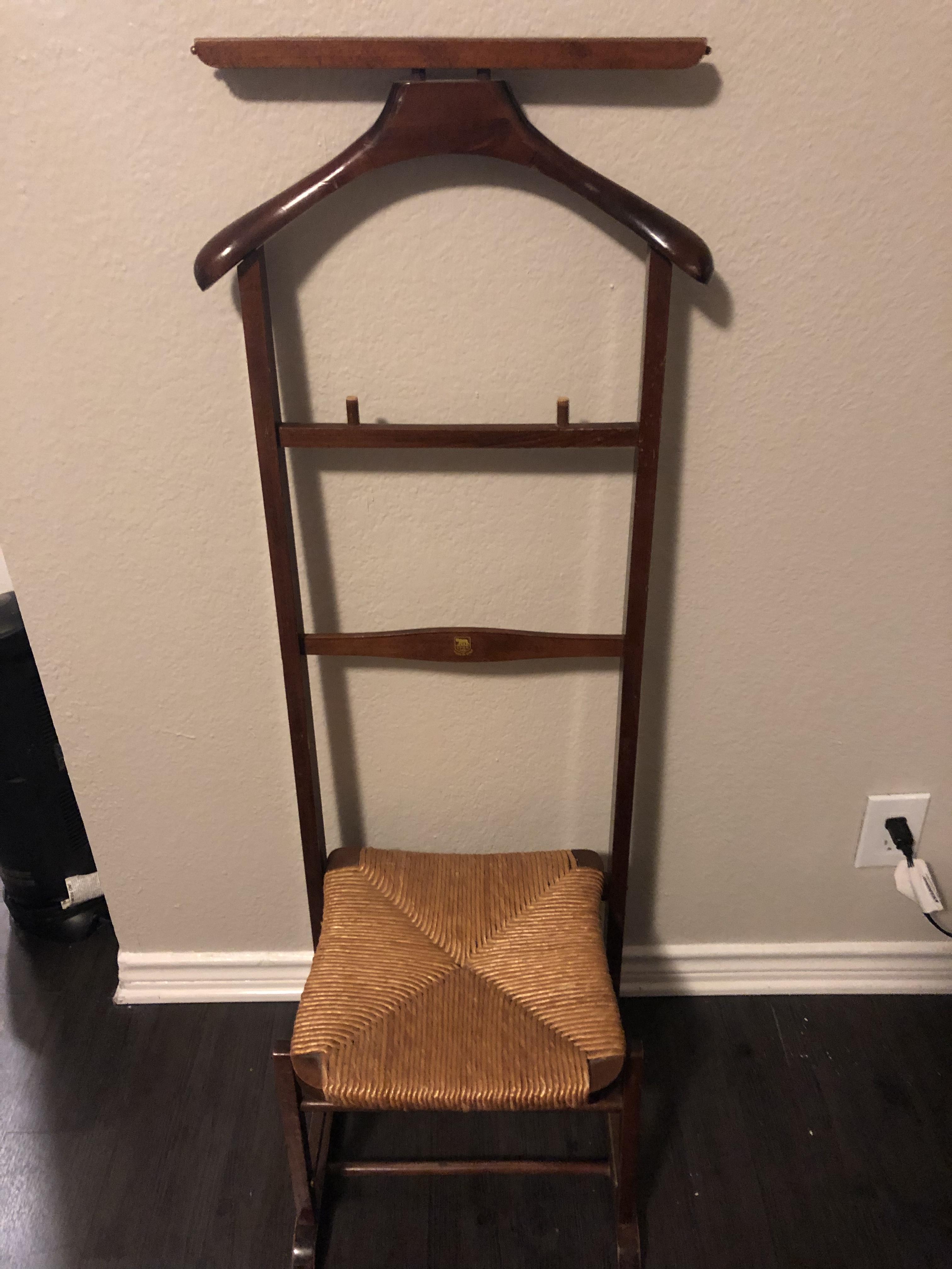 SPQR Italian valet chair. I don’t have much information on this item. It has some wear, as shown in the pictures. The chair is made of wicker and folds up. I believe it is mid-century, but even that I am not entirely sure about. Any information would be much appreciated!