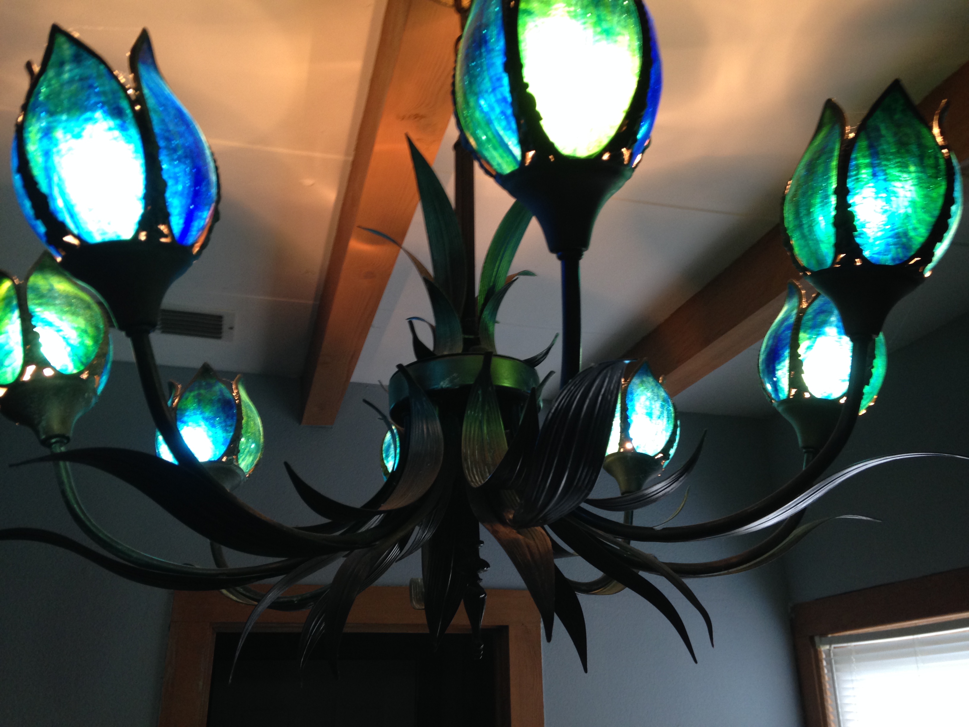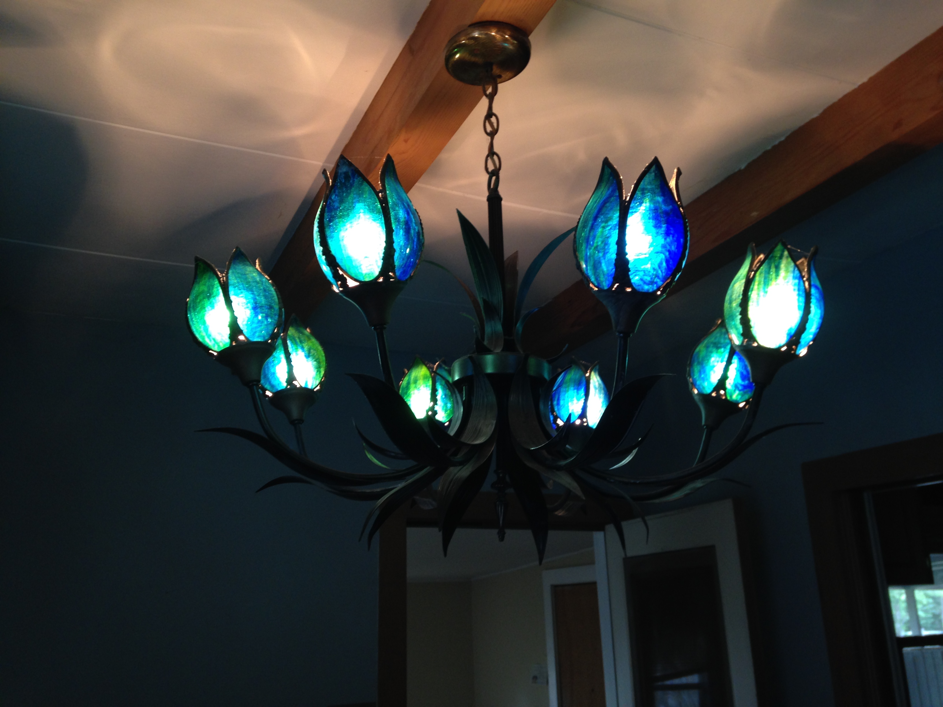 Exquisite blue stained glass and metal chandelier. Holds eights lights.