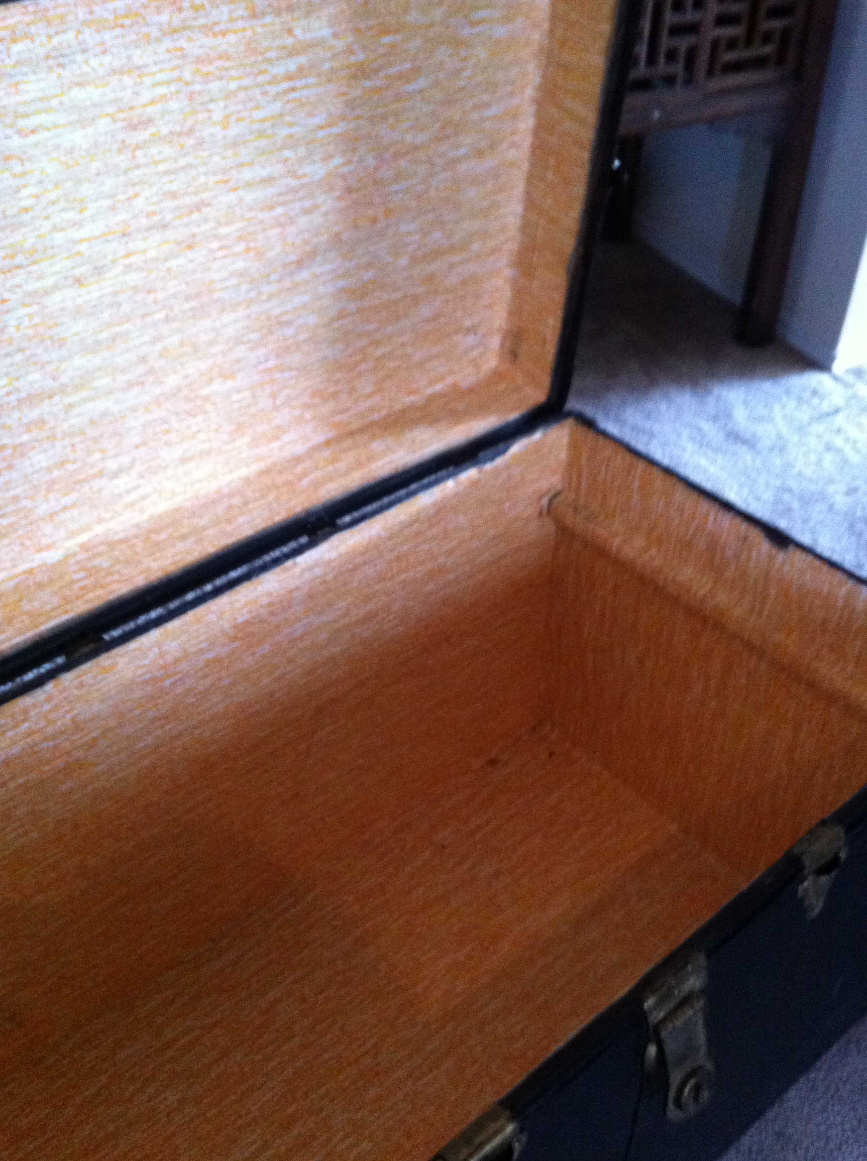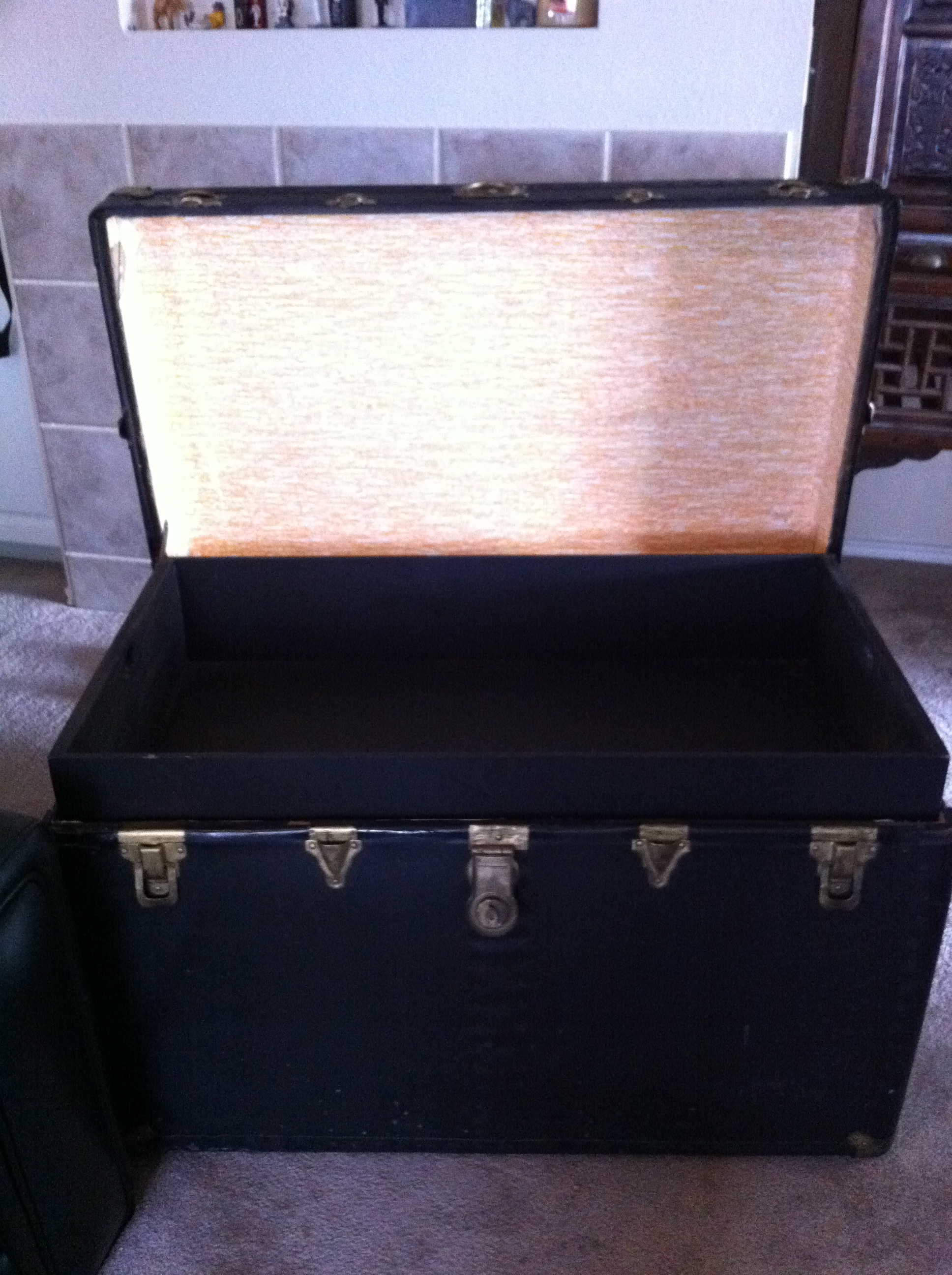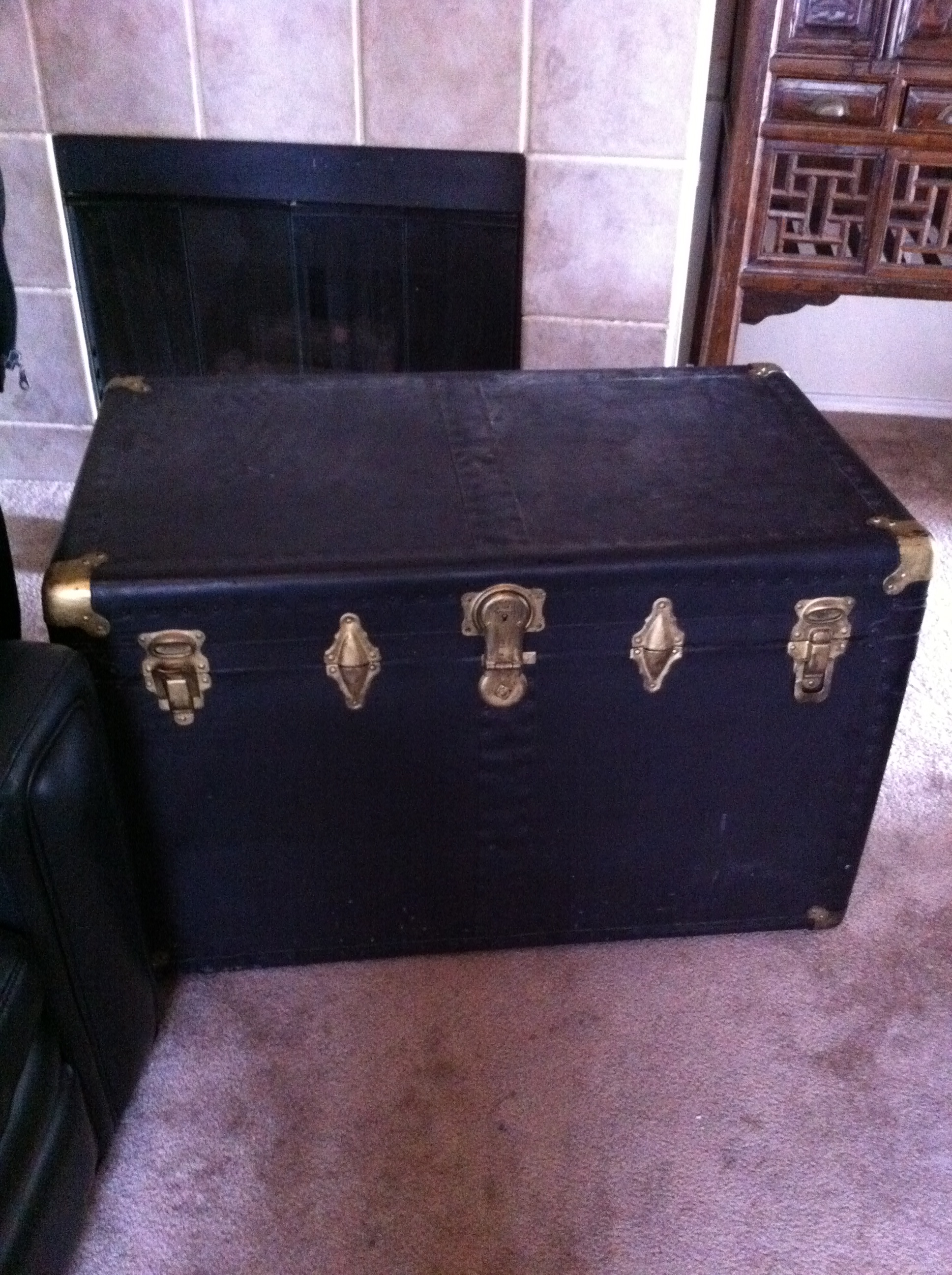 It doesn't have the outside strapping of steamer trunks, used to protect it from the riggors of travel. It's in pretty prestine shape so it appears to be either recovered or a newer version. There was a 'fad' in the 70's/80's for steamer trunks as decorator pieces. They were used as blanket boxes, livingroom tables etc. so many reproduction forms of older designs were made. Quite functional and still desirable by many, even the repros have a value of about $75 to $150.