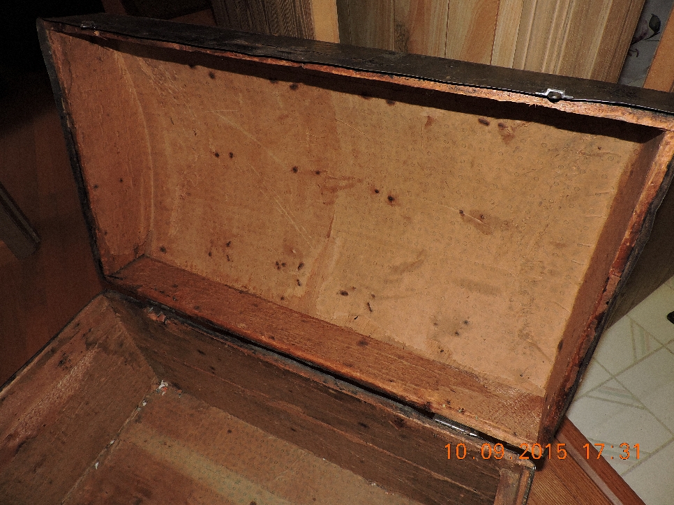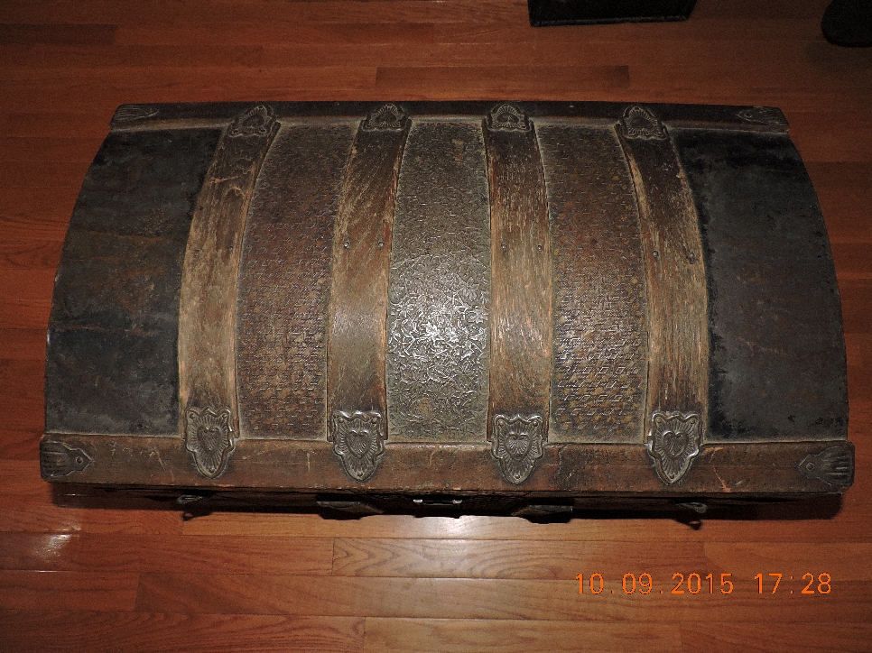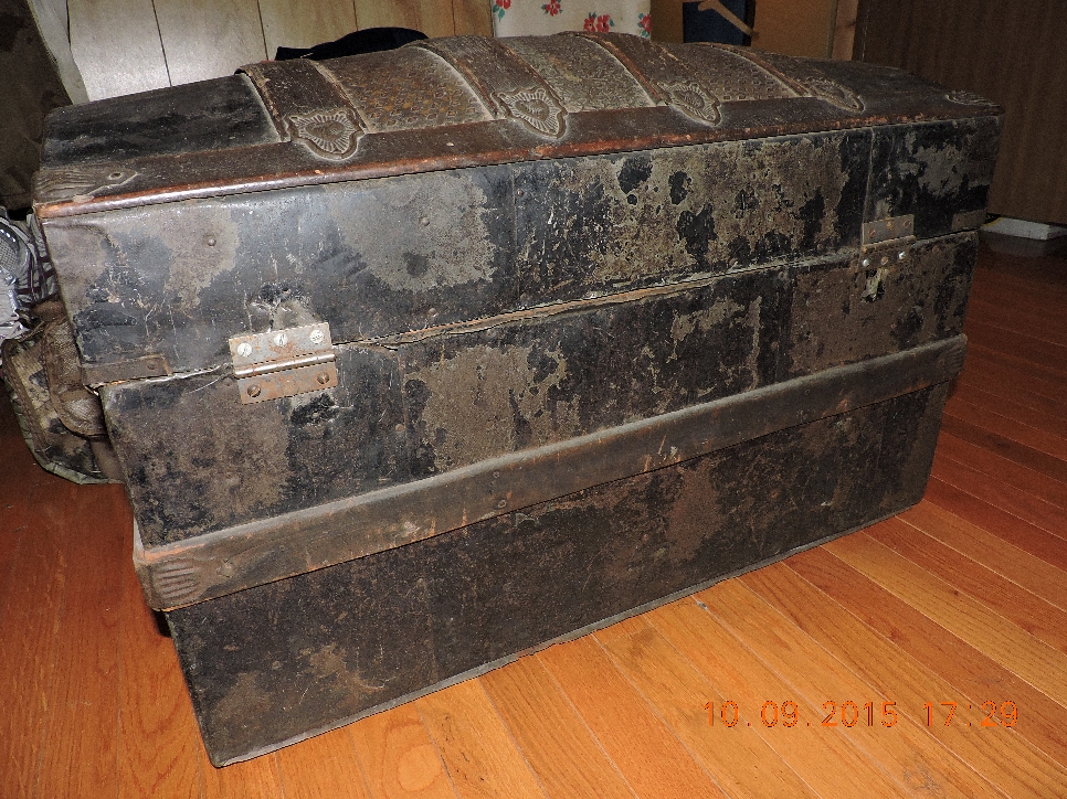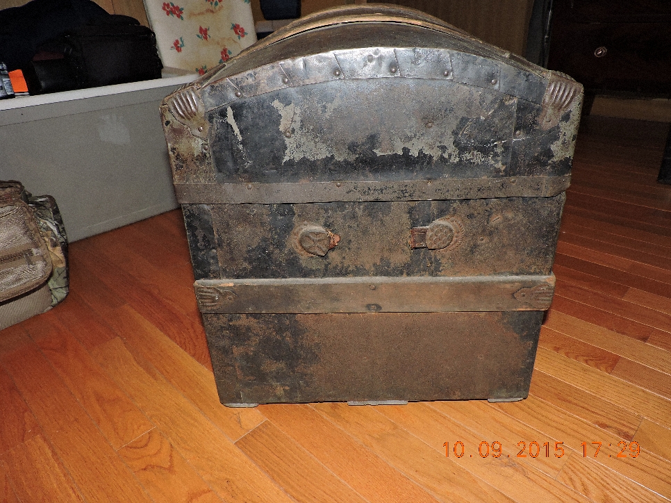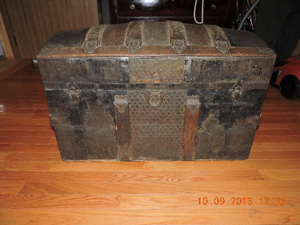 Round top antique steamer trunk from the vermount area. Metal and wood design with embossed stars. Has very small metal castor wheels on the bottom.