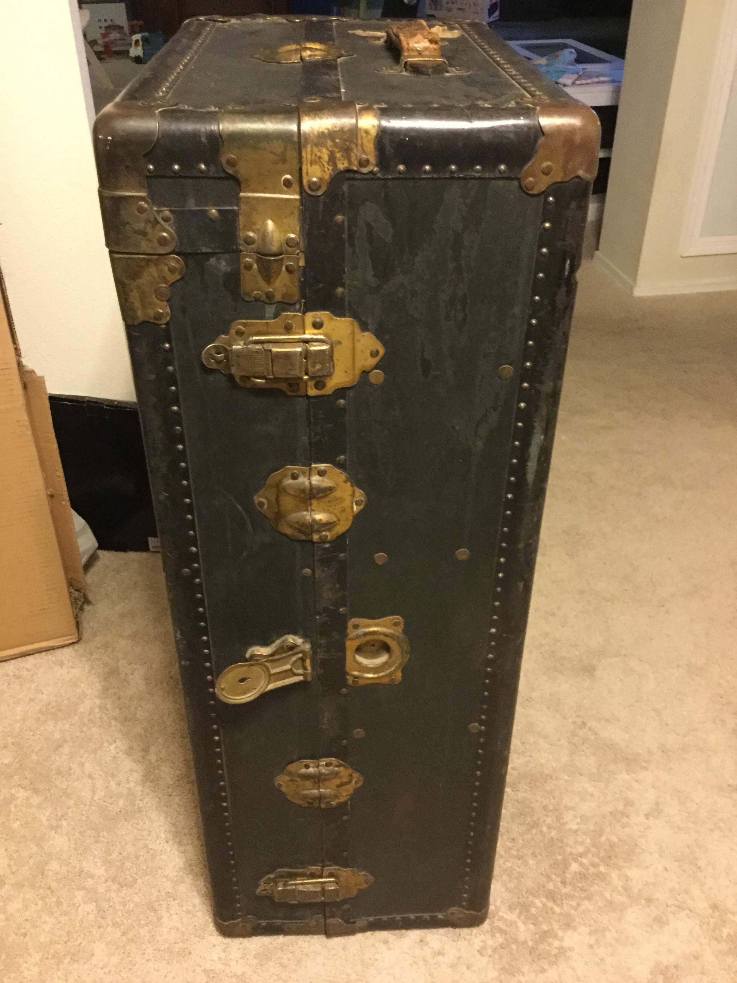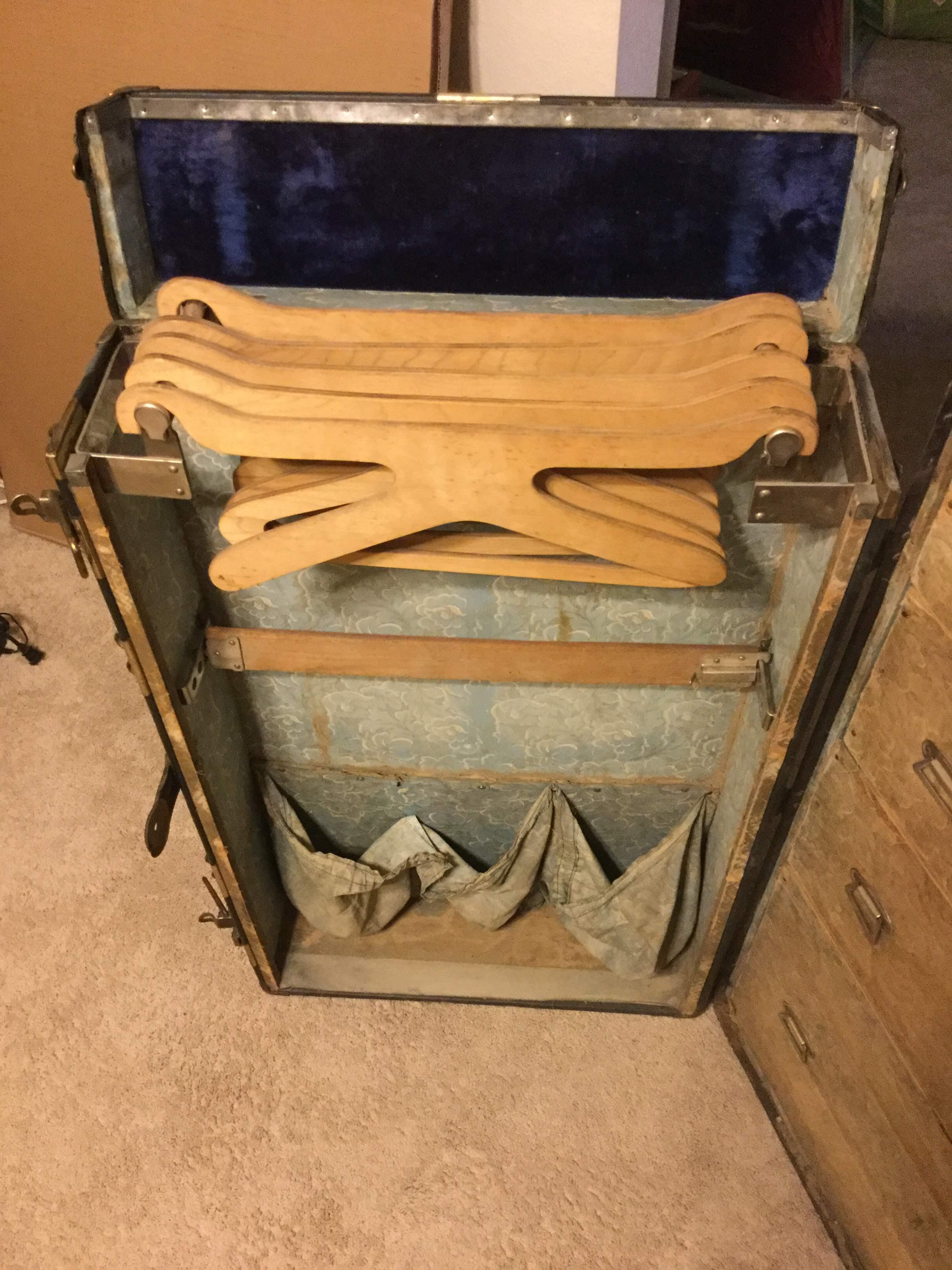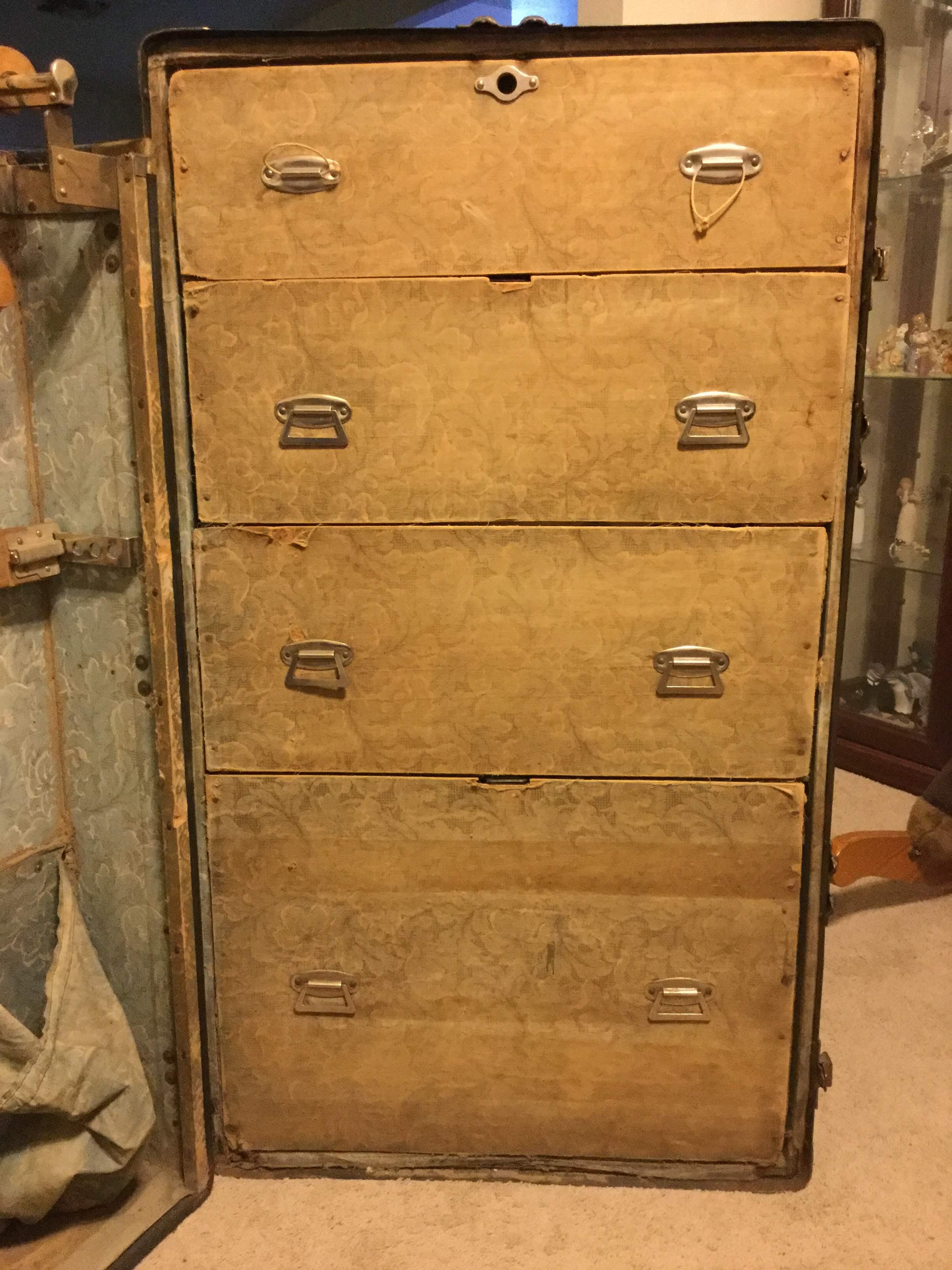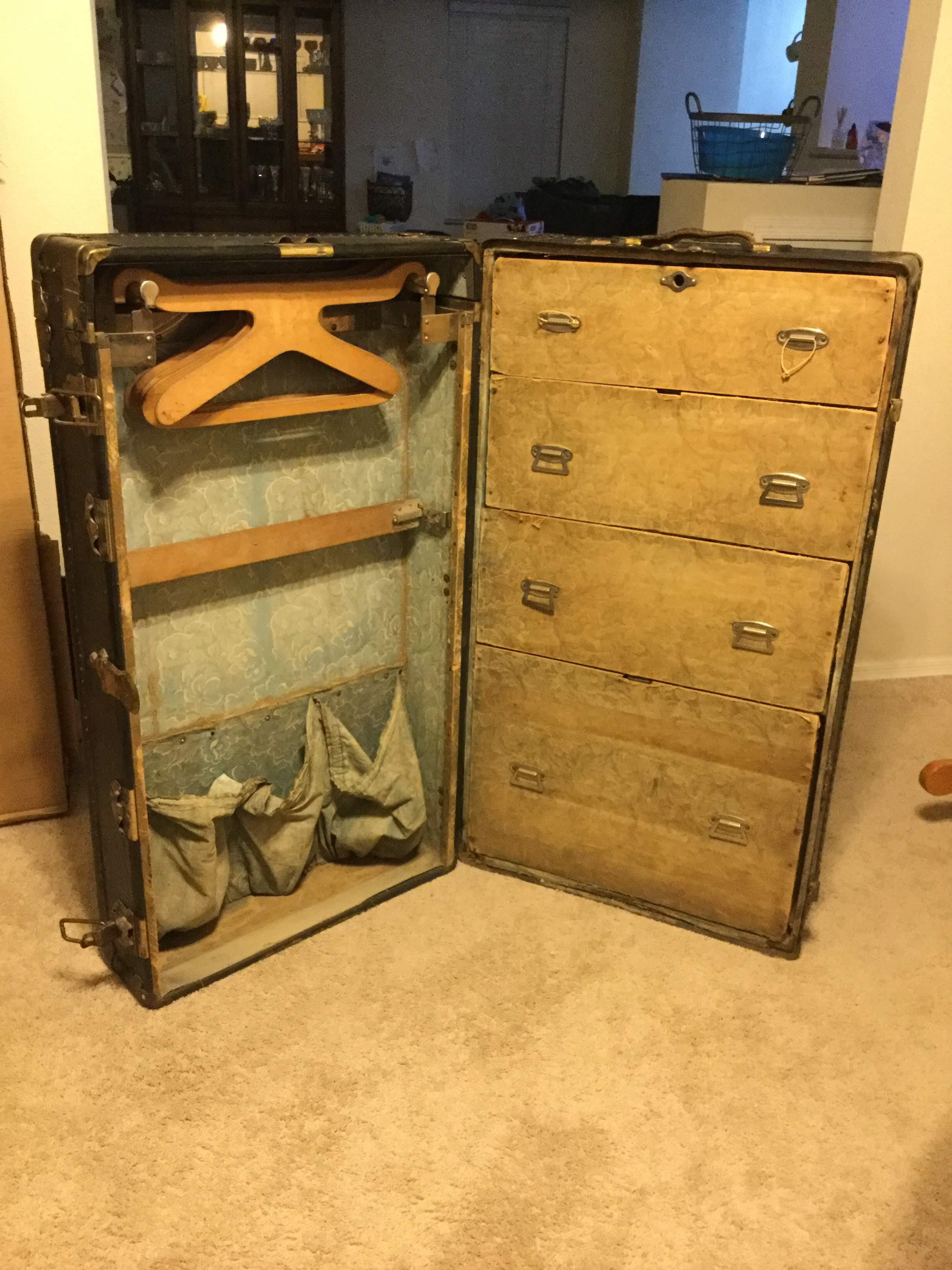 I believe this trunk to be from early 1900's. It is not in the greatest of shape. Evidence of mild termite damage, lock mechanism is broken, interior is worn. The two wallets I found in one of the drawers, hoping they might help age the piece. I could not find any manufacturers marks, but there are remnants of old delivery labels. The only legible portion of one is Railway Express Agency From: Le Mars, IO...