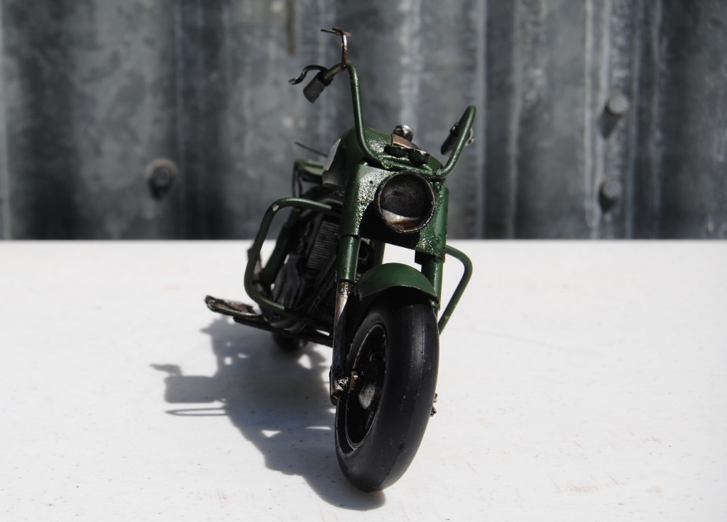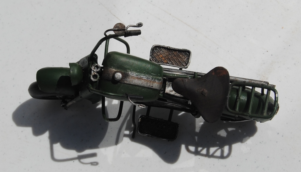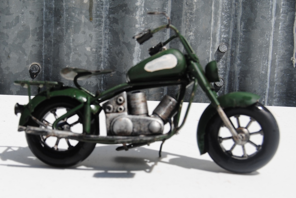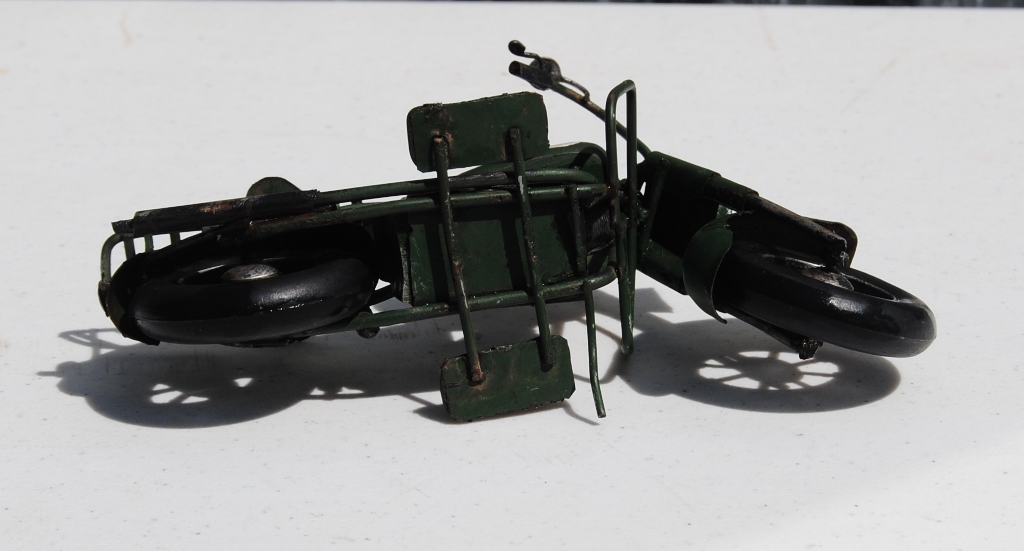 Made of steel with rubber tires. Green in color. Seems to be in pretty good condition with kickstand and mirror, etc in place. Not sure if seat was ever covered or if there was a glass headlight. 7 inches long x 3.75 inches tall. Gas tank just has a white paint emblem on it.