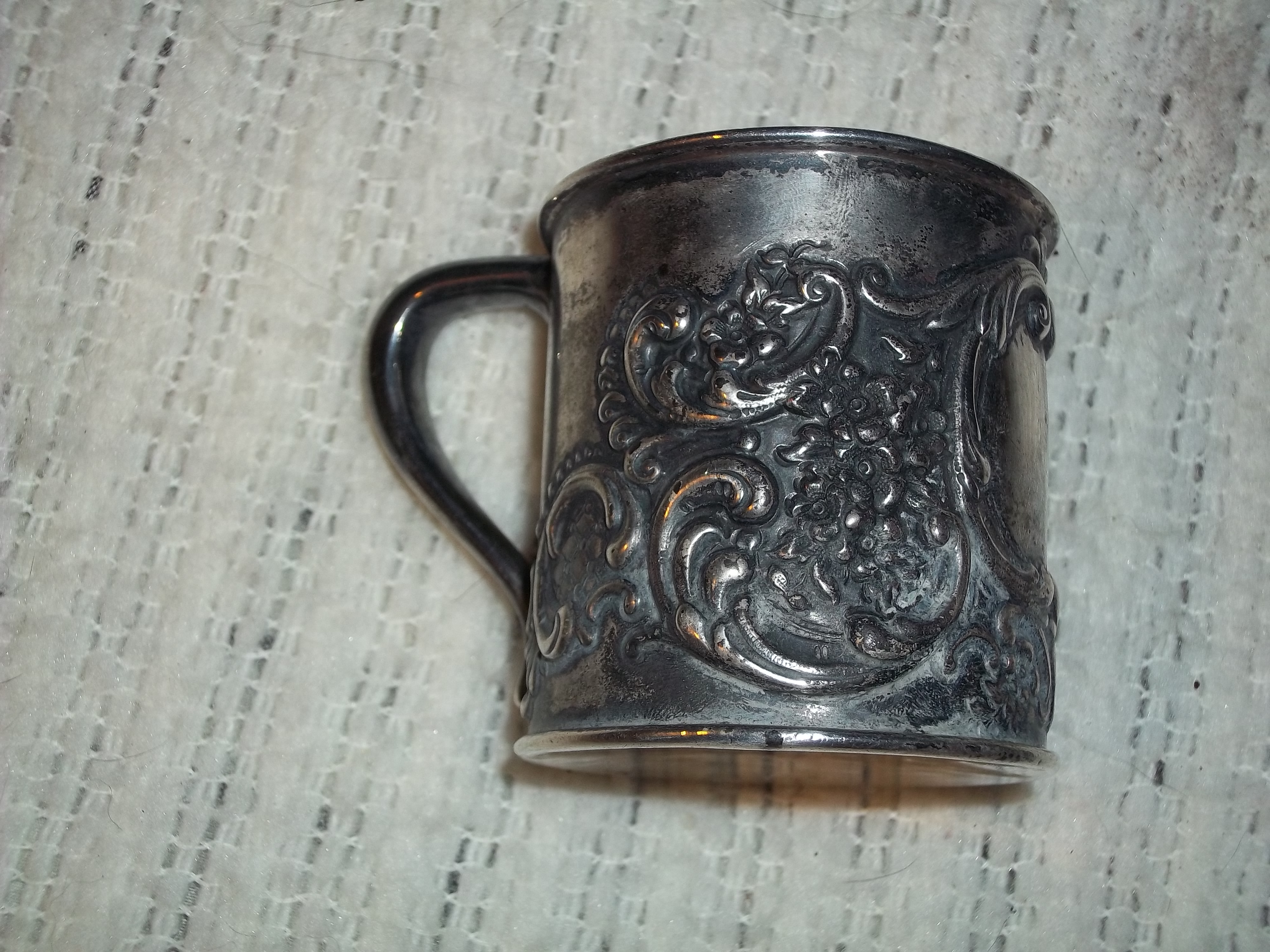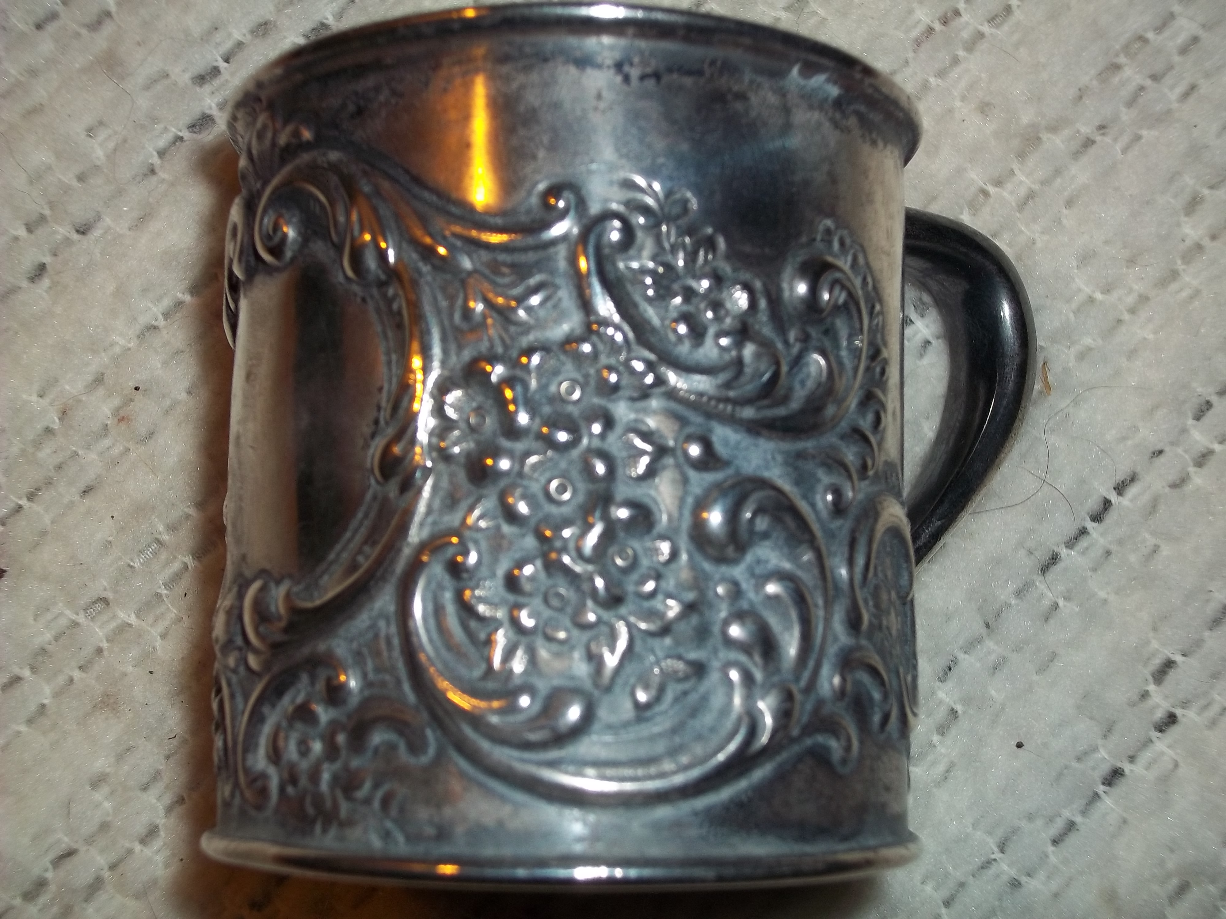 Beautiful sterling,embossed baby cup/mug in exceptional condition,not engraved although engraveable. This cup/mug has been passed down for four generations, the last owner being my Grand Mother whom was 103 years of age at her passing.I hope someone can help me identify it.