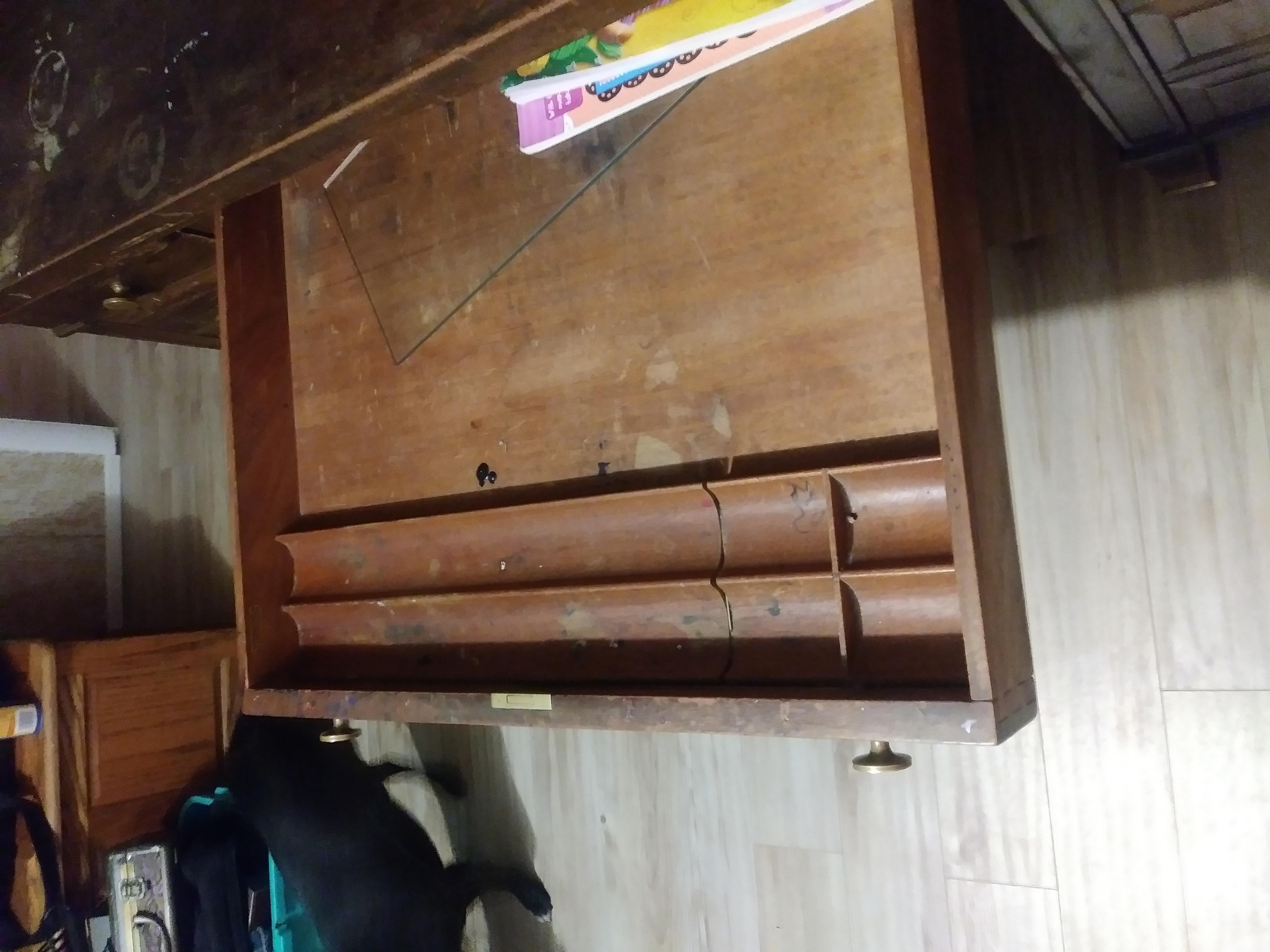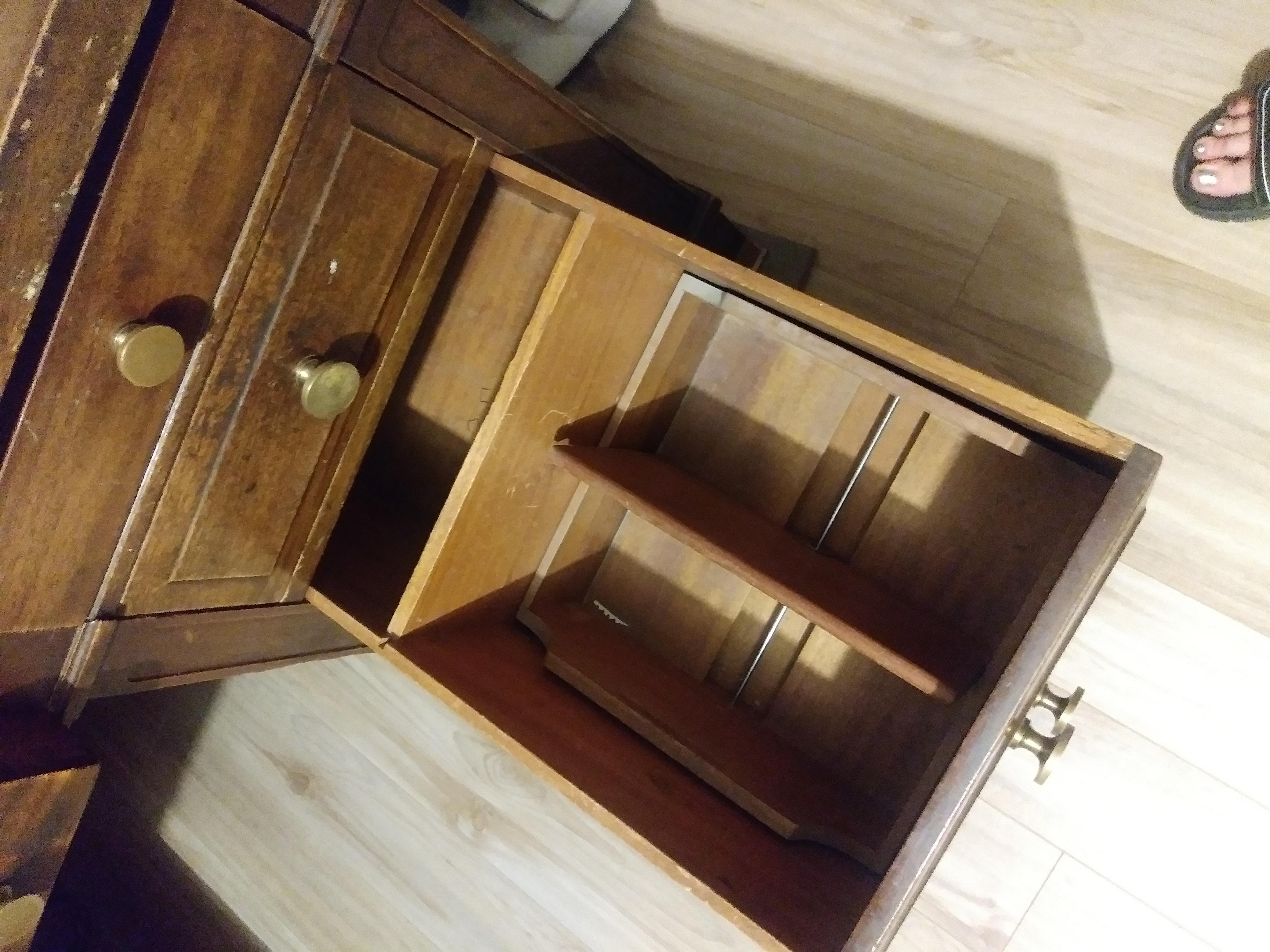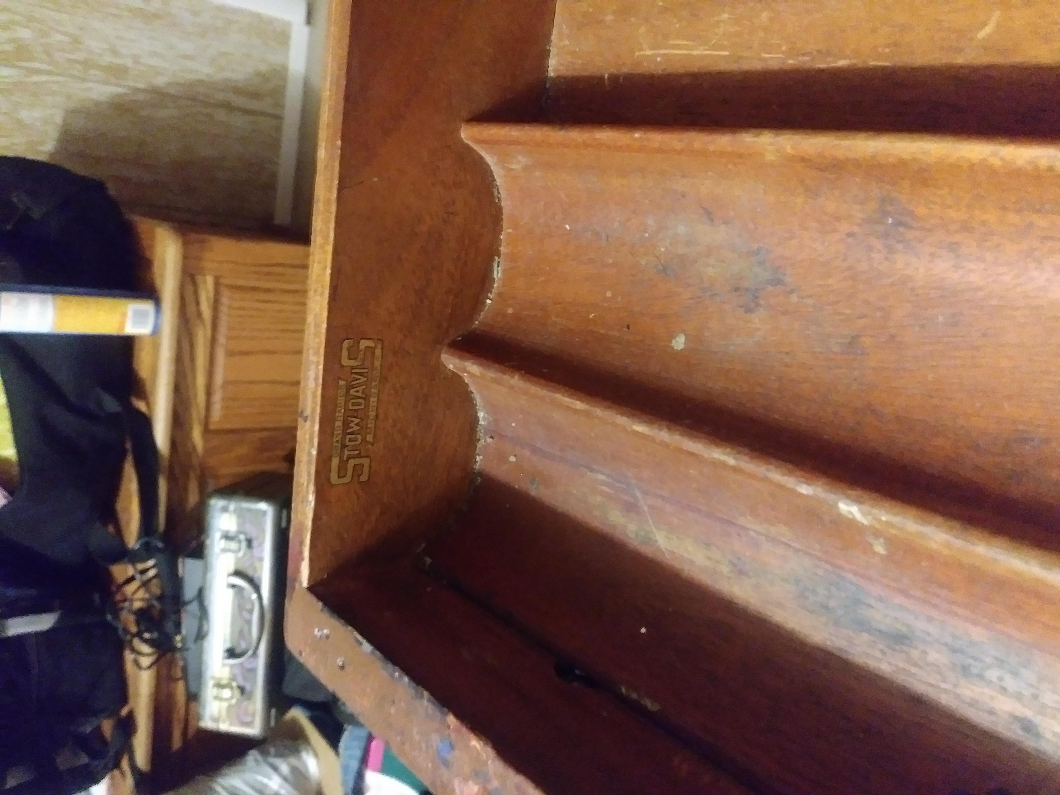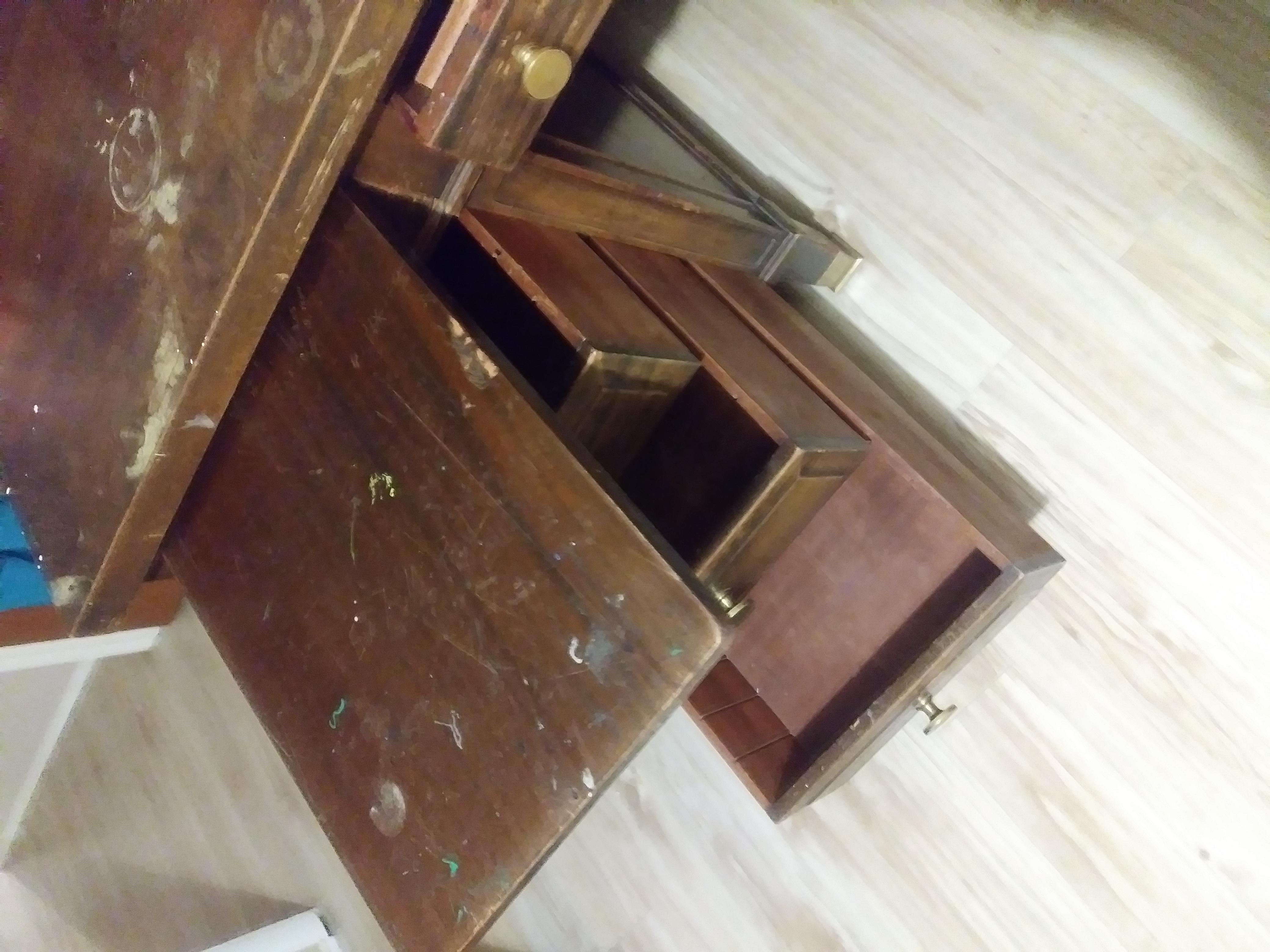 I have an antique stow davis executive desk. It is either solid walnut or mahogany. The knobs are solid brass. There is brass around each leg. There are 4 drawers on the left side and 3 on the right side. The bottom drawer on the right is file size and includes a wood apparatus for holding files. If the drawers on the left side are shut in a specific sequence, all the drawers will lock. I do not have the key for the middle drawer. The desk needs sanded and refinished. I am interested in selling as is. It is 30 in tall, 69 in wide and 38 in deep. It is extremely heavy but can be taken apart to move.