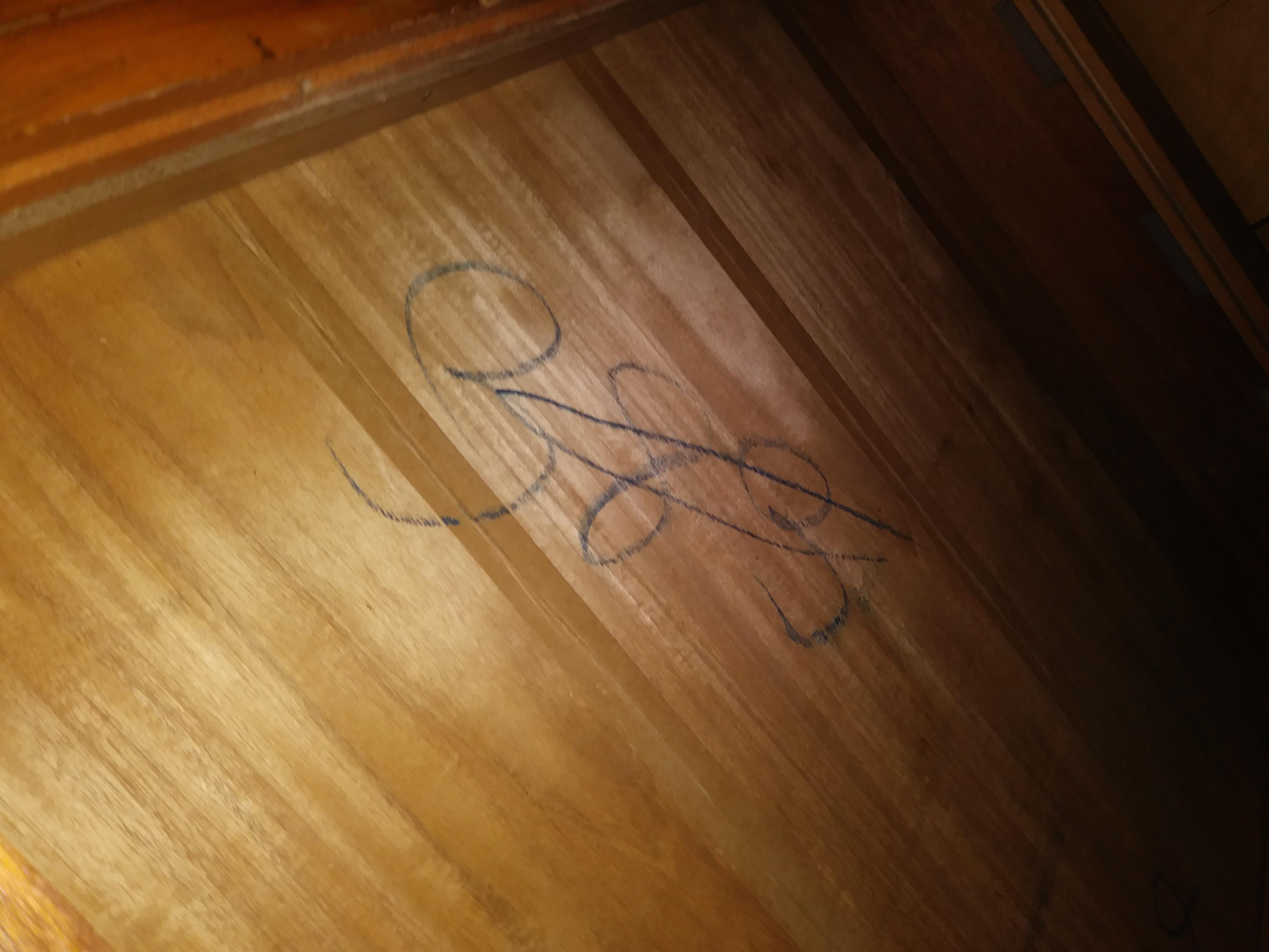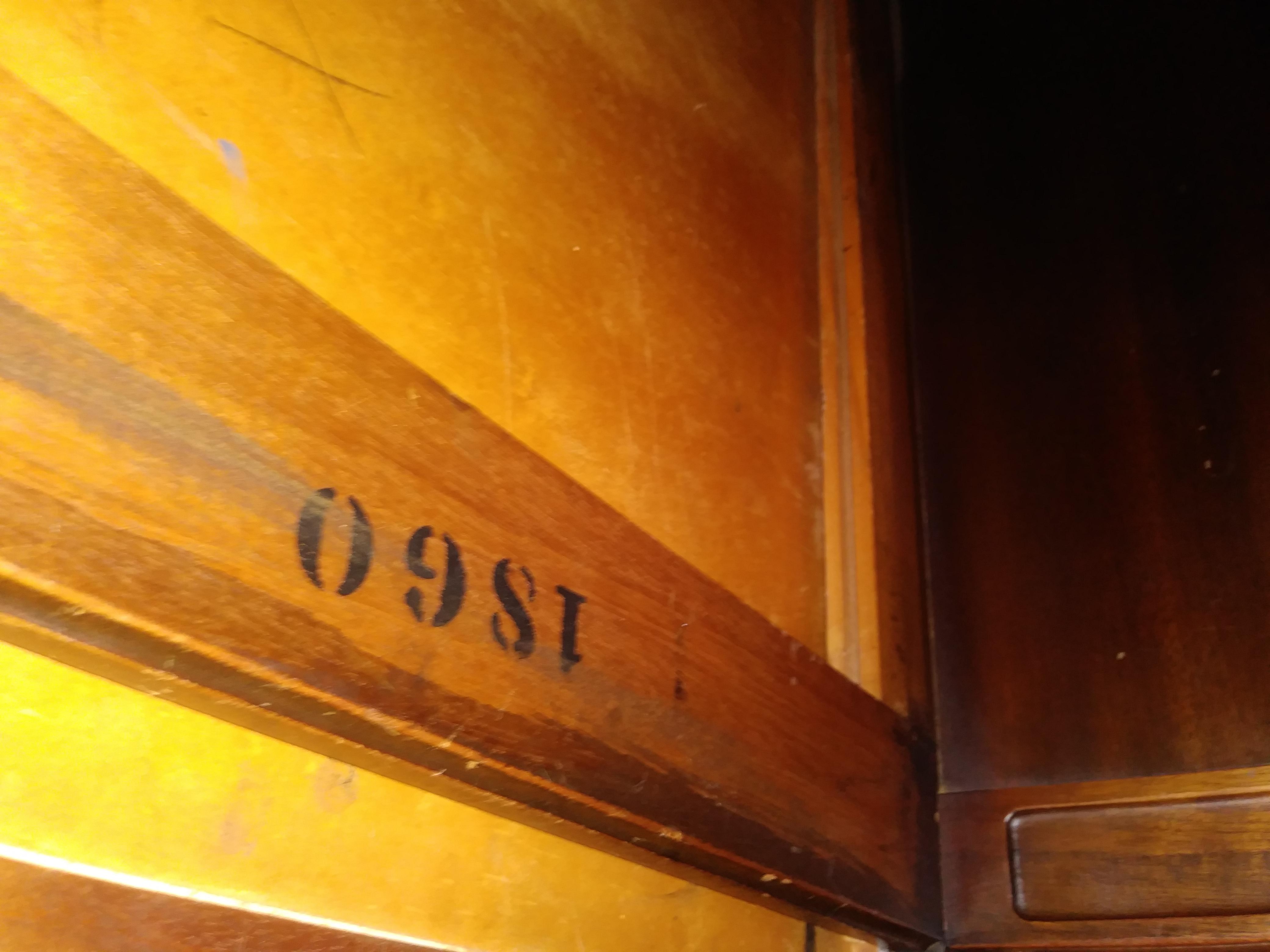 Underside of middle of desk stamped 1860 and then handwritten possibly 383. Middle drawer inside left says Stow Davis