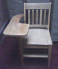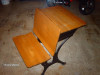 Antique student school desk with a metal frame that connects the chair to the desk. Top of desk has an inkwell and a lift top for storage. Great condition