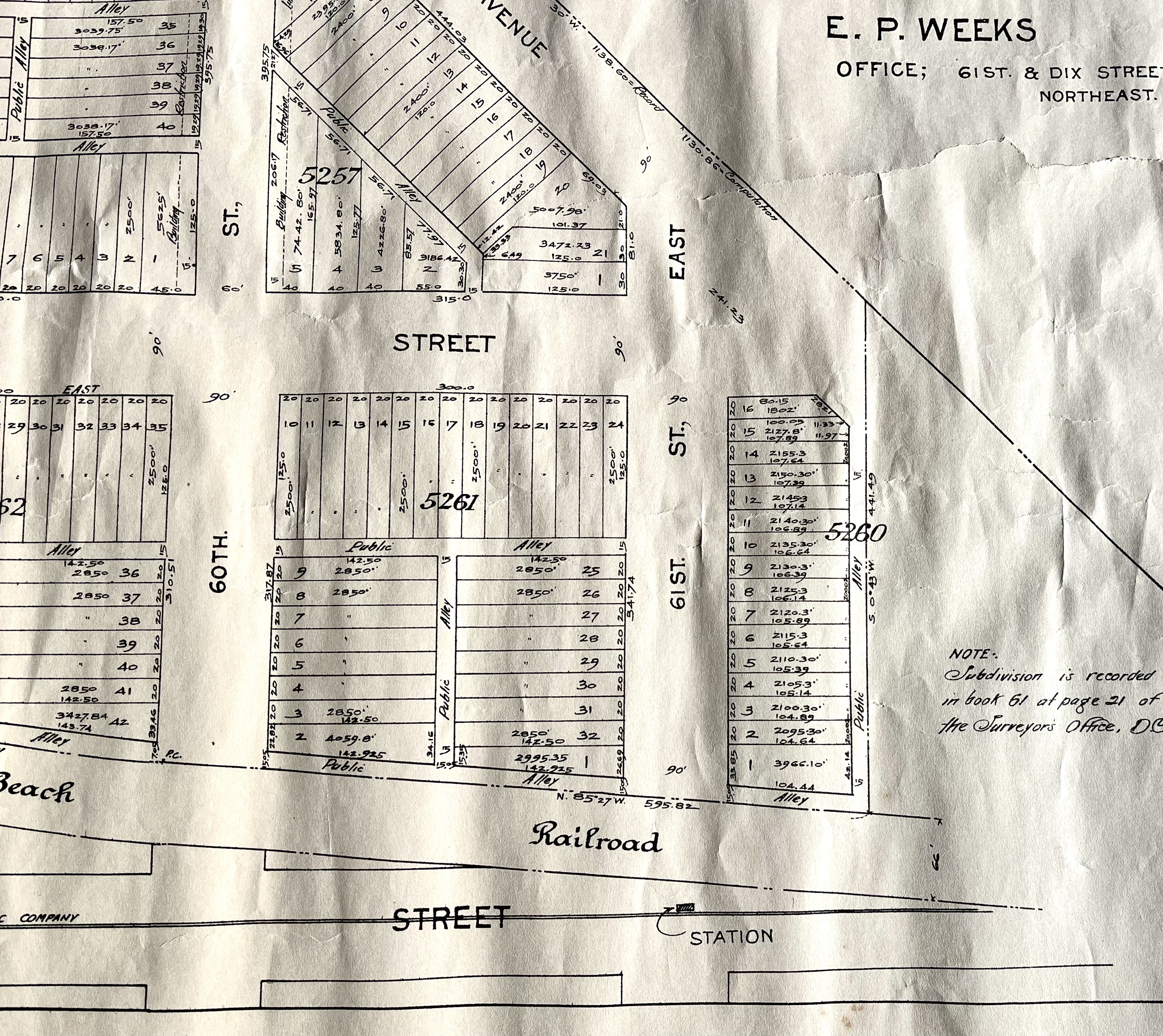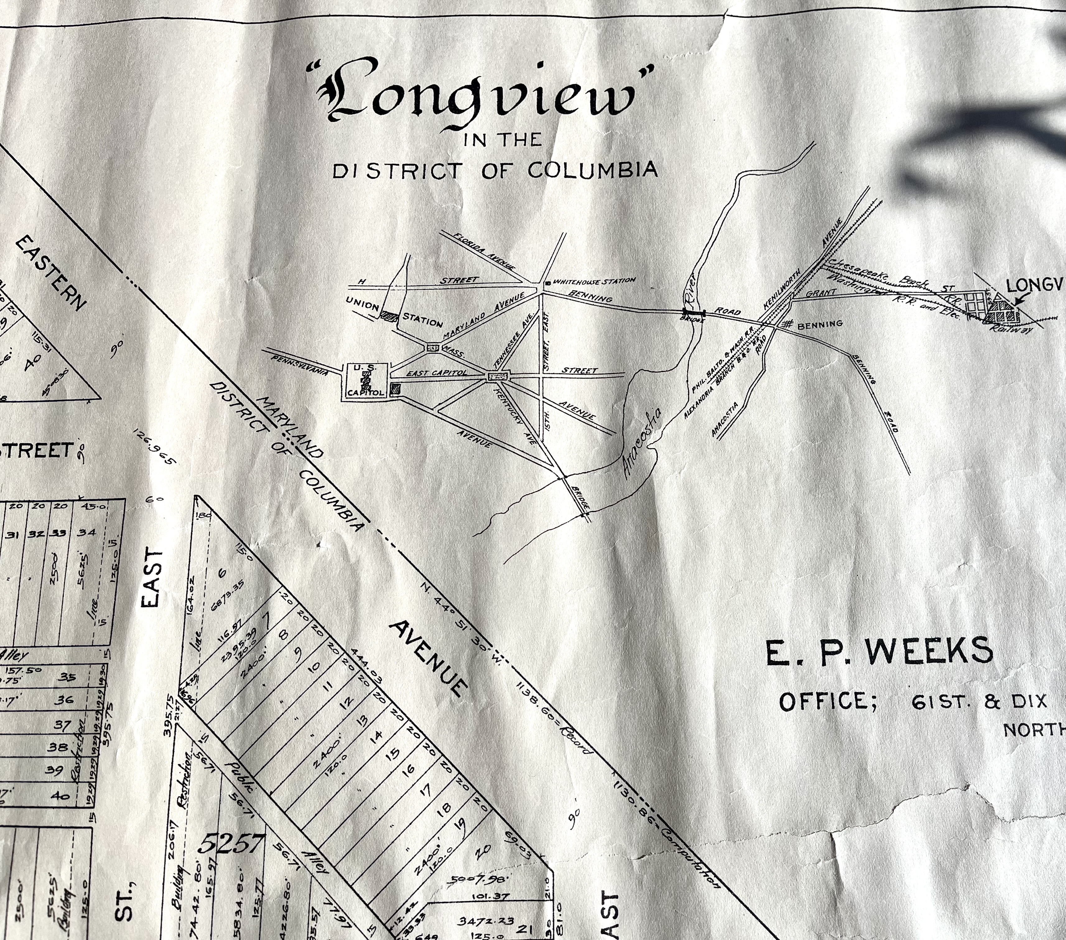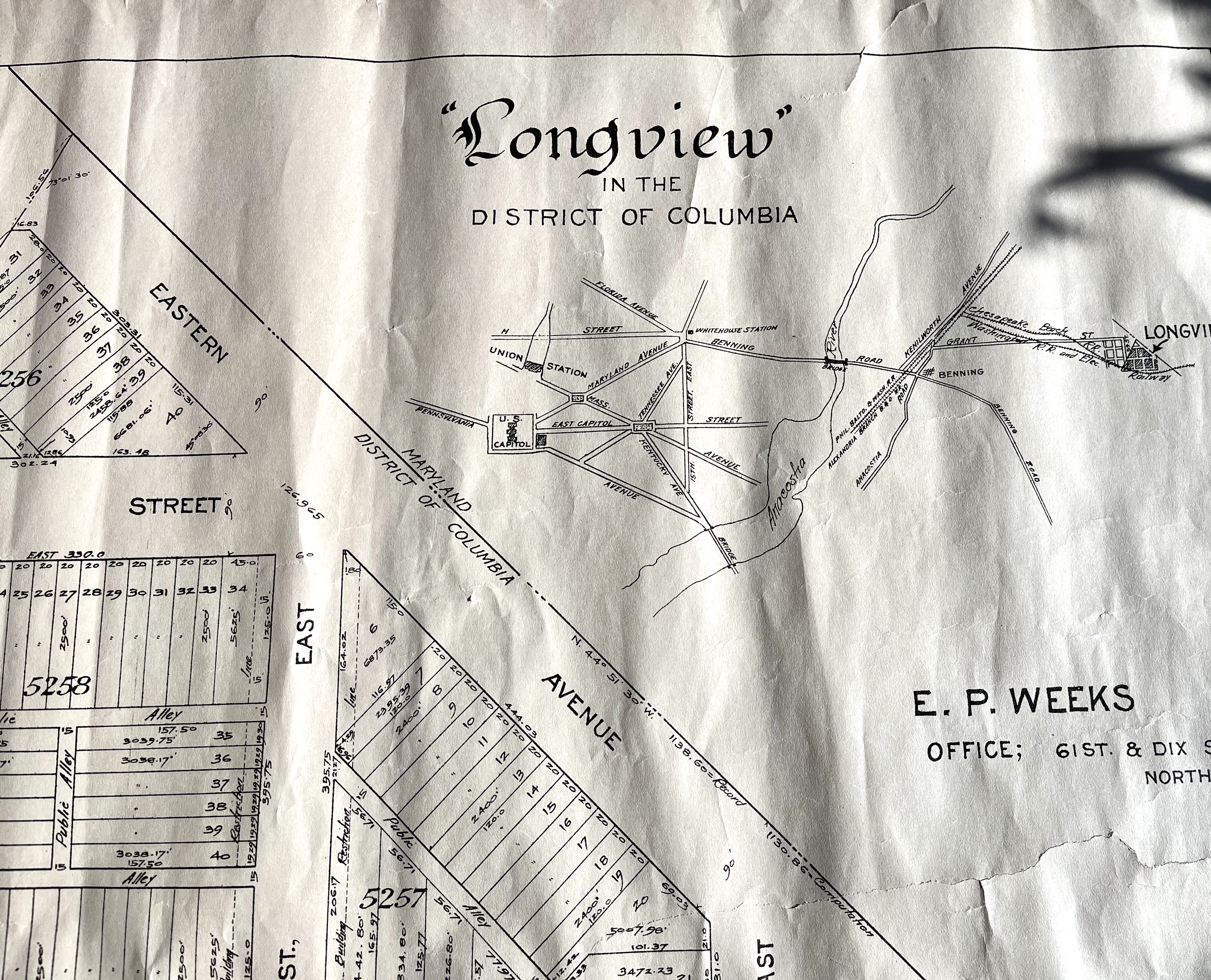 This map is believed to date from 1880 to 1910, but it may date back to the Civil War era. It represents the Longview subdivision in Washington D.C., a significant area during the city’s expansion. The map was created by E.P. Weeks, a surveyor whose office was located in the Northeast quadrant of D.C. during this period.