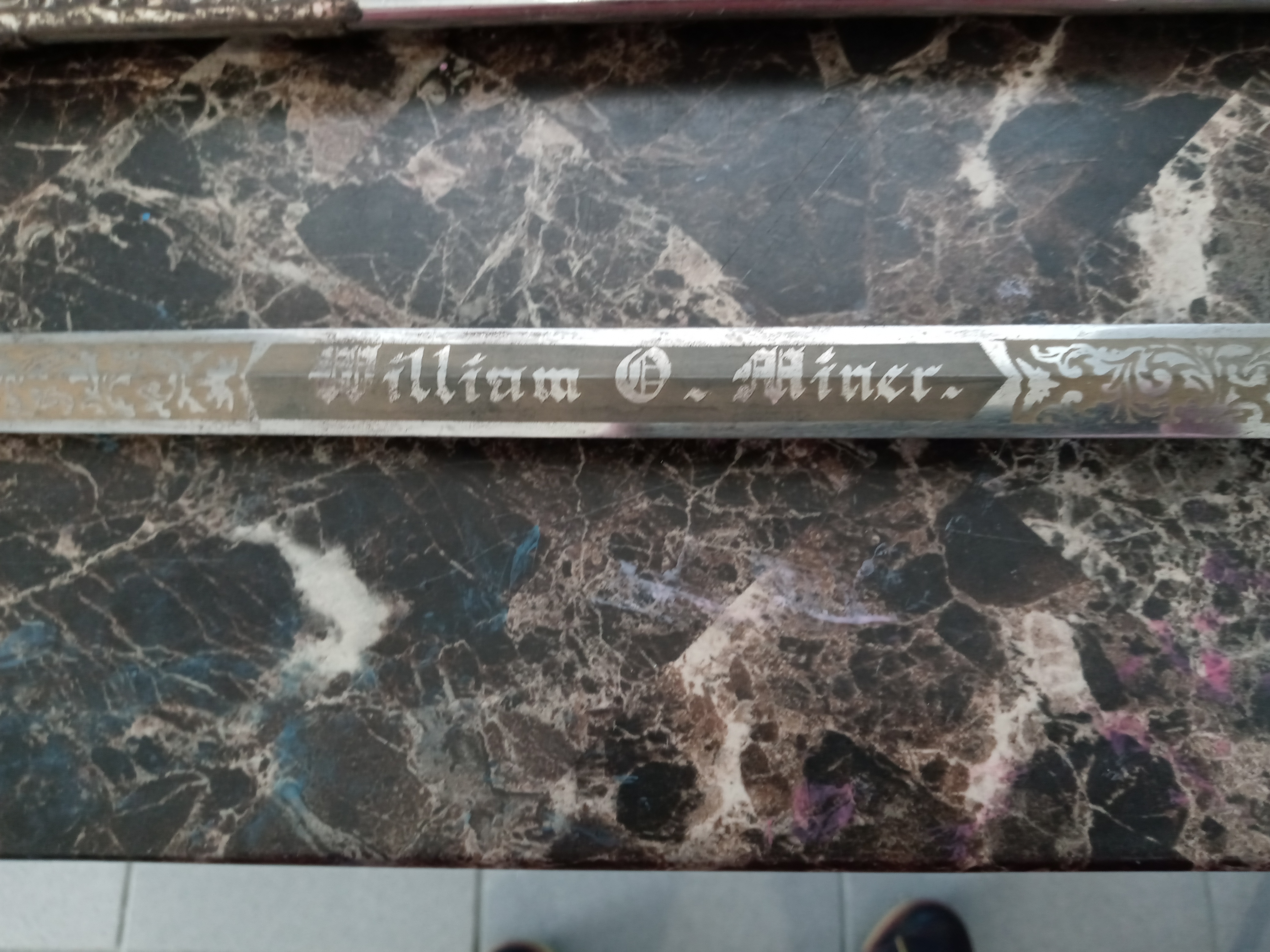 I have an old sword and I'm having trouble figuring out where it came from. I searched by the name on the blade "William O. Miner." I'm not sure if it's a person, or company. I can't find anything about it. It was my ex's dad's and my ex doesn't know where it came from. He didn't want to take it with him in the move. If it's not valuable, I'm going to clean it up and give it to my nephew.