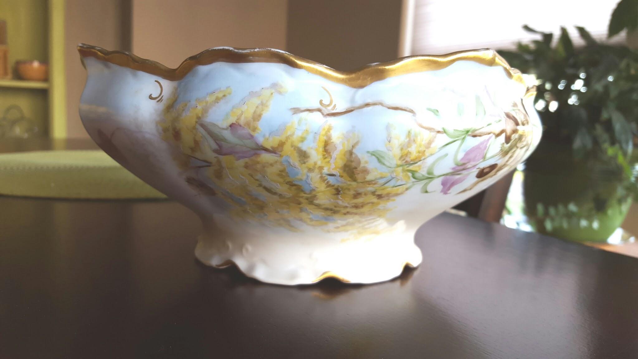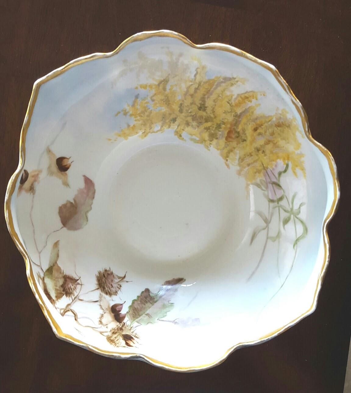 Syracuse OPco China bowl with backstamp dating 1895 -1897. Signed by C. Bruce. Design appears to be goldenrod and thistles. Approximately 8" in diameter × 4 1/2" tall. No cracks or chips and minimal, slight use inside. Very light wearing of gold on top edge.