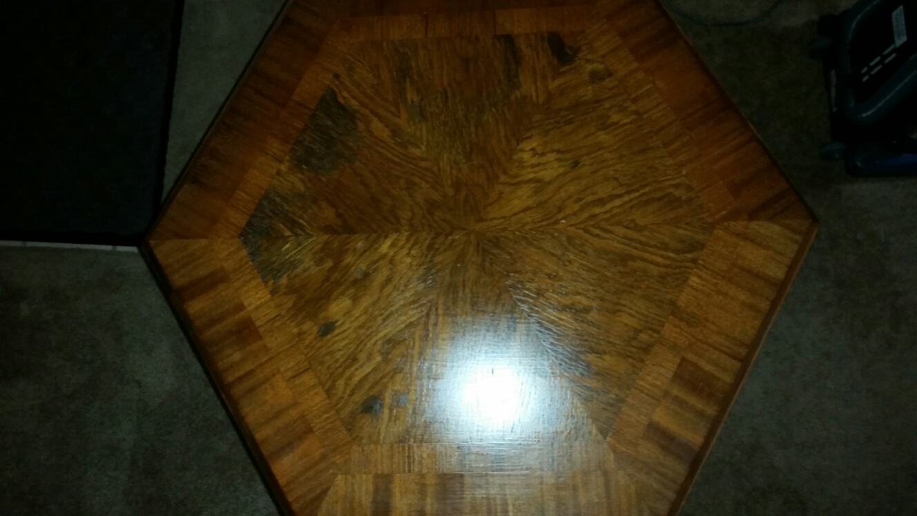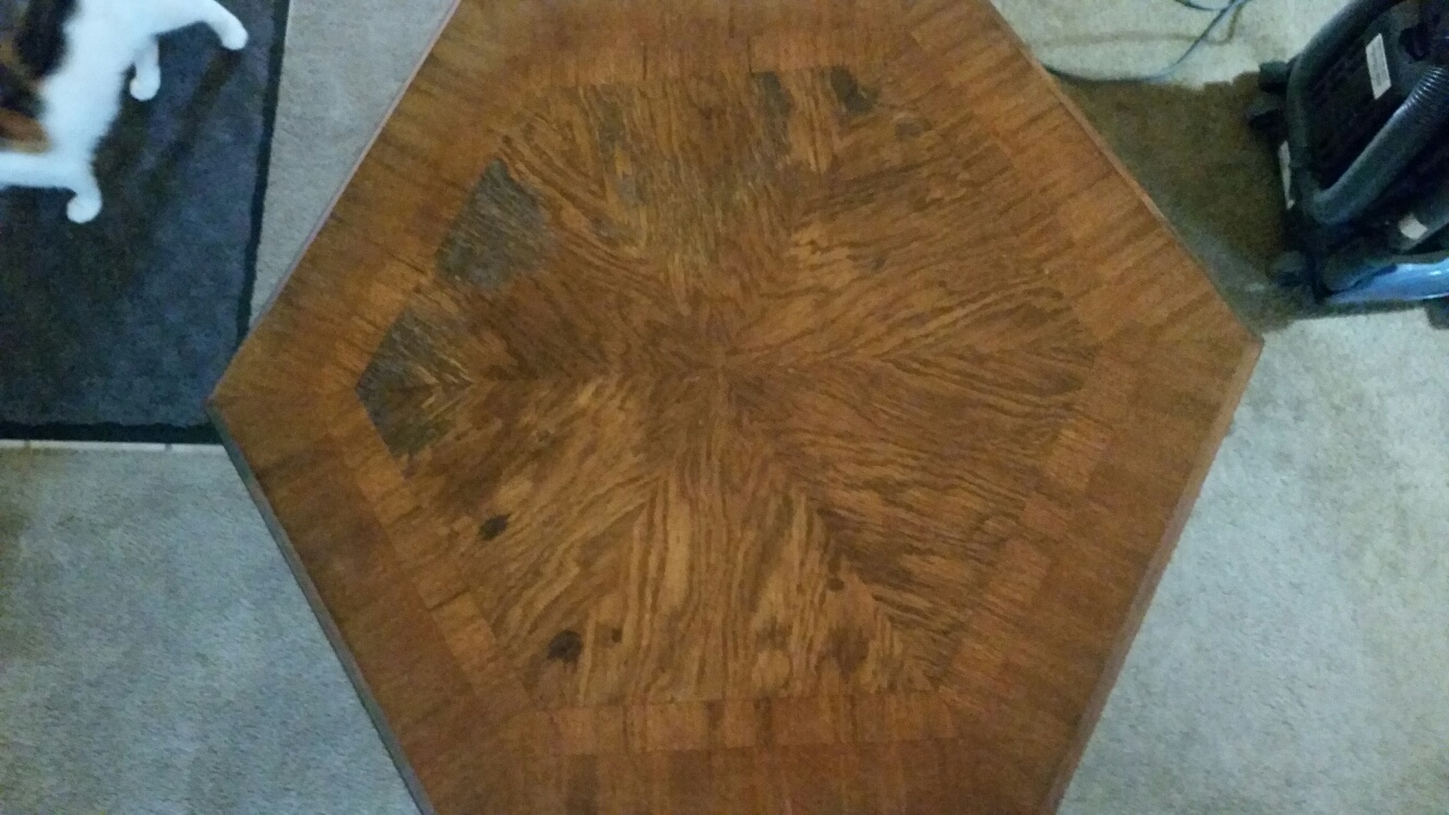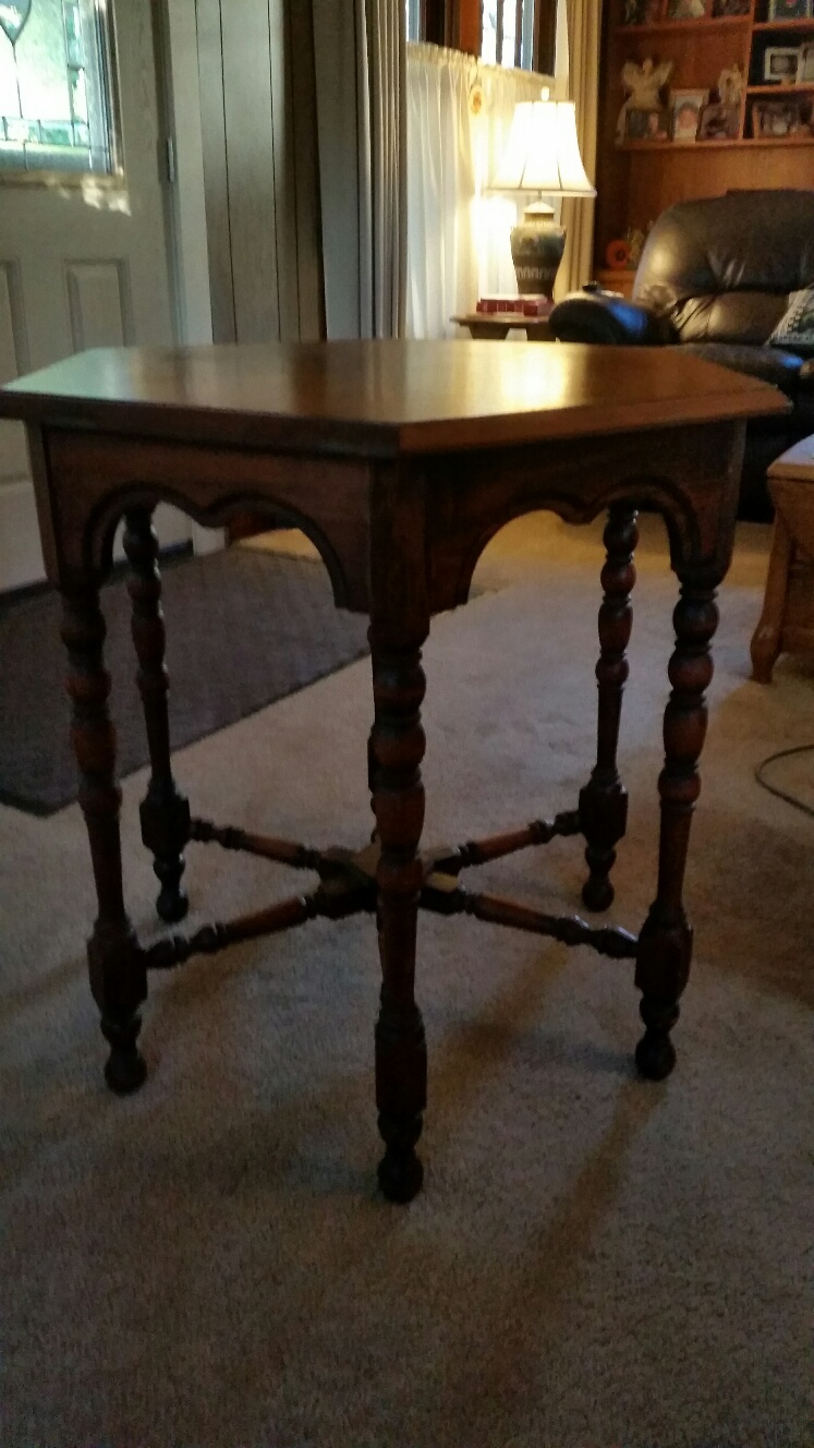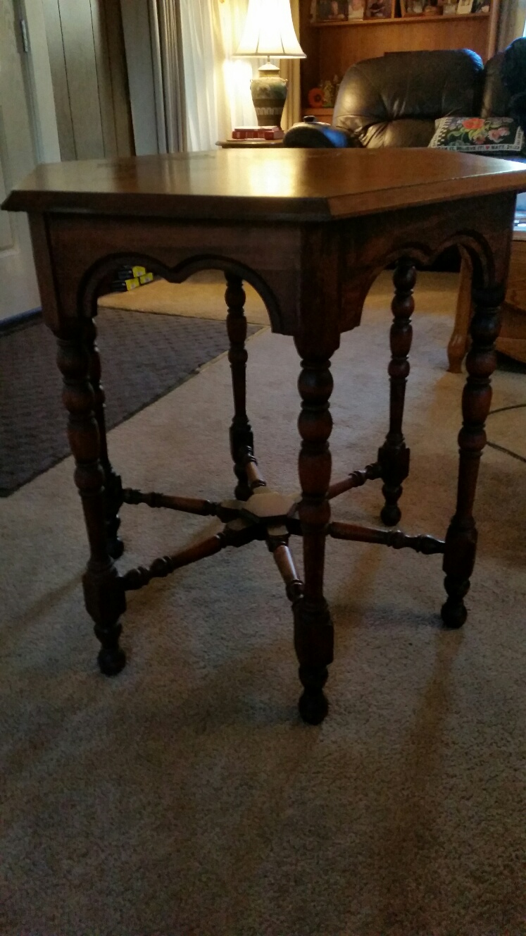 Octagon table with wood inlay (veneer?) top, wood pedestal legs. In my family since early 1900's.