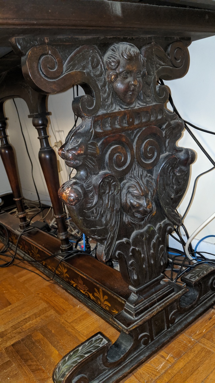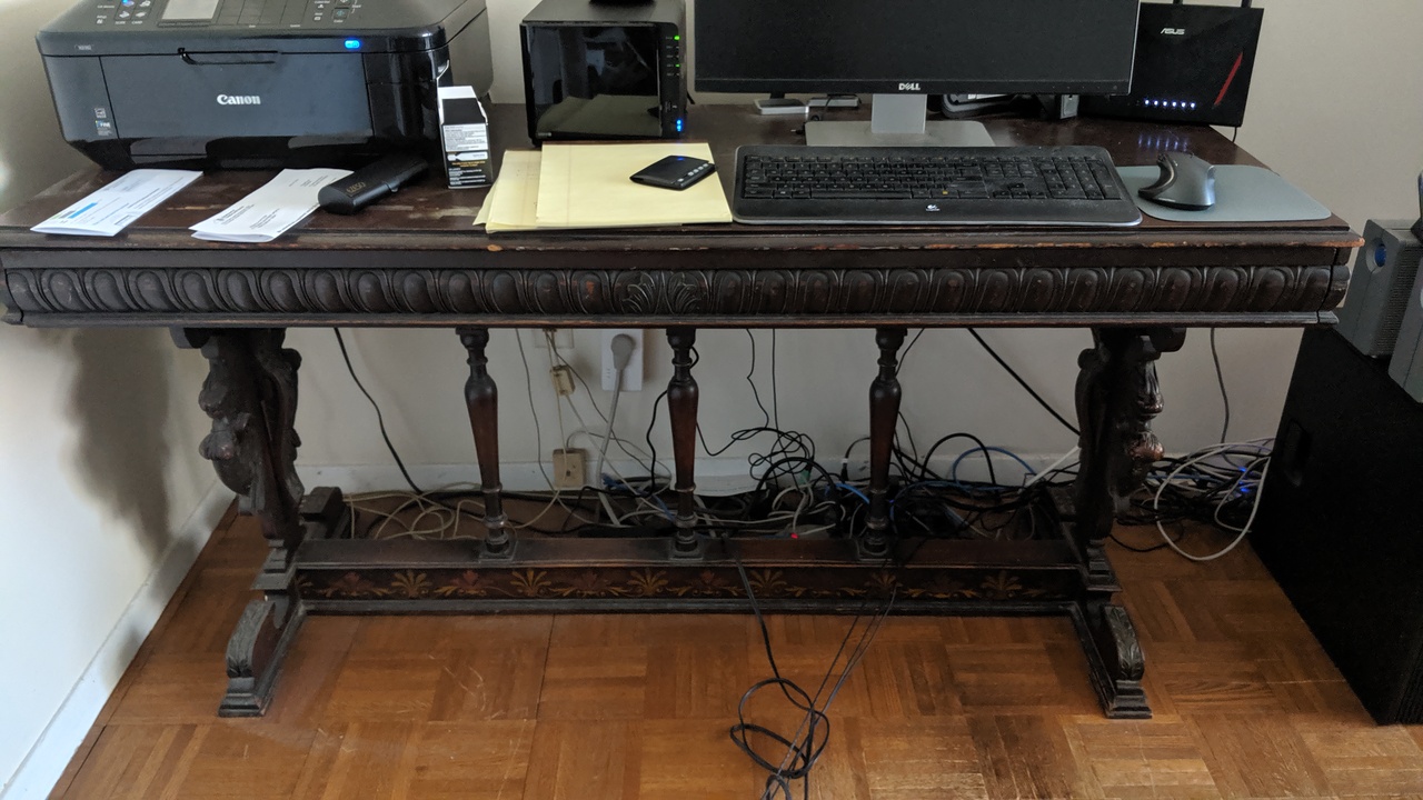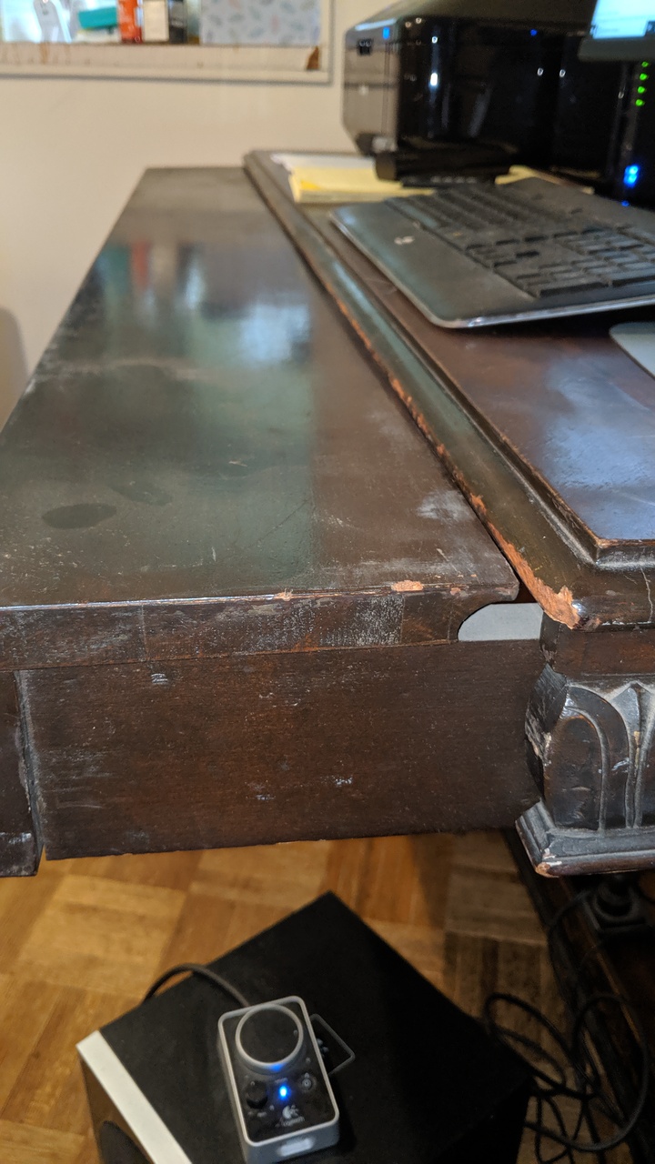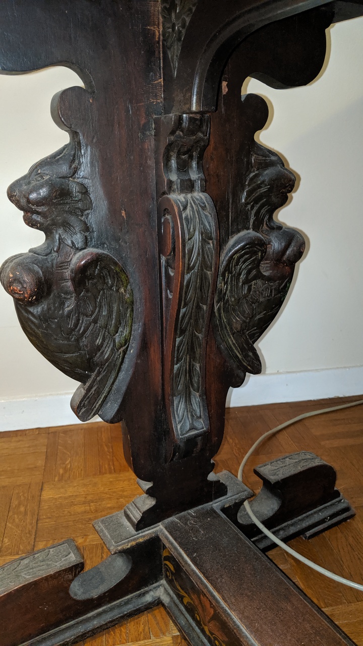 Ornate antique wooden desk/table with slide-out extender mechanism.
