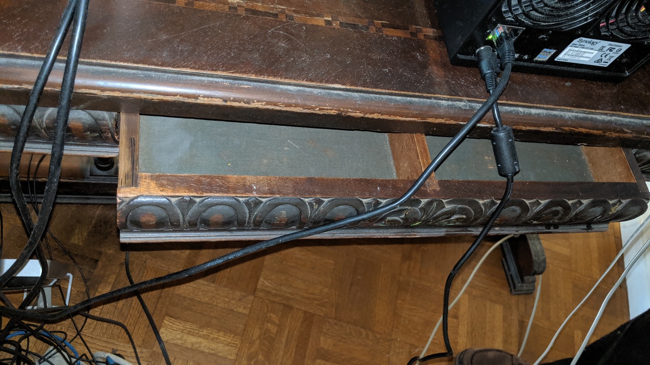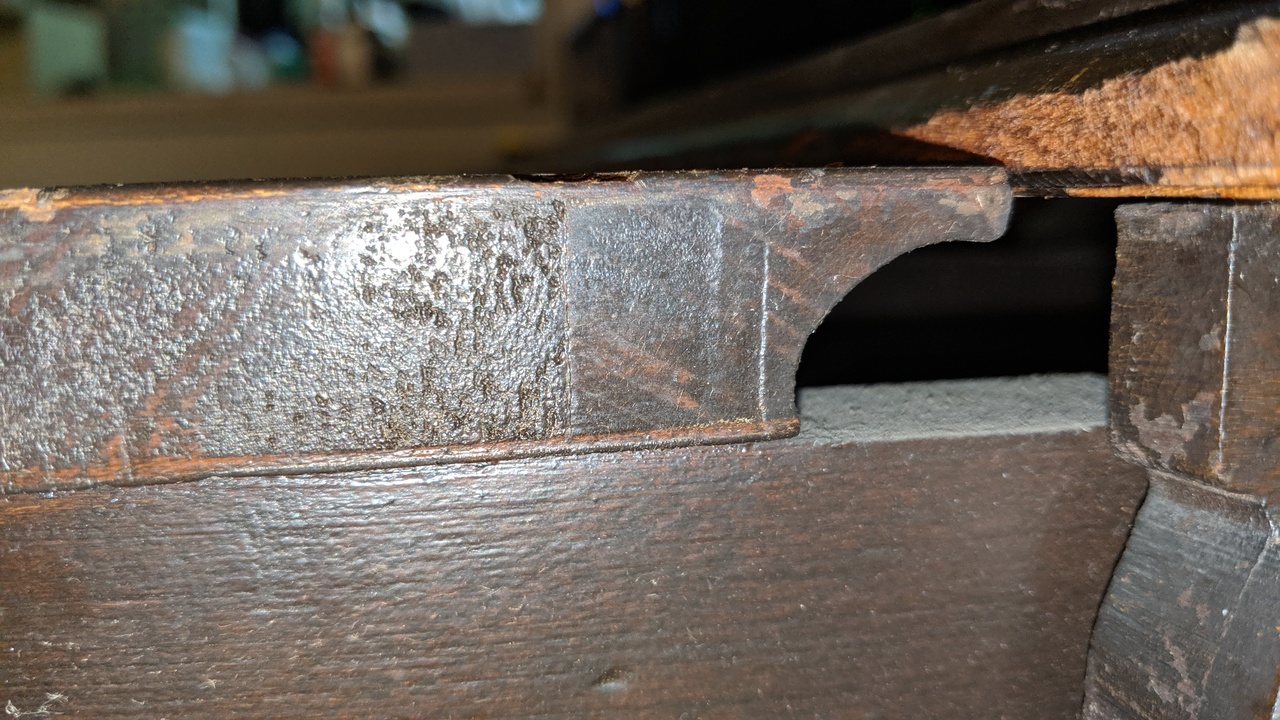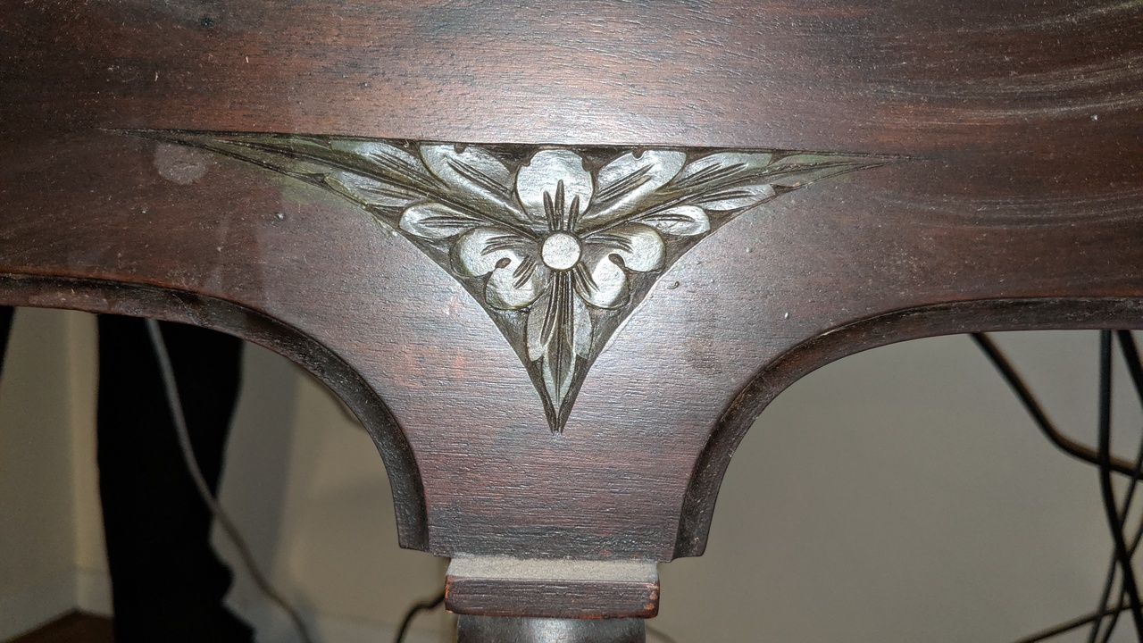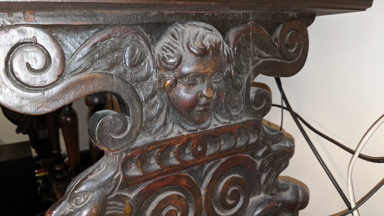 Ornate antique wooden desk/table with slide-out extender mechanism.