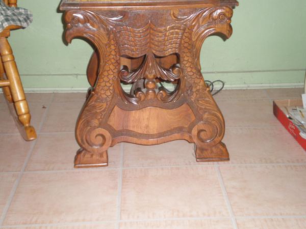 wood carved table with marble top..............measures approx. 19 1/2 x 25 and is approx. 21 inches tall............very heavy probably between 50 to 75 pounds unable to weigh it........