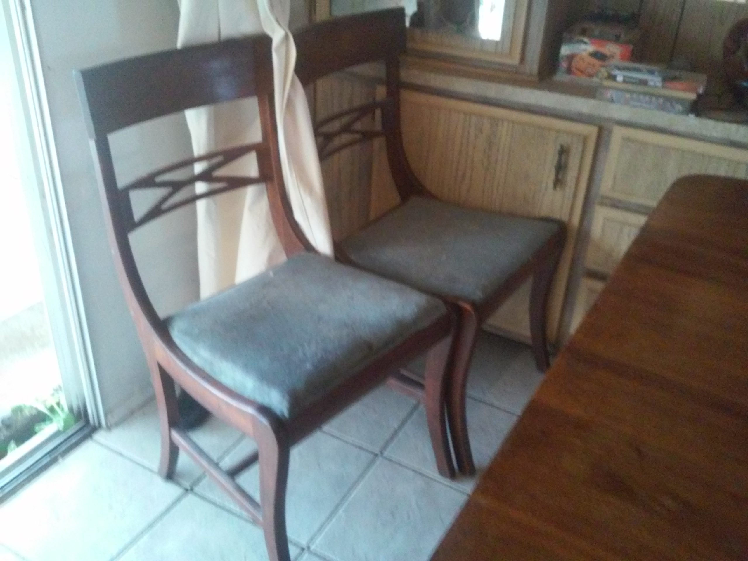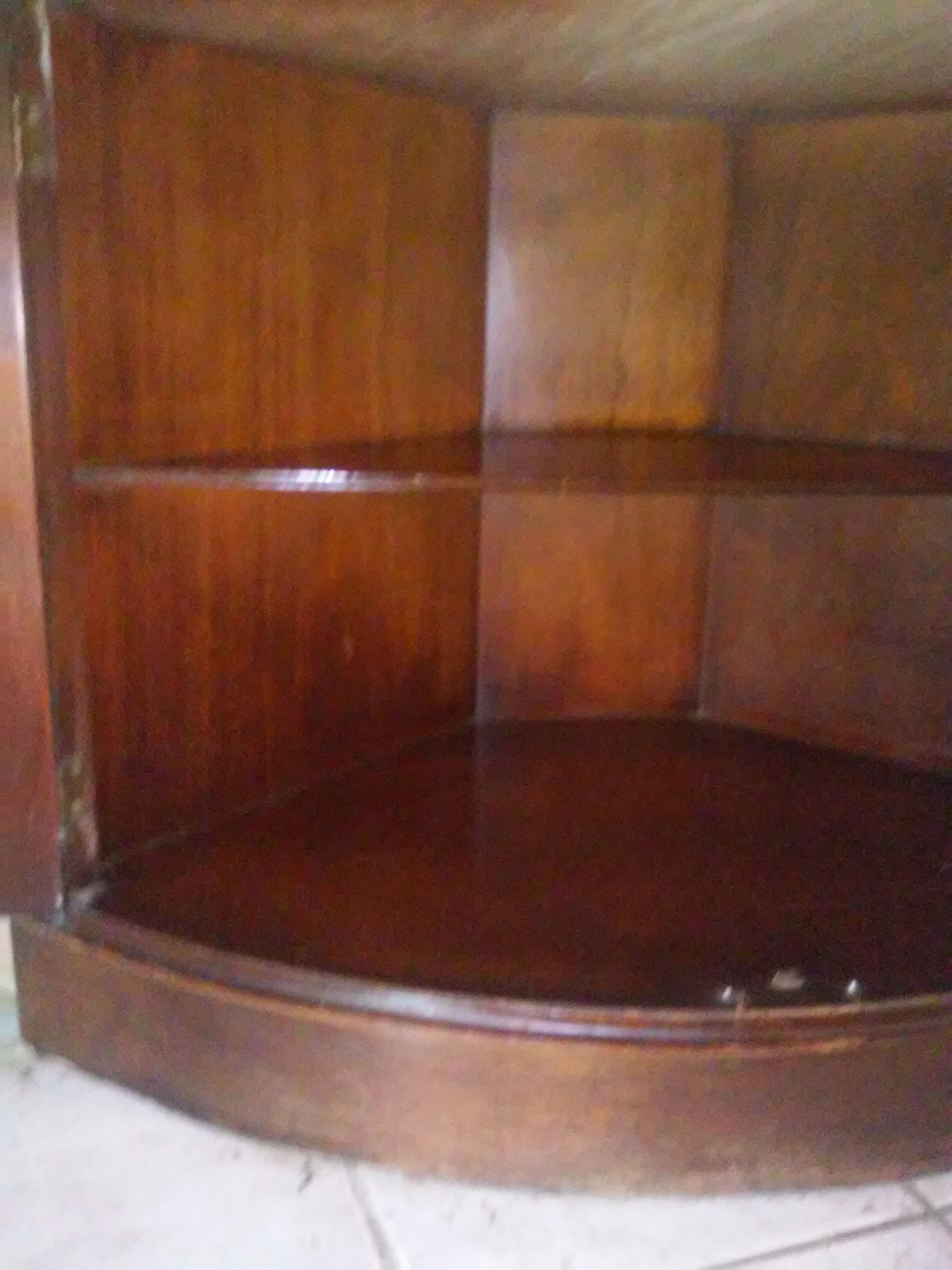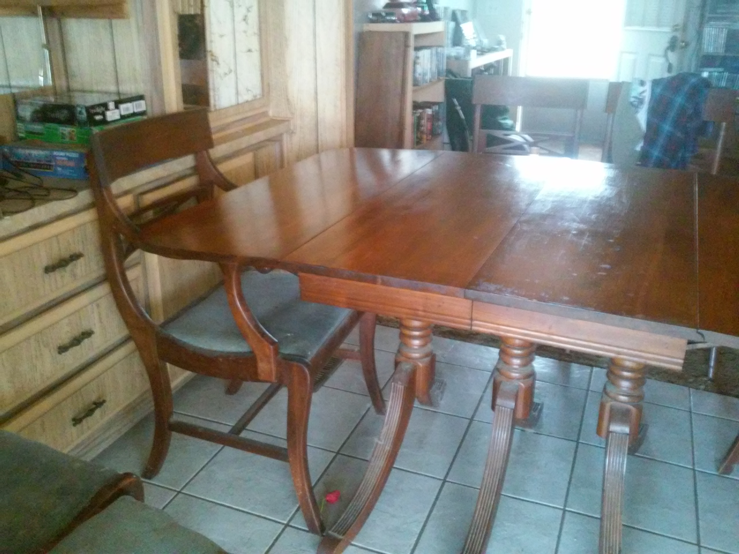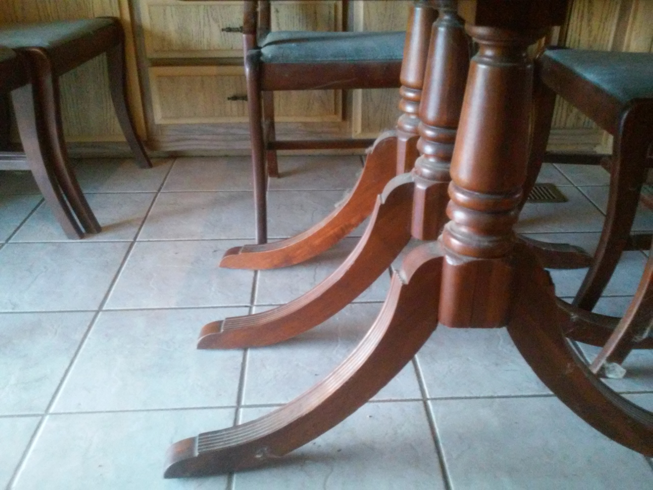 This 8 piece set has been in the family for over 50 years. I inherited it about 14 yrs ago. It has 4 additional leaves to expand the table and the ends of the table fold down via spring load hinges all in working order.. There are 6 chairs 5 regular and one Captain's chair. TheTear shaped Hutch has 3 shelves on top behind glass there is a middle drawer and a storage cabinet under with 1 shelf as well fits into any corner of the house . There are some minor marks on both hutch and table. I am not exactly sure where my grandparents aquired this dining set but I know that it has brought here to Arizona from Wyoming.
