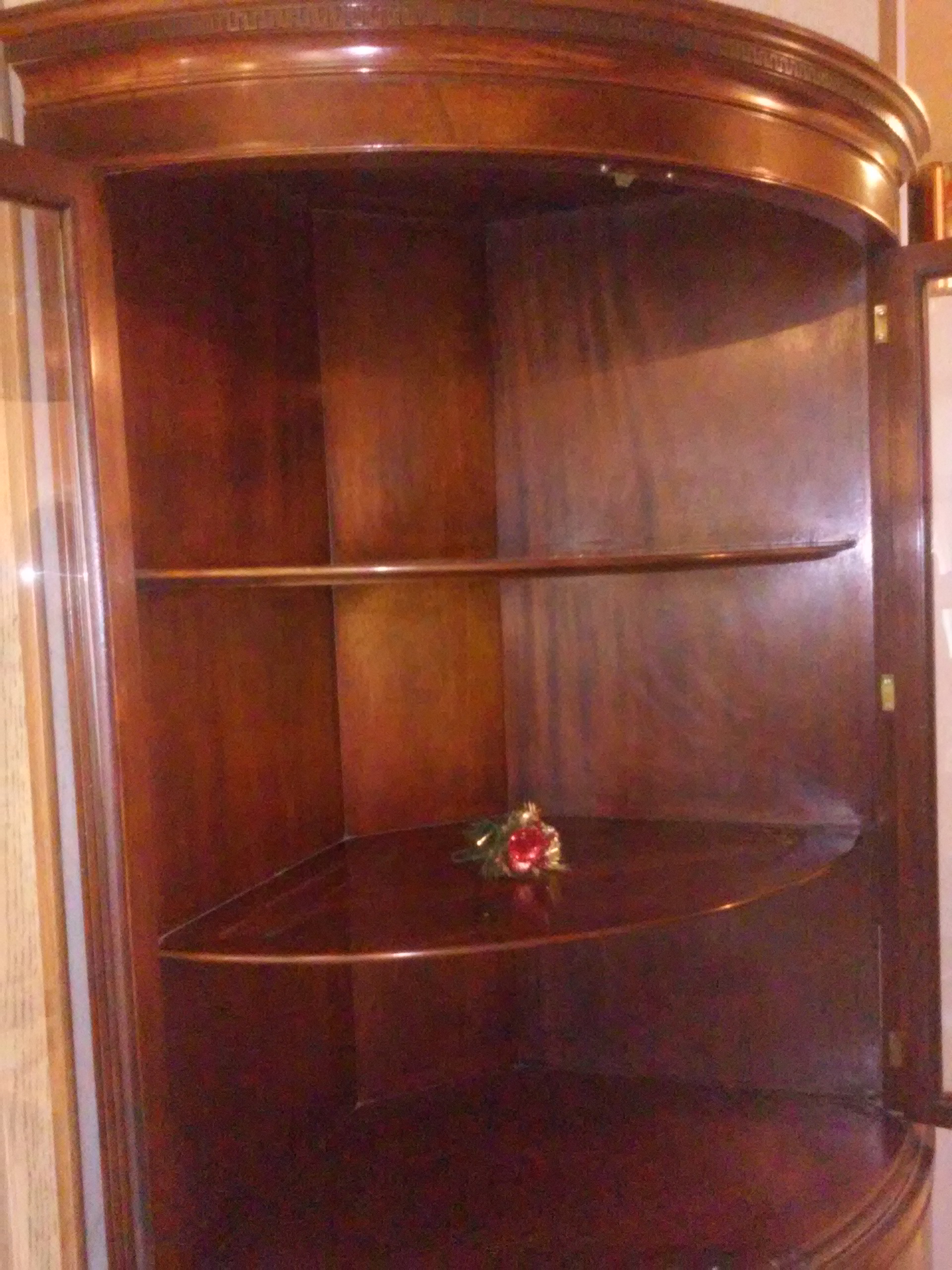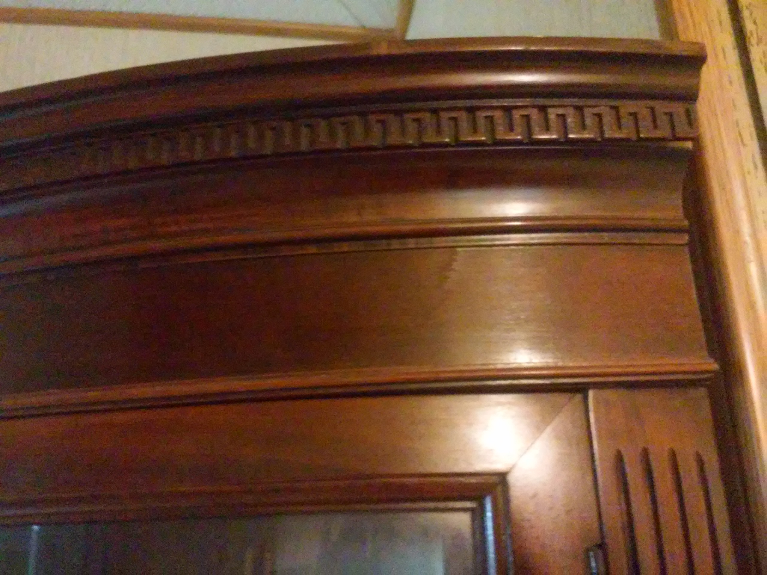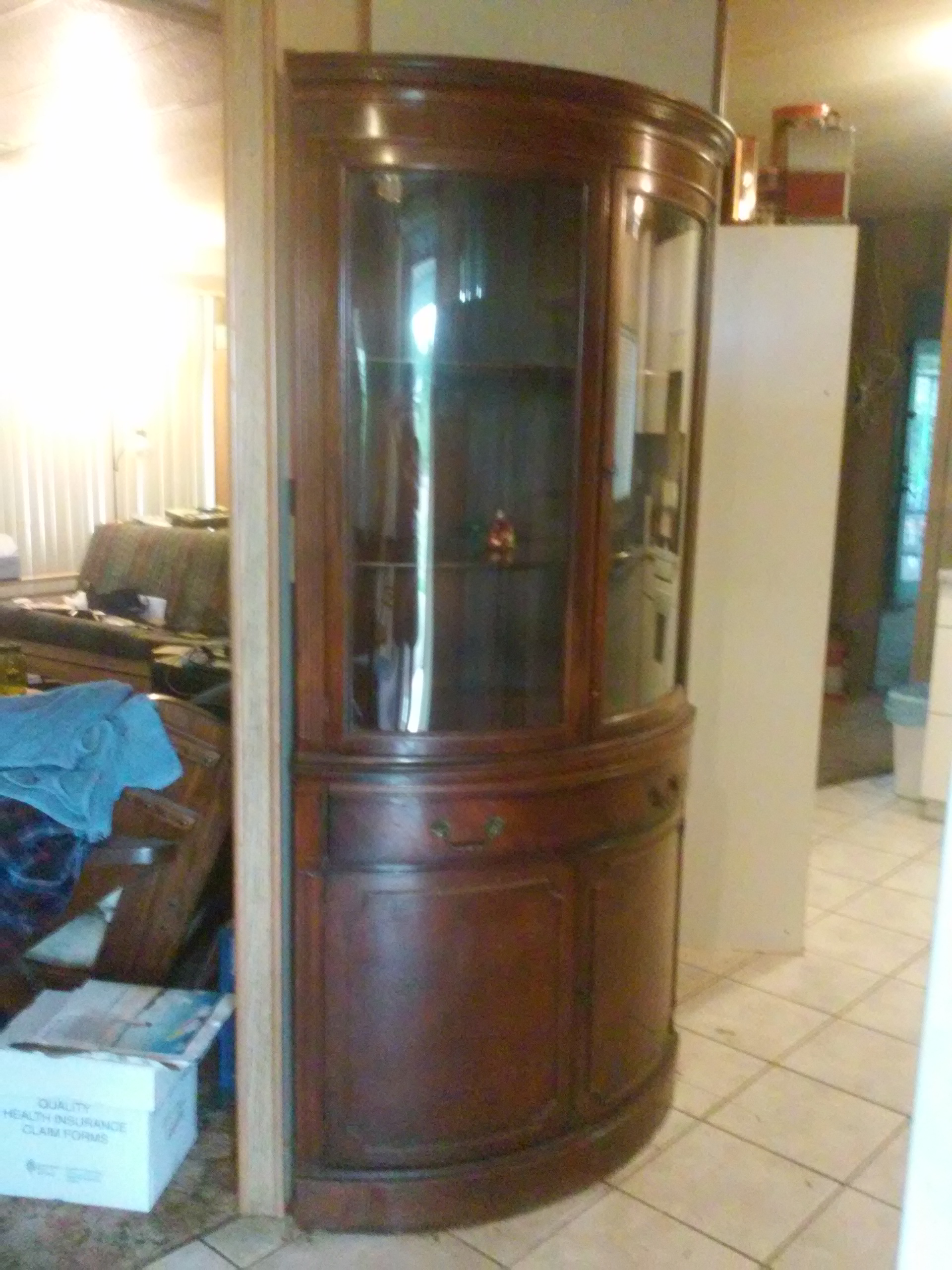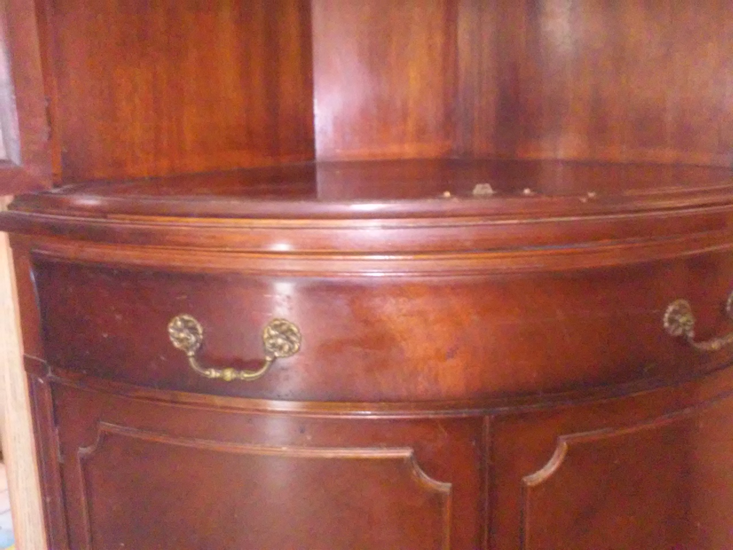This 8 piece set has been in the family for over 50 years. I inherited it about 14 yrs ago. It has 4 additional leaves to expand the table and the ends of the table fold down via spring load hinges all in working order.. There are 6 chairs 5 regular and one Captain's chair. TheTear shaped Hutch has 3 shelves on top behind glass there is a middle drawer and a storage cabinet under with 1 shelf as well fits into any corner of the house . There are some minor marks on both hutch and table. I am not exactly sure where my grandparents aquired this dining set but I know that it has brought here to Arizona from Wyoming.