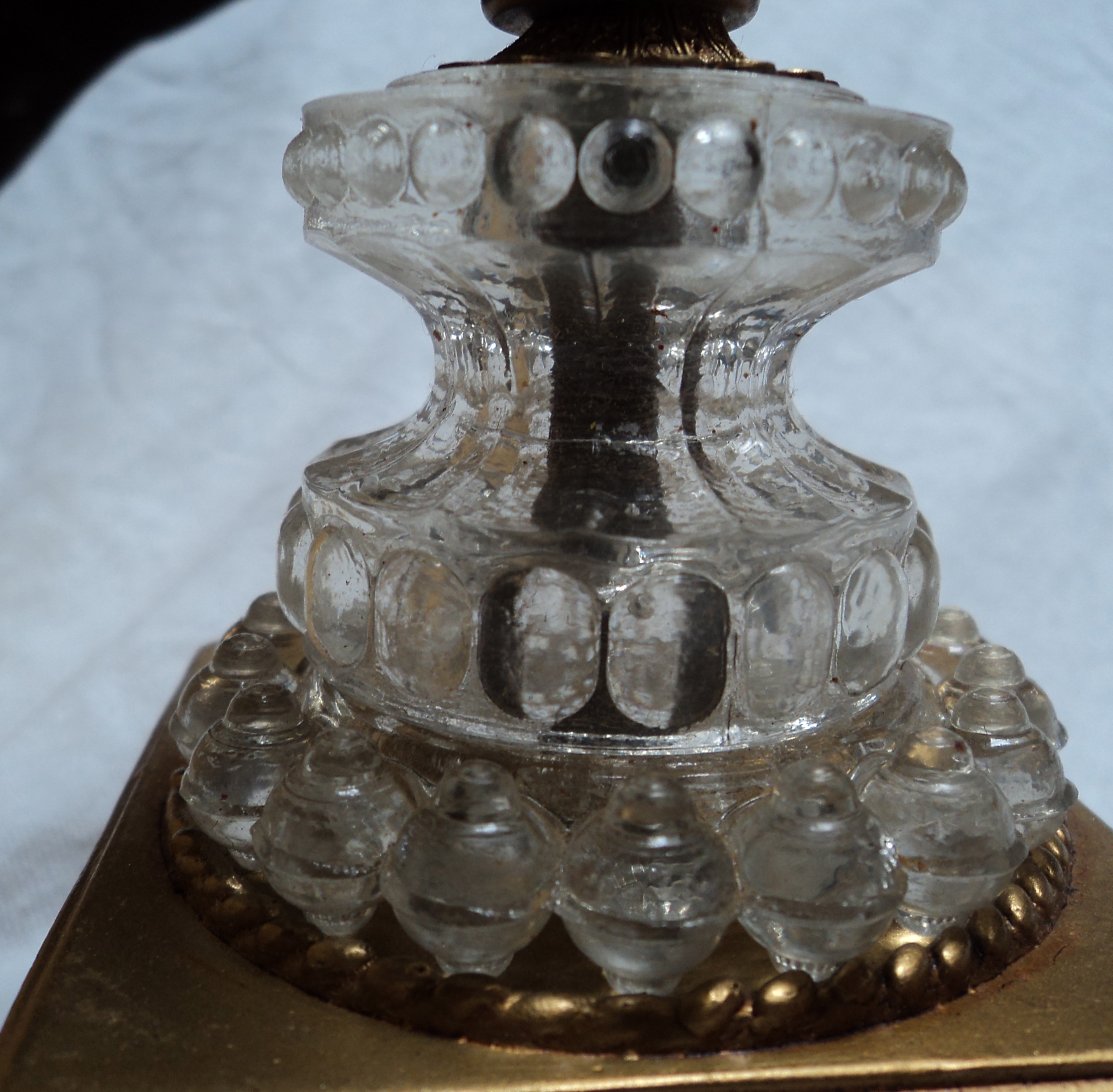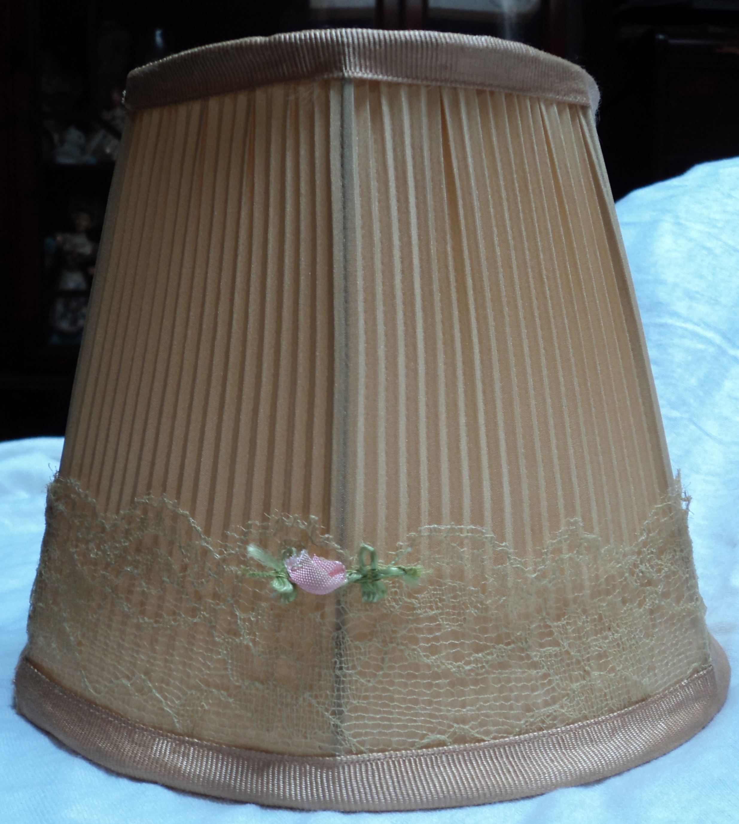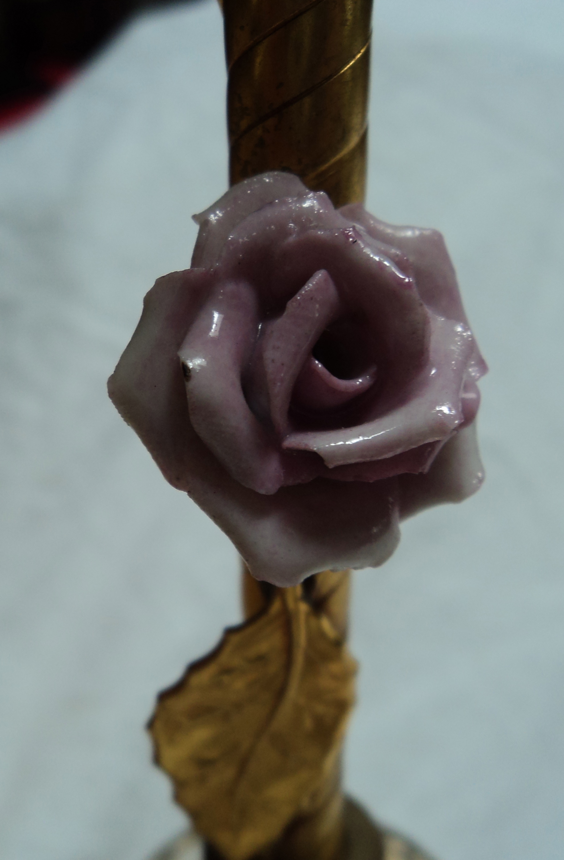 I am almost positive this set is brass with gold colored vines and leaves around the stem. With a single glass rose on each. The base has crystal on it. THe shades are off white fabric with tiny roses and lace detail. The cord is a yellow fabric type.