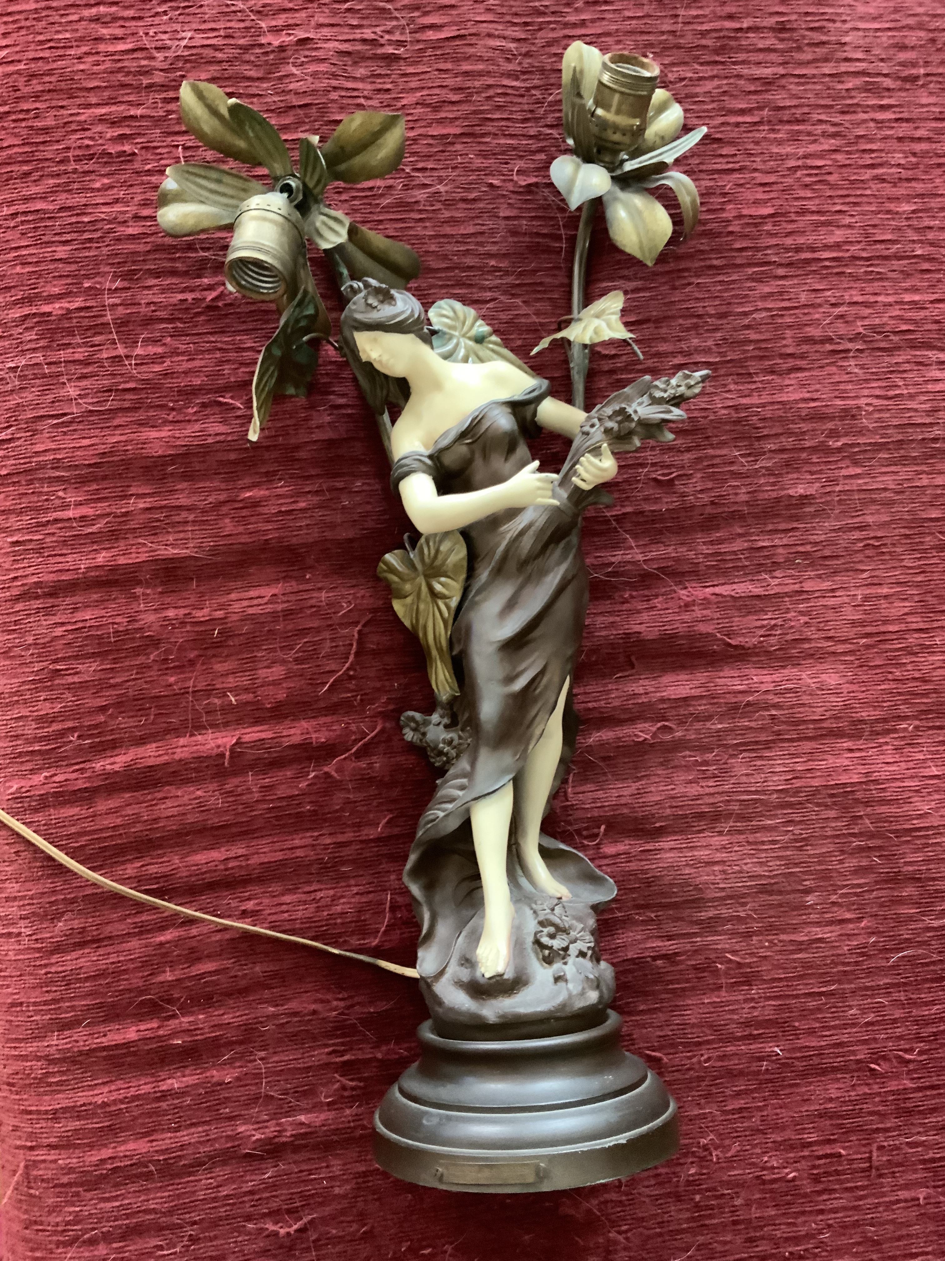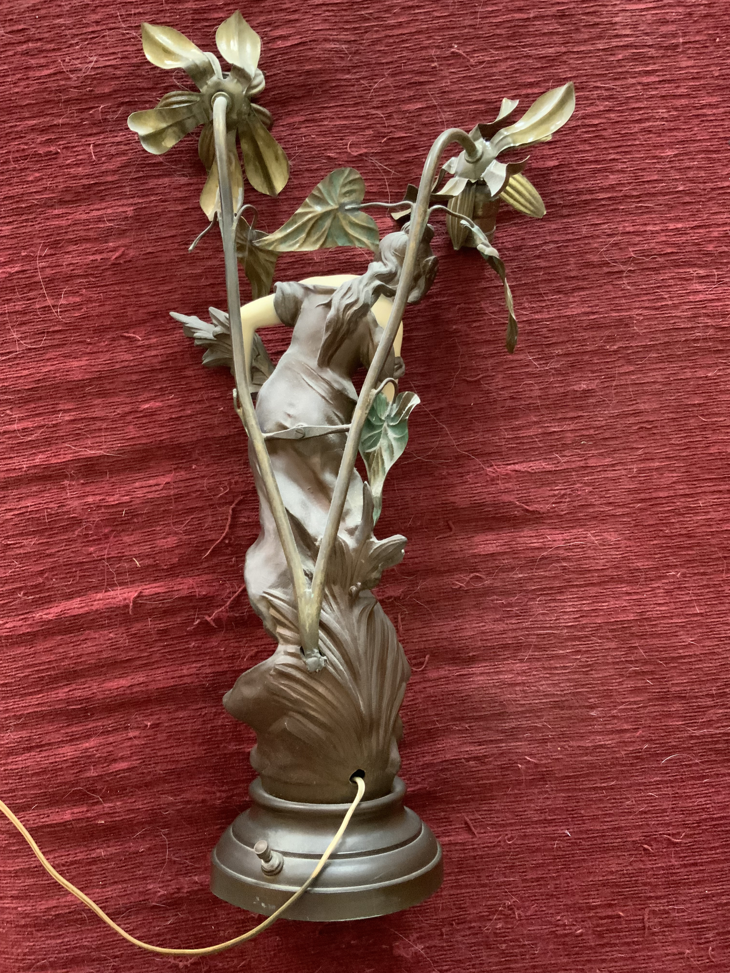 This vintage sculptural table lamp features a detailed figure of a woman, surrounded by ornate floral elements in the Art Nouveau style. Below is a detailed analysis of the lamp's features:
