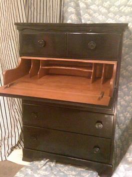 This is a rather unique piece as far as I can tell by the research I've done thus far on it...unique because while it's obviously a tall boy dresser, but not so obvious is the fact that the face of the second drawer actually drops down and the drawer pulls out revealing a lovely secretary desk! It's either solid mahogany or maple wood....I'm leaning towards mahogany....I'm guessing that "Burns" was the Mfg. and "C.R. Stewart & Sons" the seller...."C.R. Stewart" stands for "Calvin Reed" Stewart who was a funeral director/casket maker who lived in the 1800's...I originally thought he was the maker, but have been told that it was Burns who was.....some nit-wit previous owner had the bright idea to spray paint the exterior of the piece w/gloss black ....did a fairly decent job on most of it, but far from "perfect".....I am interested in selling this piece and am hoping for feedback from this community as to what a fair and reasonable selling price might be. Thanks and warm regards from sunny and insanely hot, Scottsdale, AZ!!