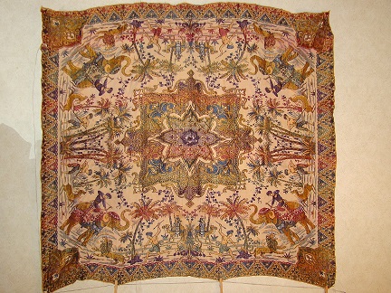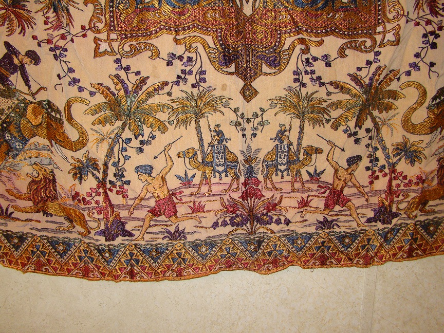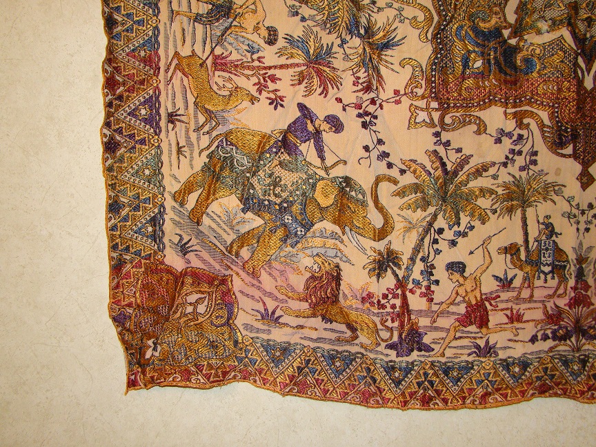 Features men wearing turbins riding elephants shooting arrows at lions, deer.. large star centers the almost 50 inch square hanging. multiple colors border and embelish this beautiful cloth.