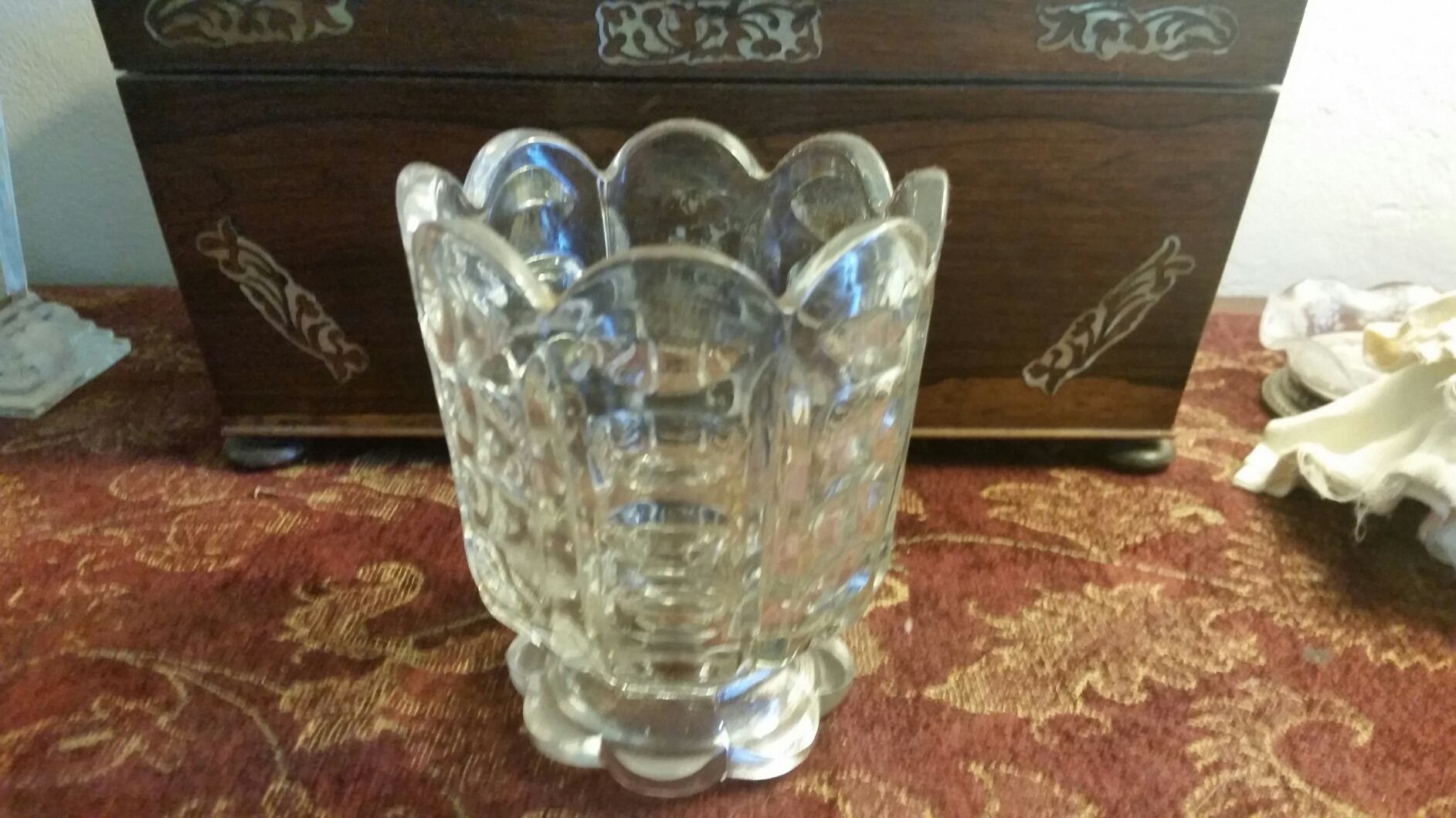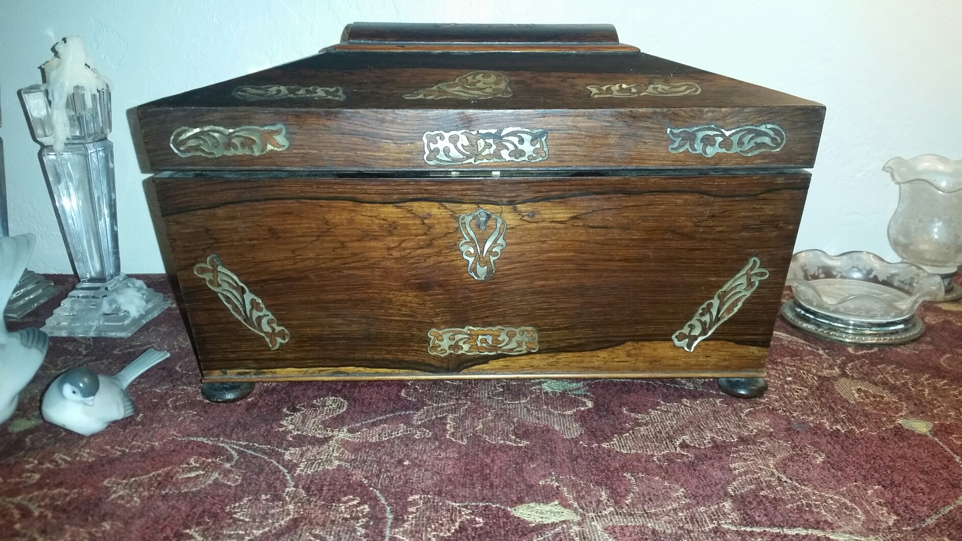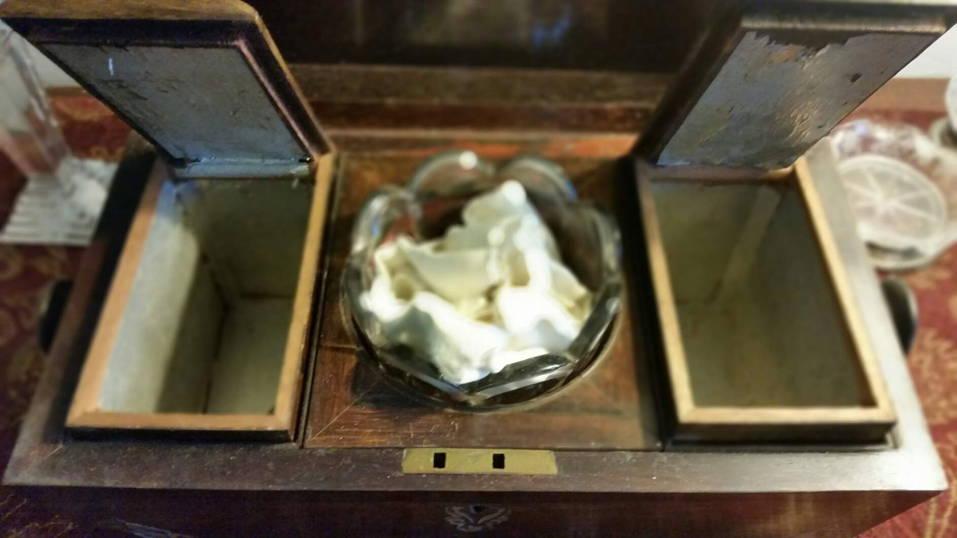 Description Tea box. Mother of pearl inlay. Crystal bowl. Original napkin.