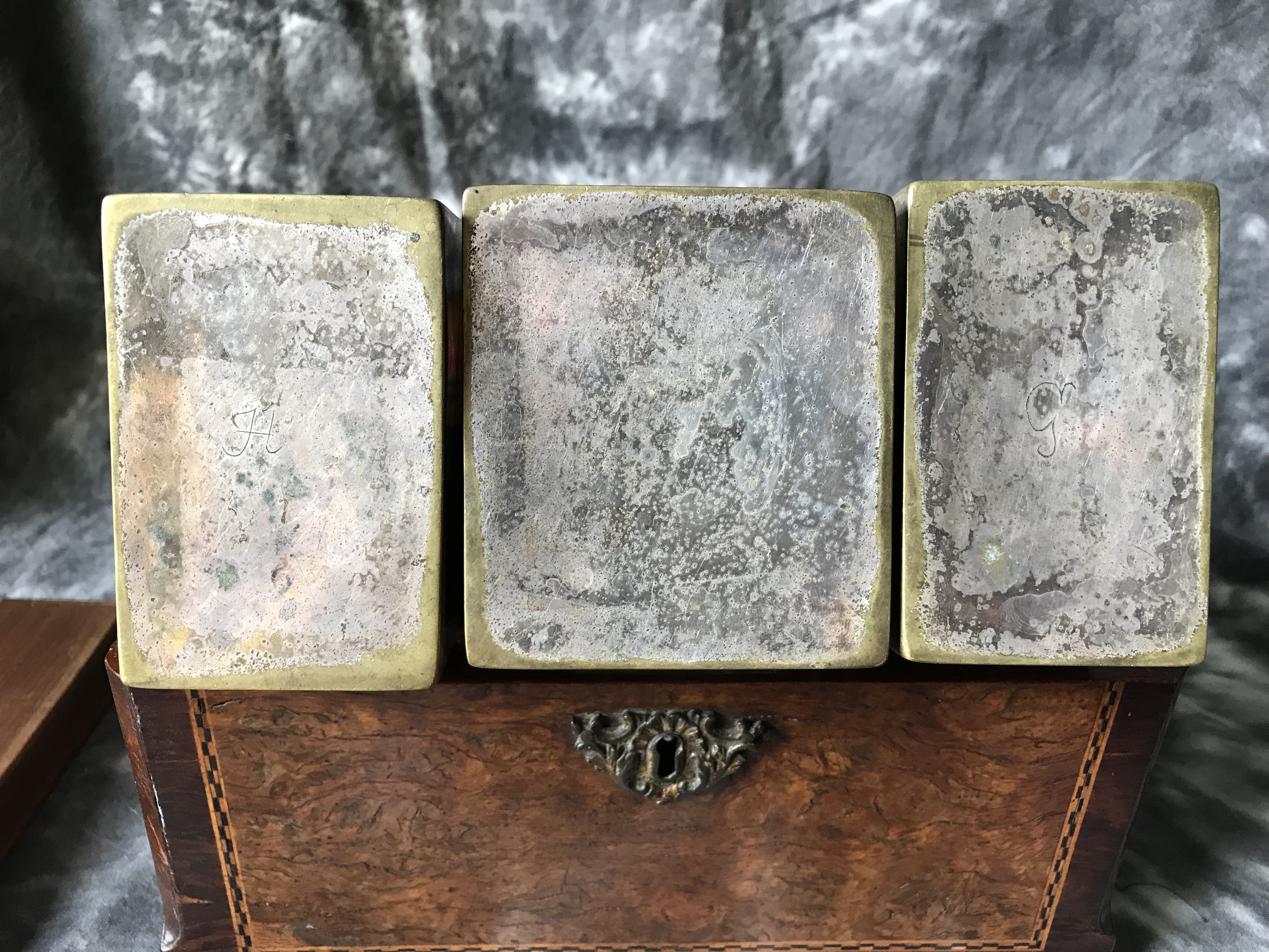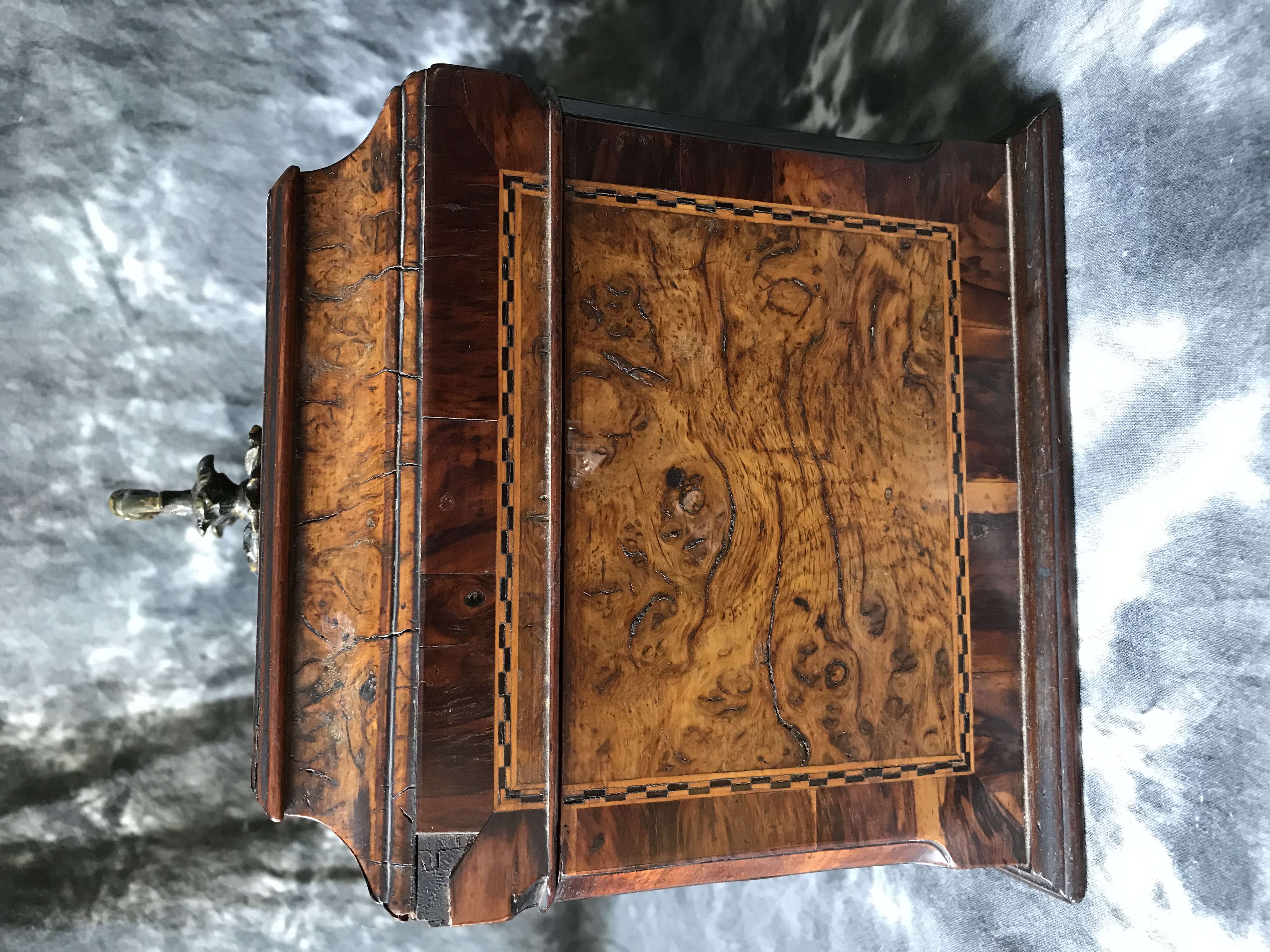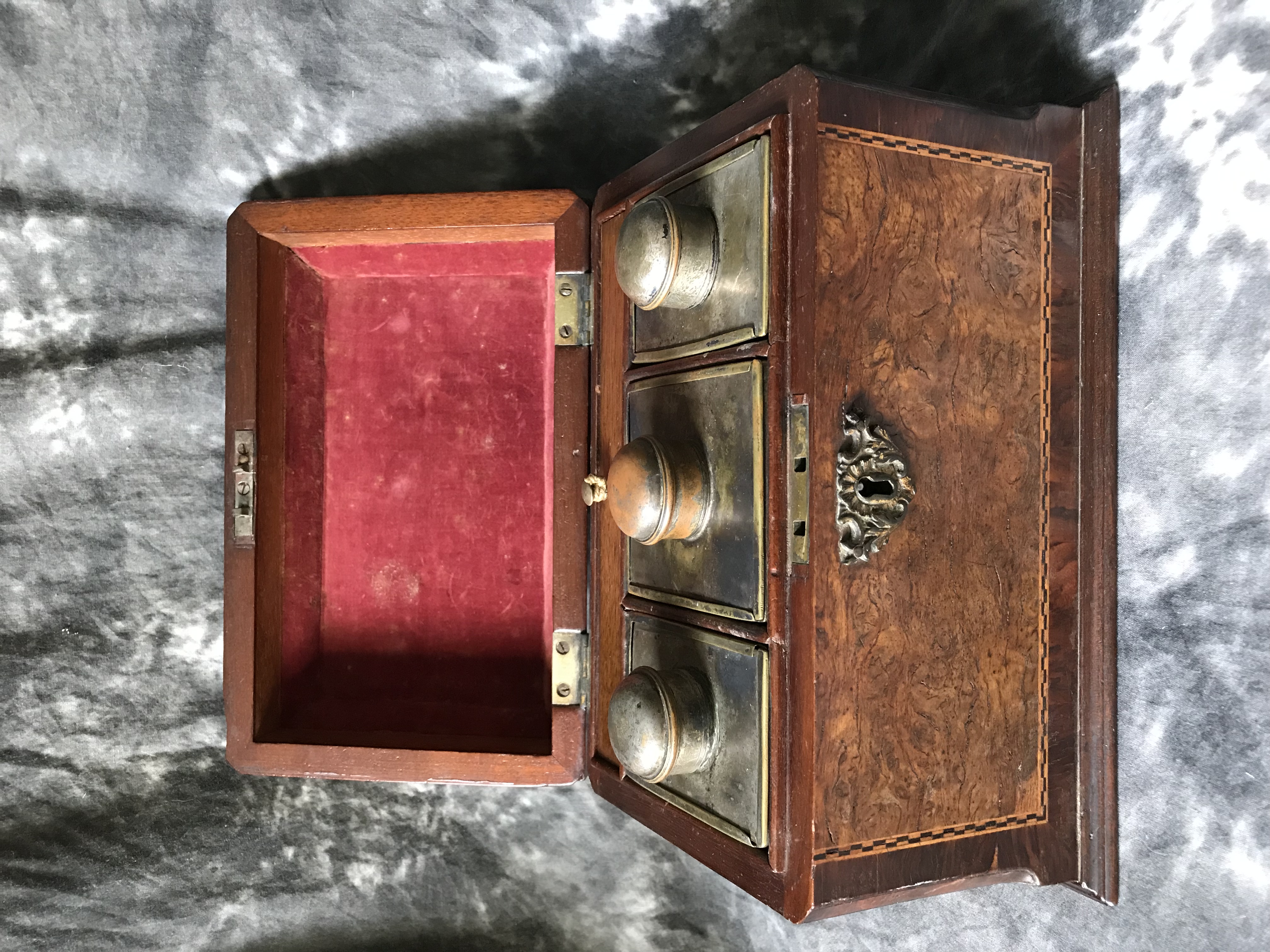 I purchased this tea caddy from a thrift store recently, so I have no history on it. There are several areas on the exterior with missing pieces of veneer. Vertical interior drawer inside with key, and 3 heavy metal containers with sliding lids. A “J” and a “G” inscribed on 2 canisters. Looking for info as to age, manufacturer, and idea as to value. Any help appreciated!