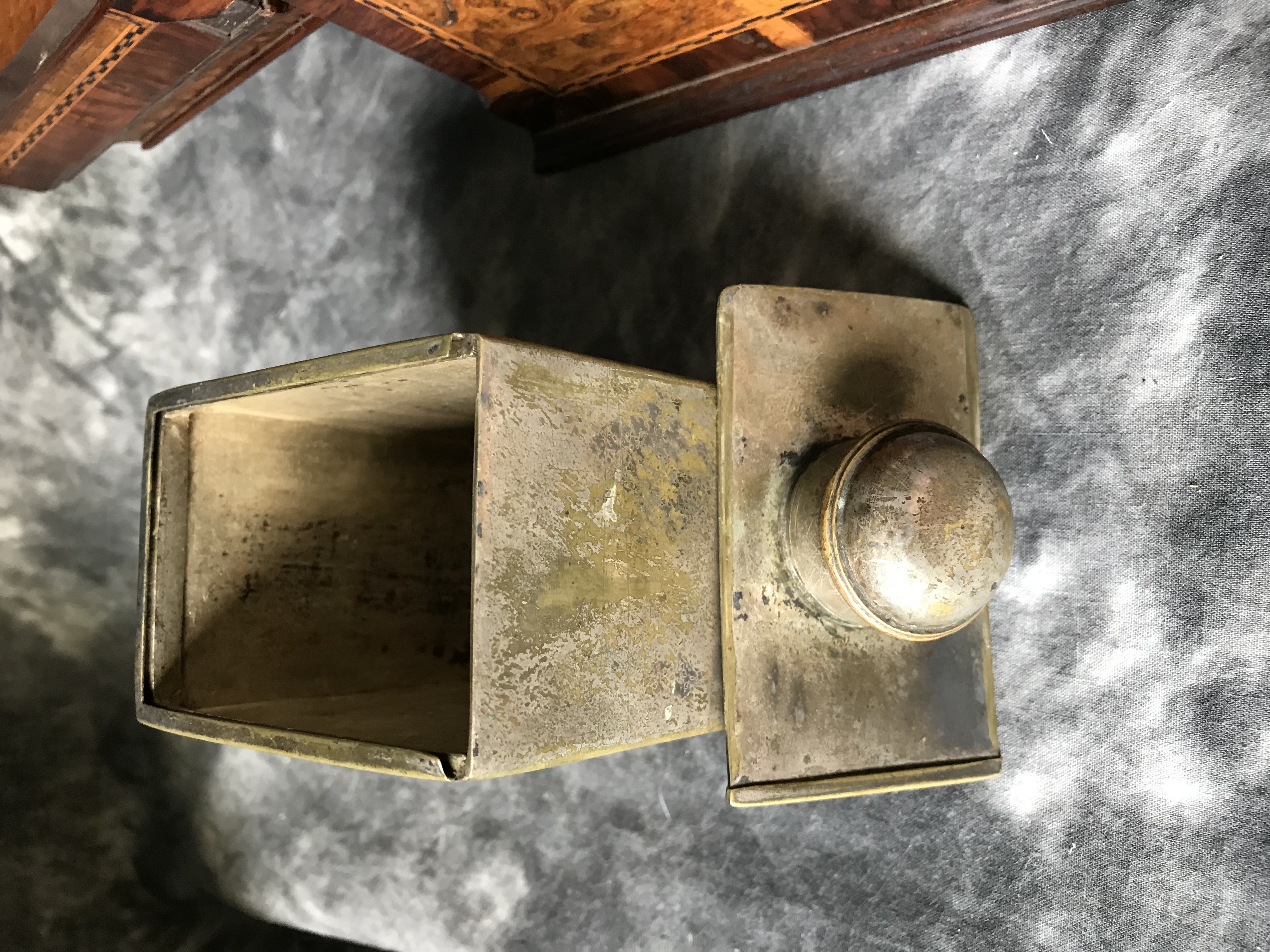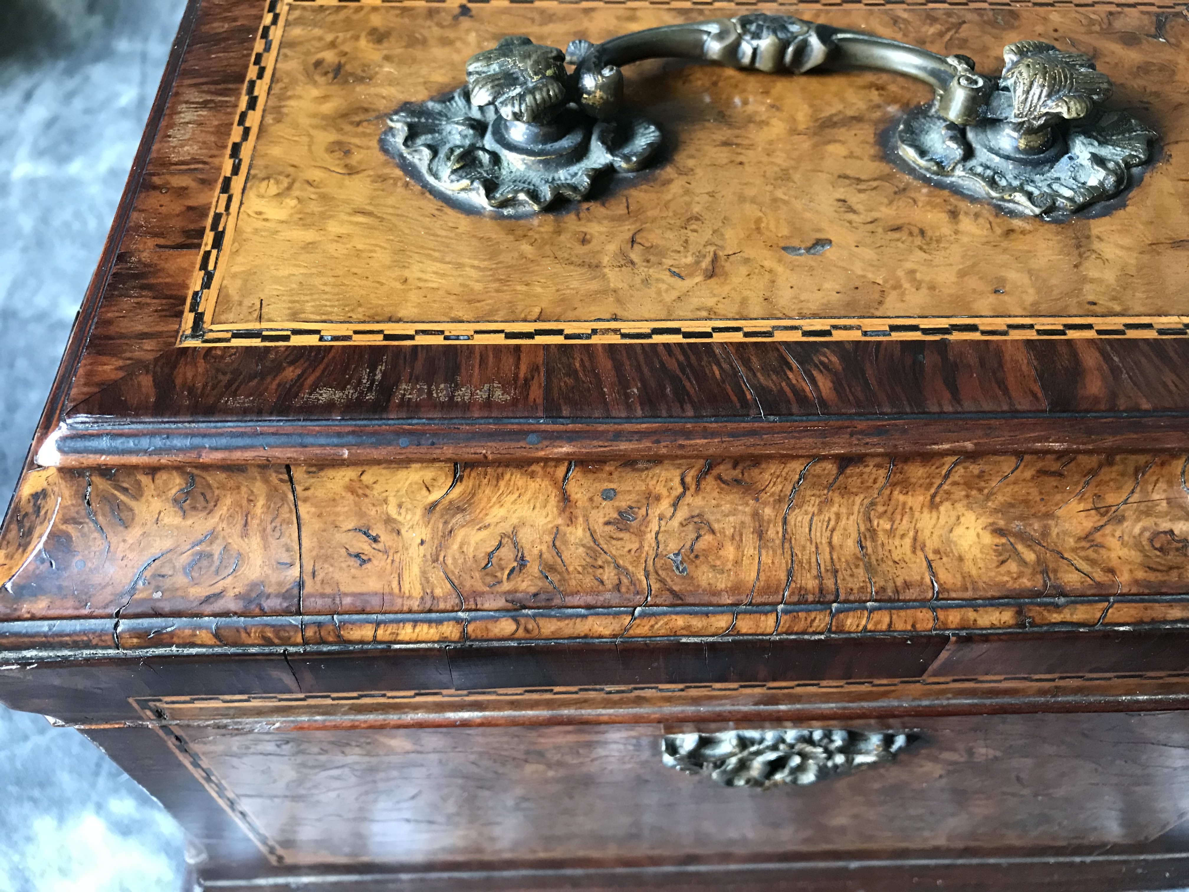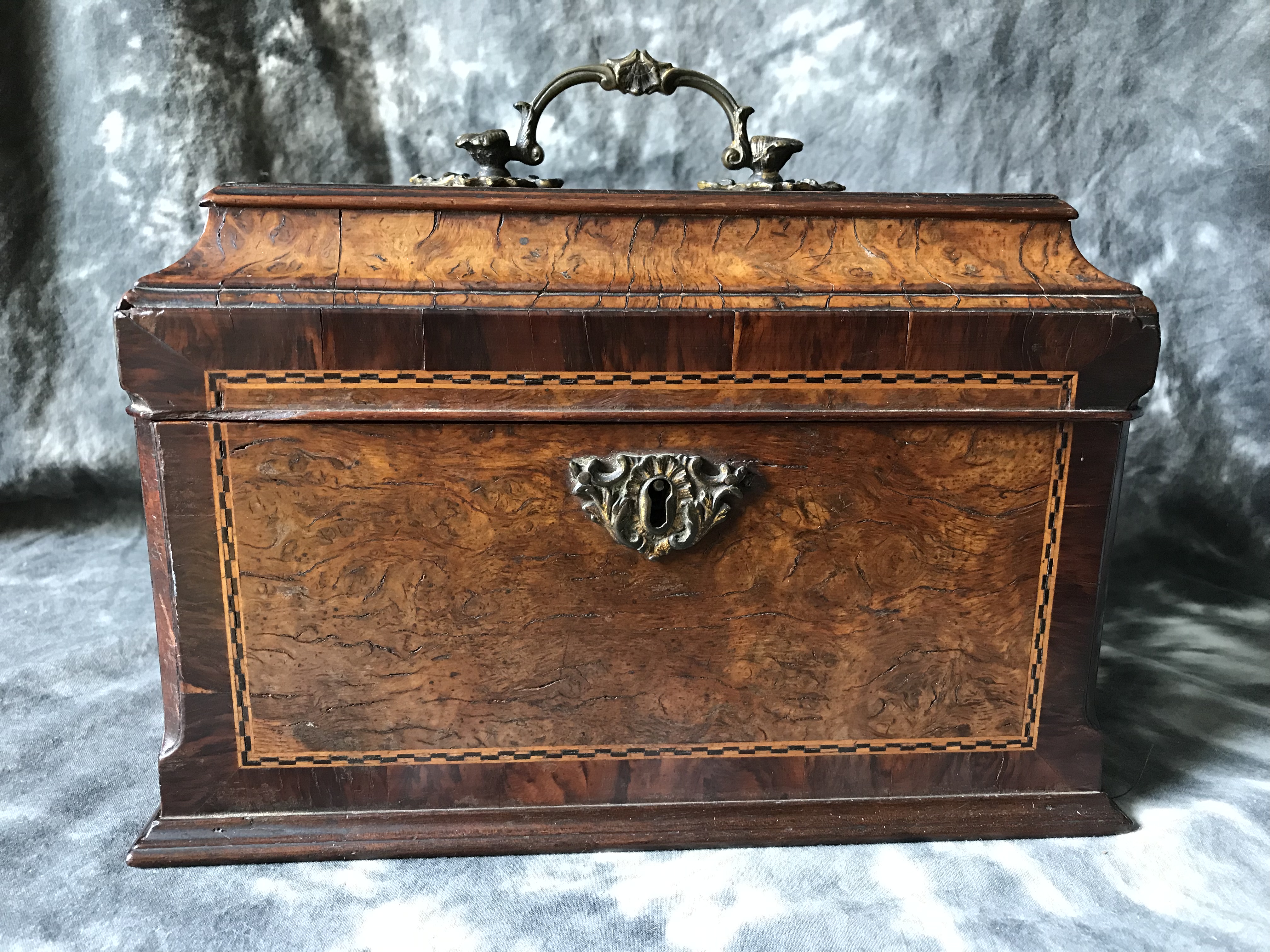 I purchased this tea caddy from a thrift store recently, so I have no history on it. There are several areas on the exterior with missing pieces of veneer. Vertical interior drawer inside with key, and 3 heavy metal containers with sliding lids. A “J” and a “G” inscribed on 2 canisters. Looking for info as to age, manufacturer, and idea as to value. Any help appreciated!