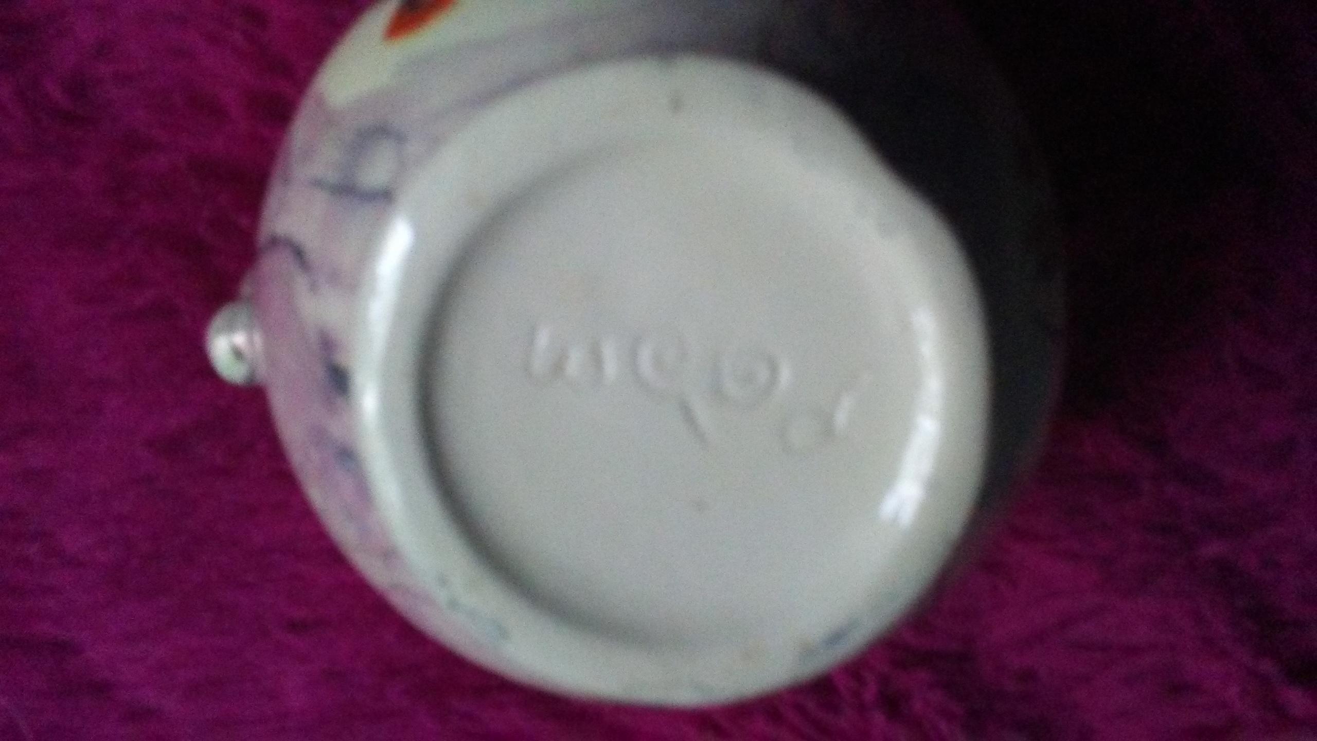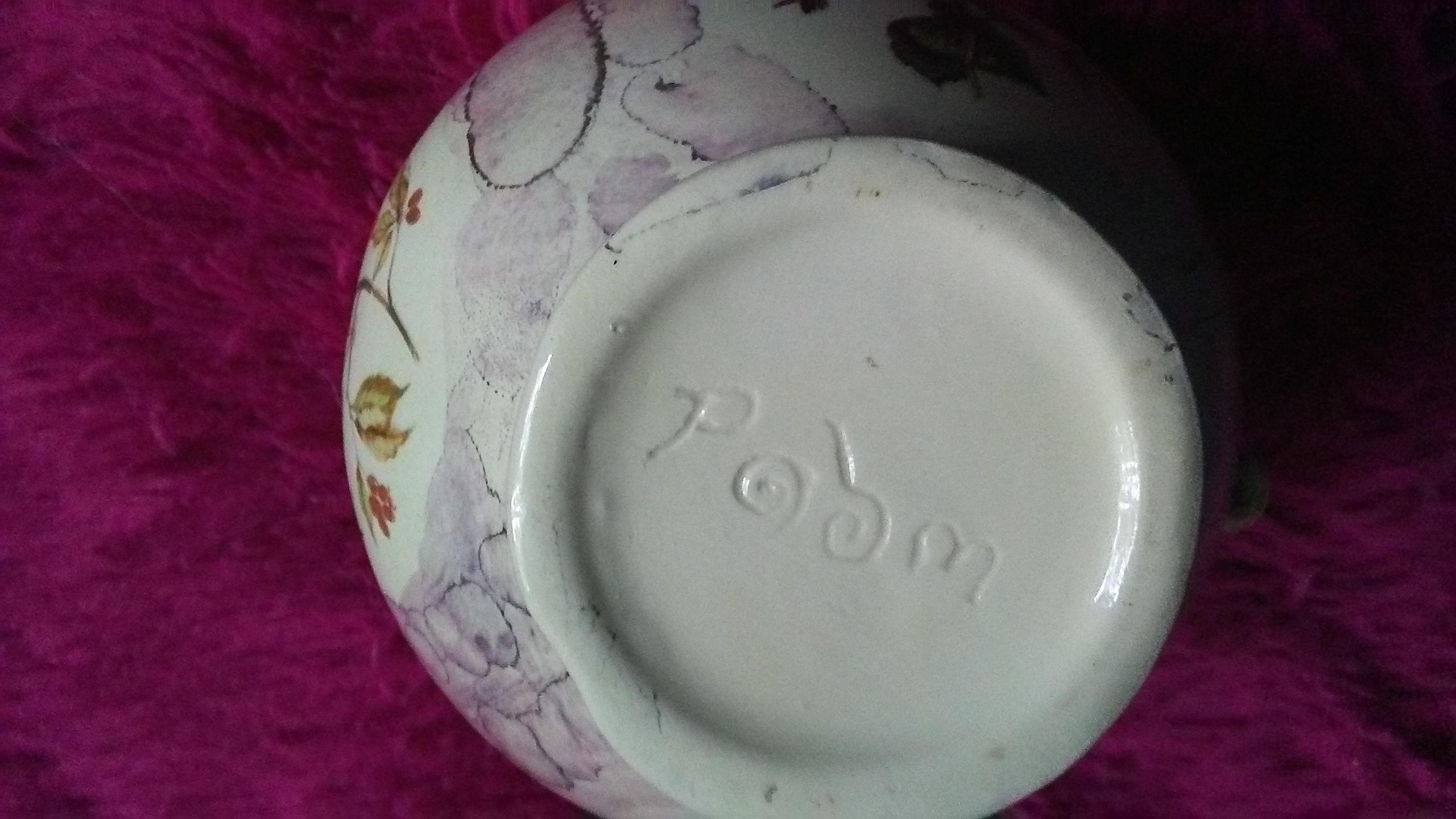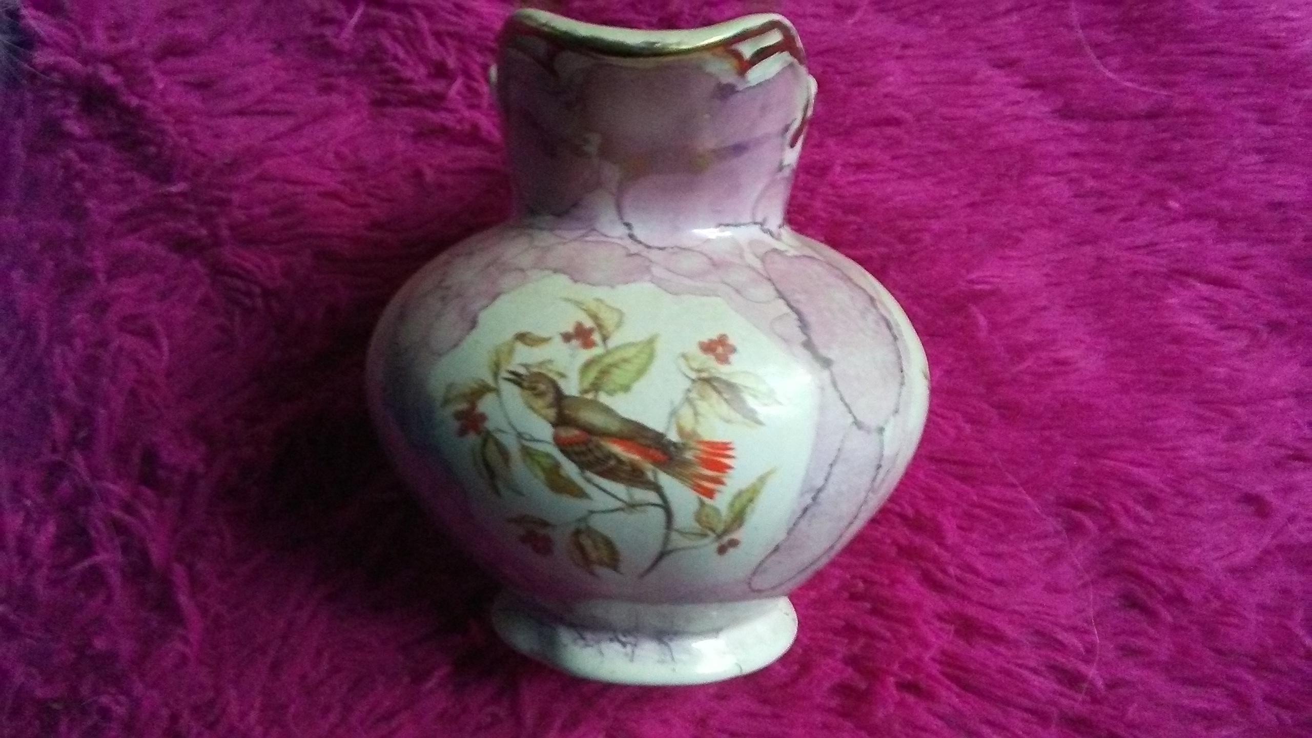 Purple, white with what appears to be some gold trim. It has hummingbirds, and other birds, as well as flowers. It is in excellent shape with no chips or cracks. I have spent countless hours trying to get the history as well as what it may be worth. But can't find anything about it.