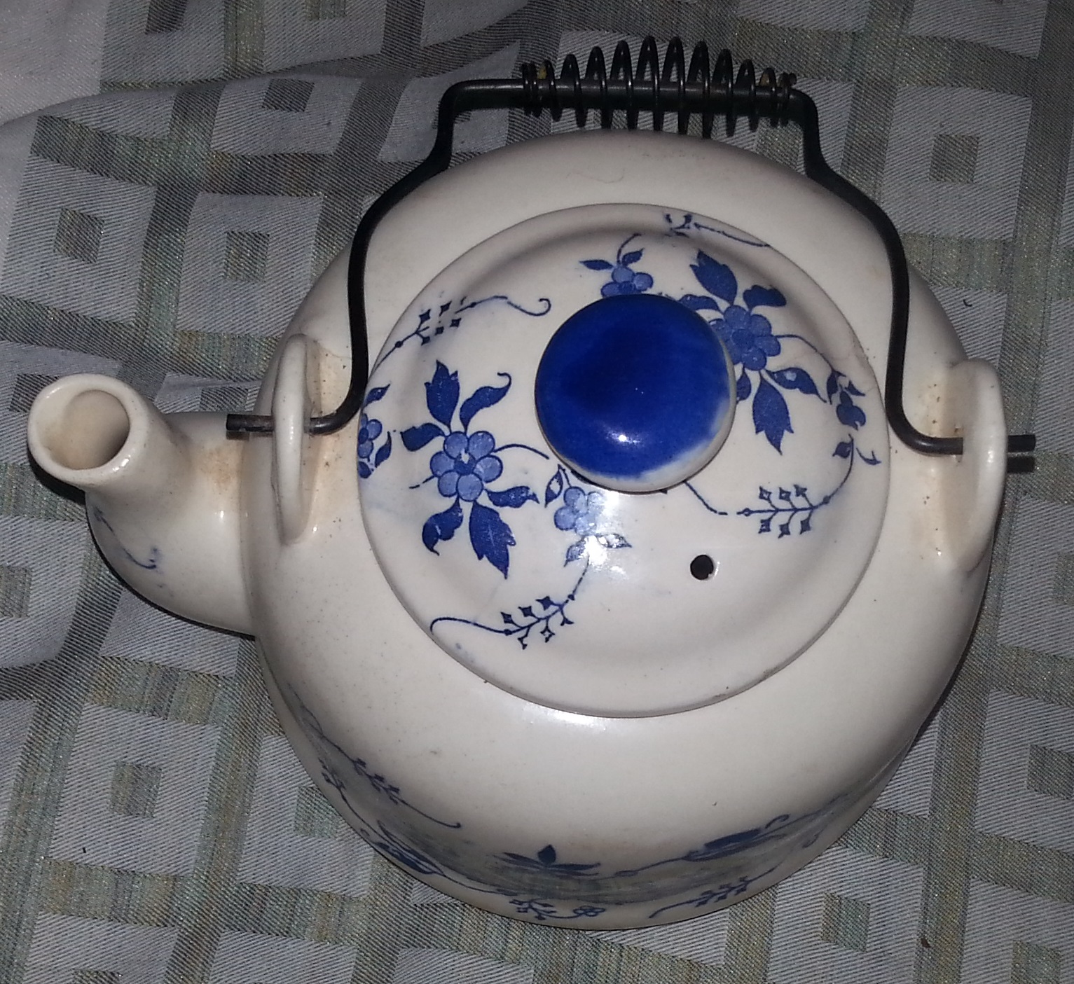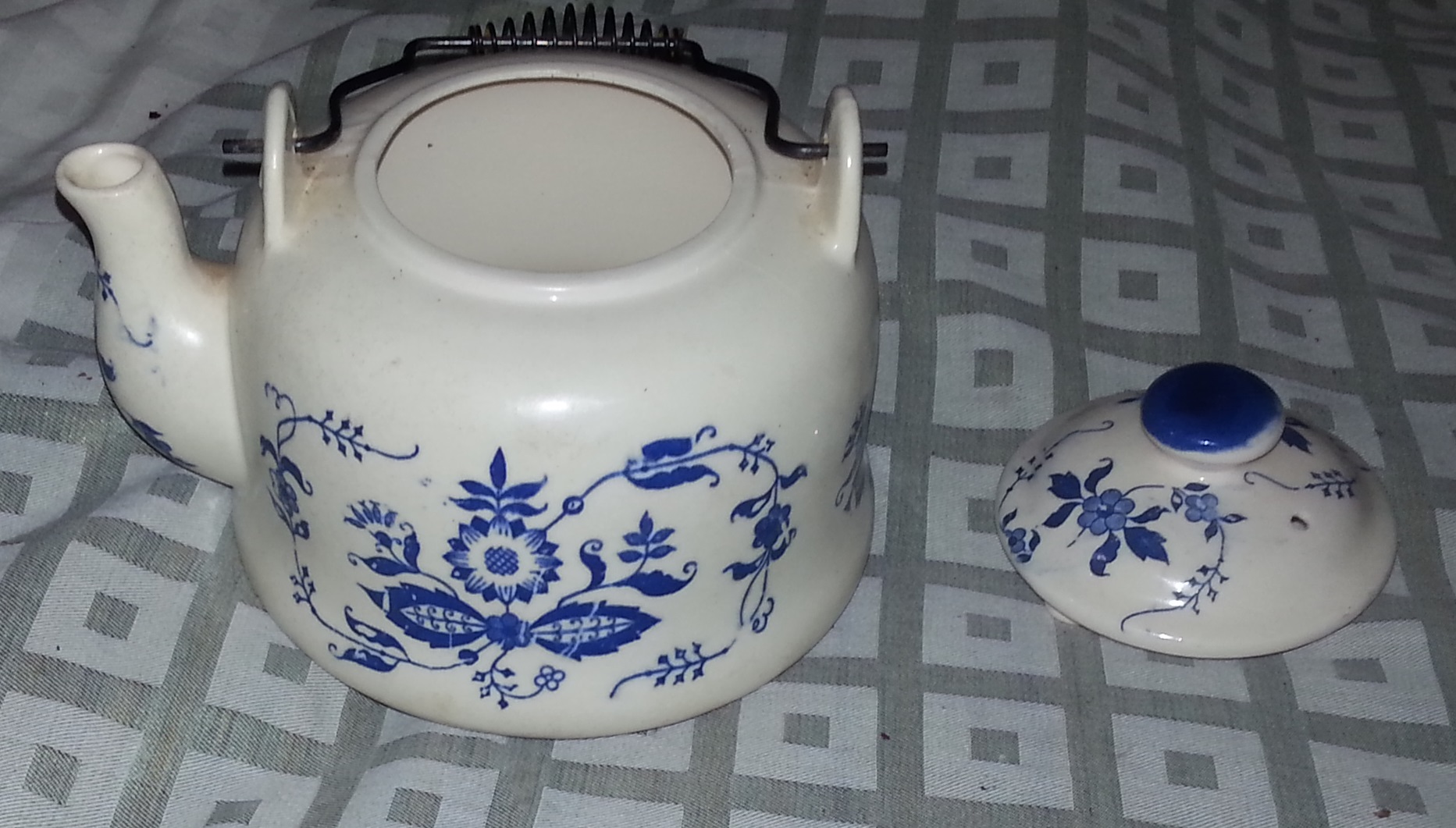 Tea pot with what I've been told is the Blue Onion design. Only has the Japan marking on bottom. Design is blue flowers on lid and belly of the pot. Has metal handle but type of metal is unknown. Any information know would be of great help.